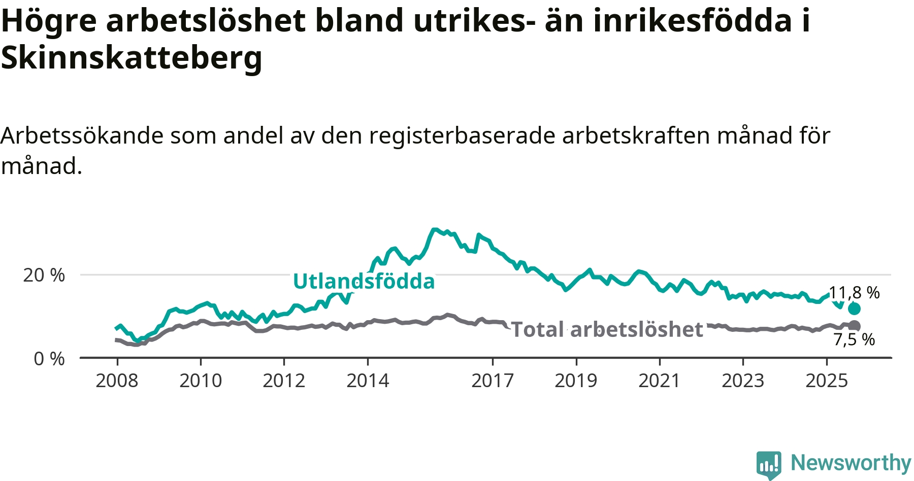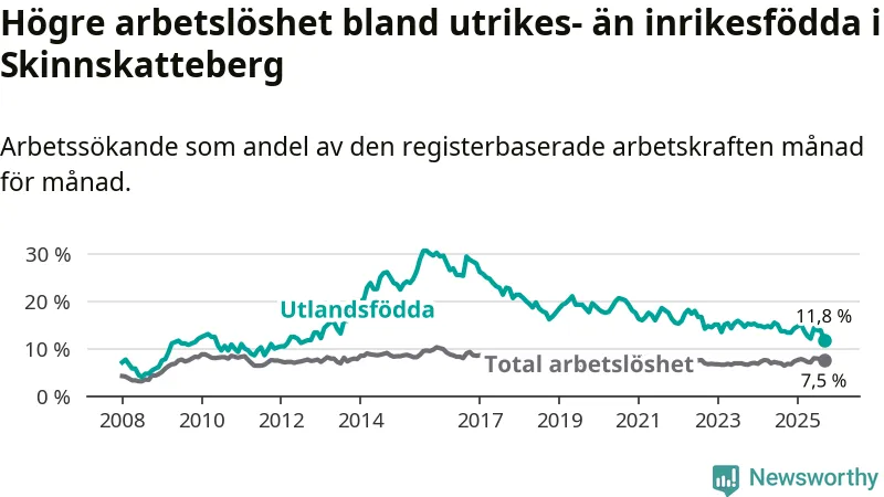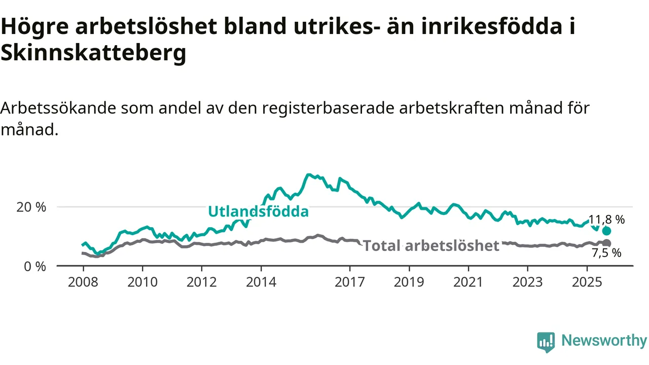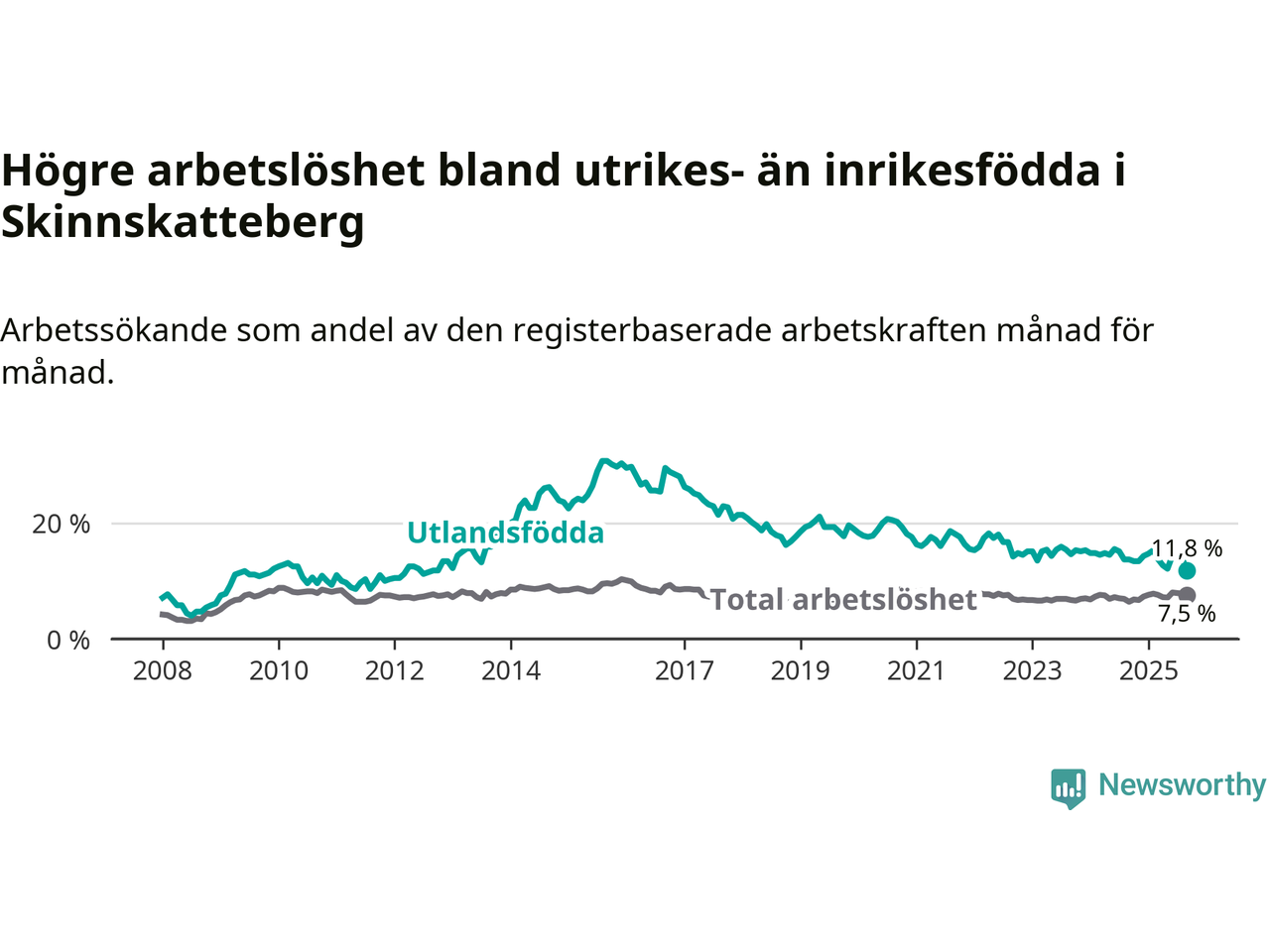 Skillnaden i arbetslöshet mellan utrikesfödda och hela befolkningen är 4,3 procentenheter i Skinnskatteberg. Det är en betydligt mindre skillnad än för ett år sedan (−3,0 procentenheter).
