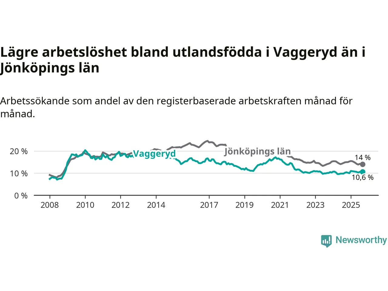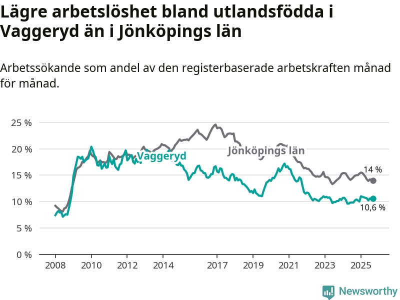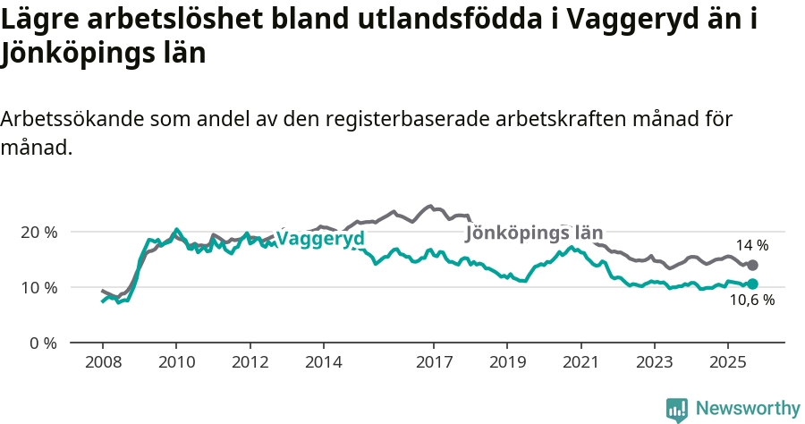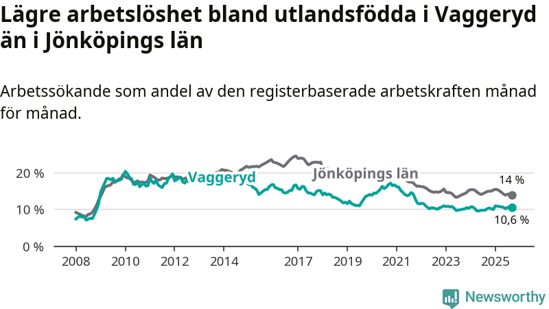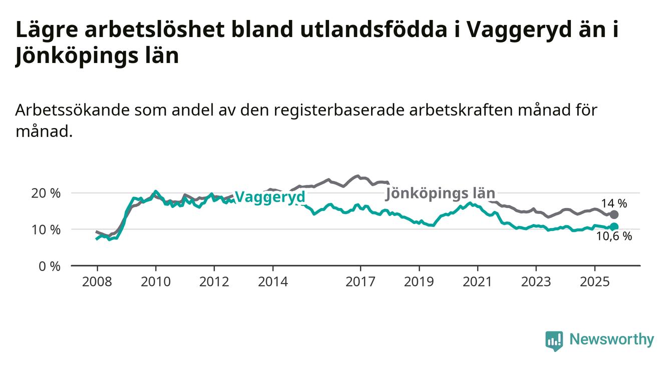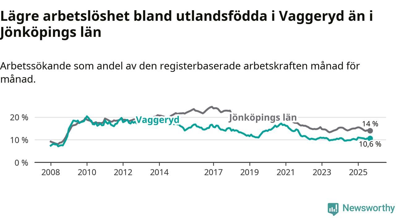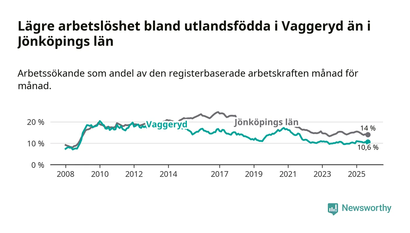 Medan arbetslösheten bland utlandsfödda alltså ökar i Vaggeryd så minskar den i Jönköpings län. Jämfört med september förra året har andelen arbetslösa utlandsfödda i länet minskat med 0,9 procentenheter (till 14,0 procent). Trots den senaste uppgången har Vaggeryd med andra ord fortfarande lägre arbetslöshet bland utlandsfödda än Jönköpings län.