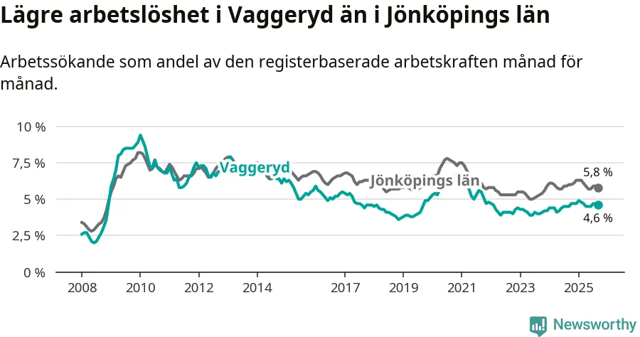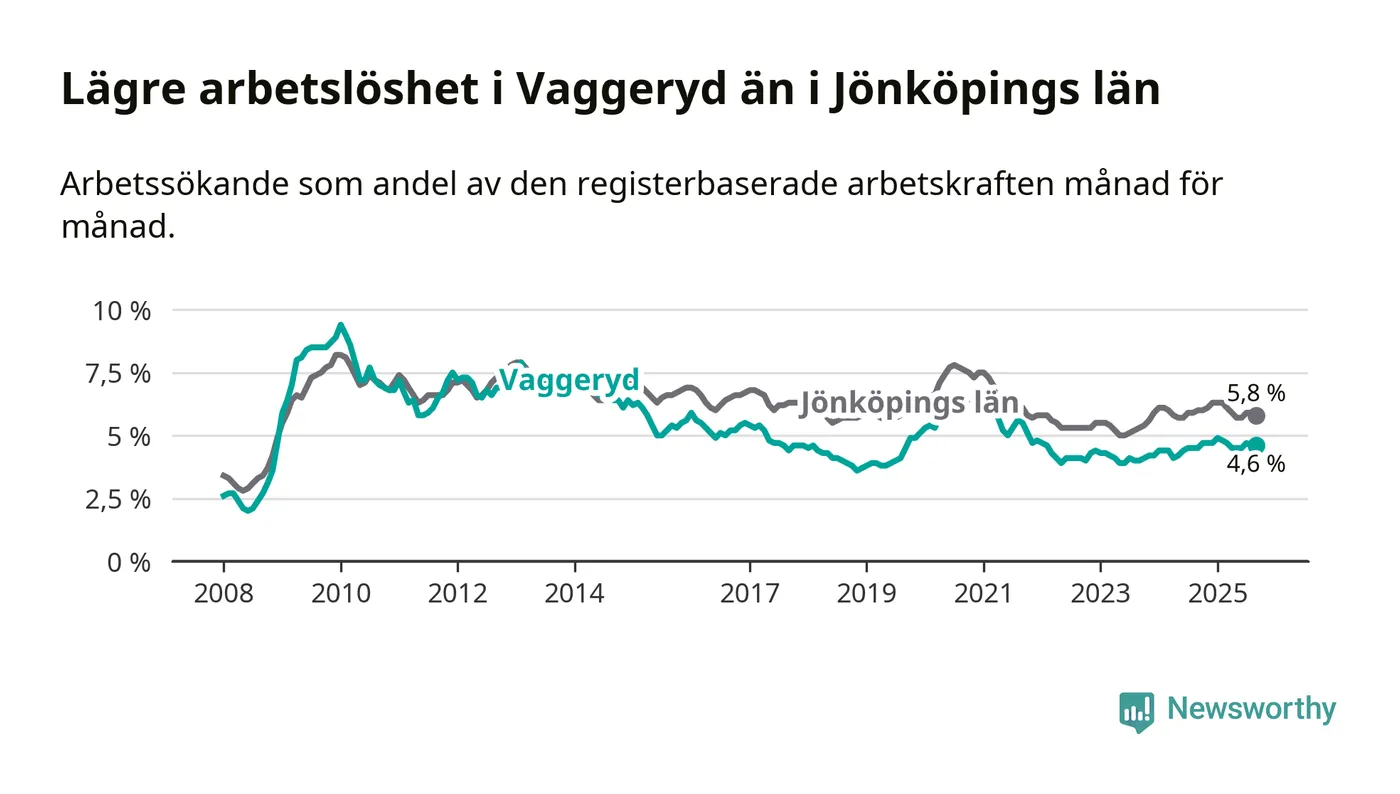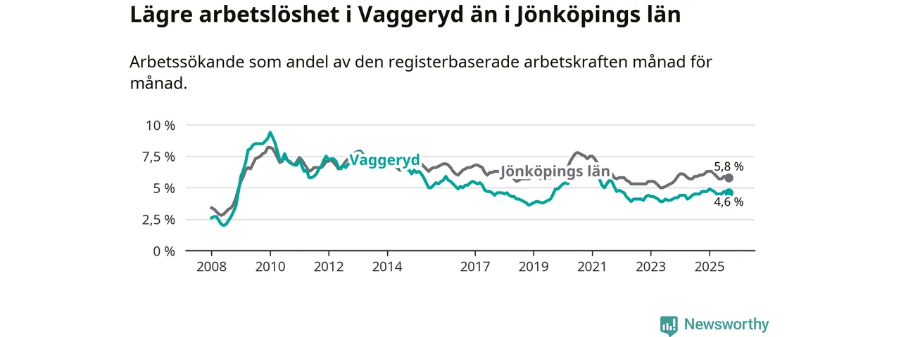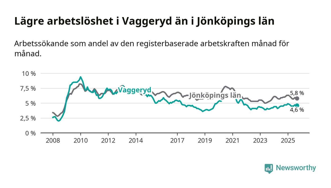 Under september månad rapporterade Vaggeryds kommun en total arbetslöshet på 4,6 procent. Det är en ökning jämfört med samma tidpunkt i fjol (+0,1 procentenheter). I Jönköpings län däremot sjunker arbetslösheten något.
