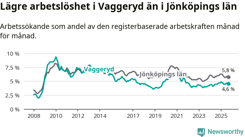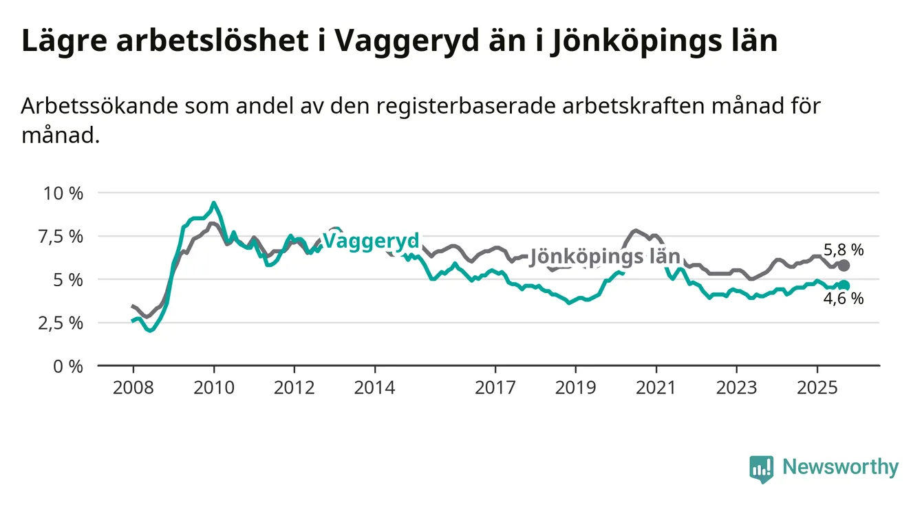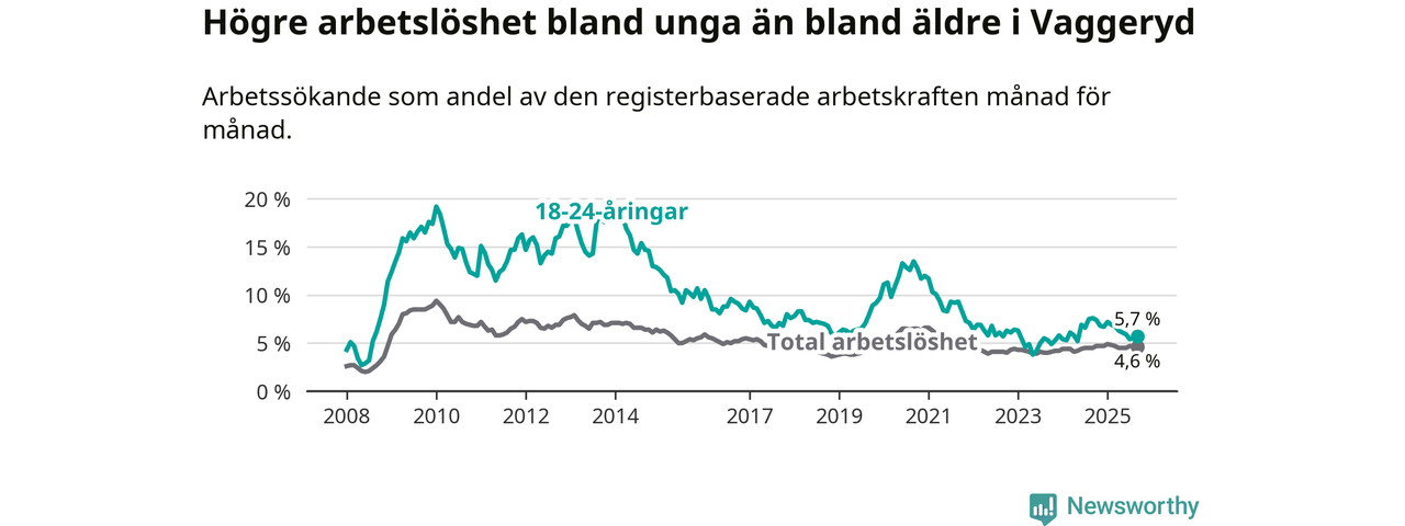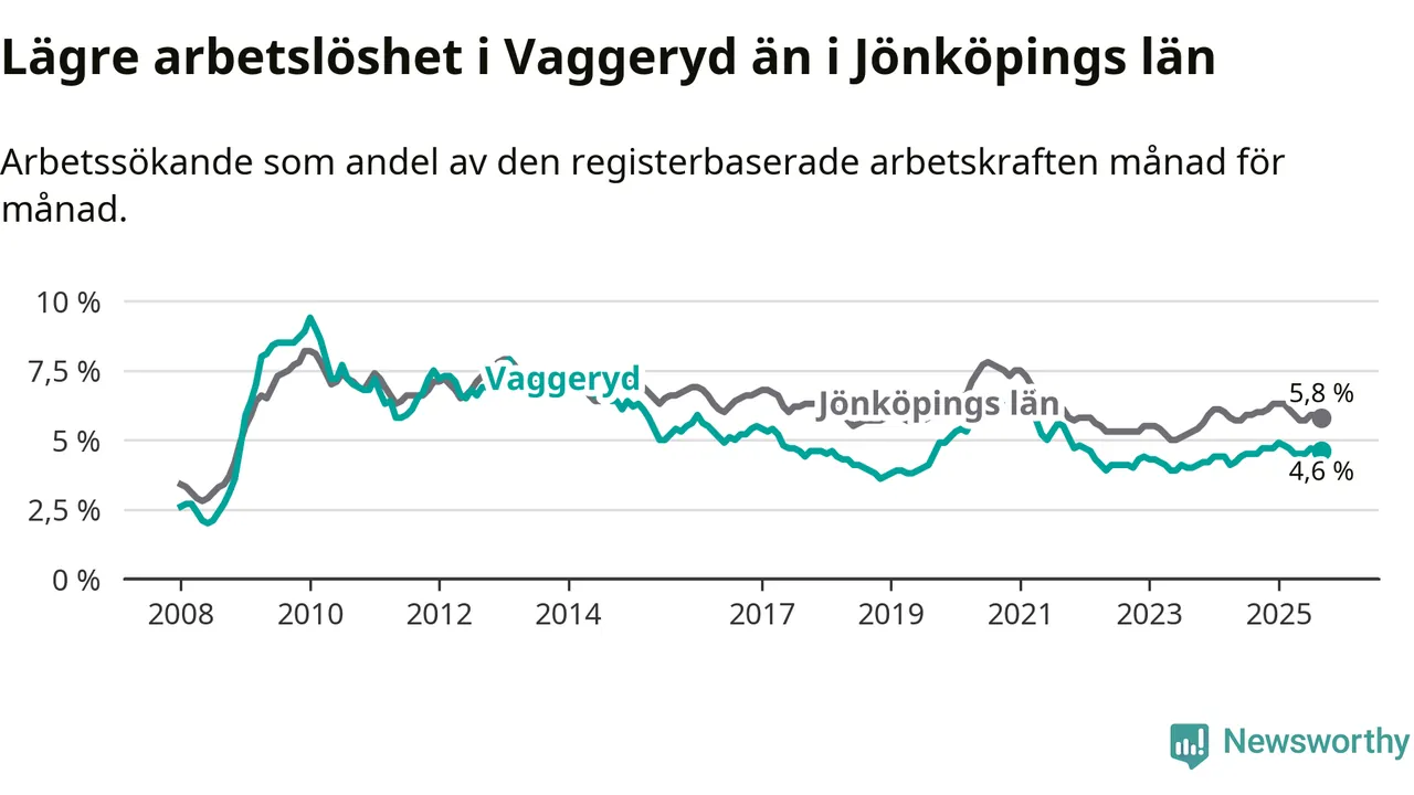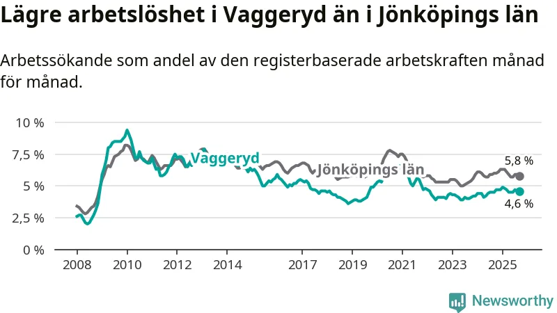 Under september månad rapporterade Vaggeryds kommun en total arbetslöshet på 4,6 procent. Det är en ökning jämfört med samma tidpunkt i fjol (+0,1 procentenheter). I Jönköpings län däremot sjunker arbetslösheten något.