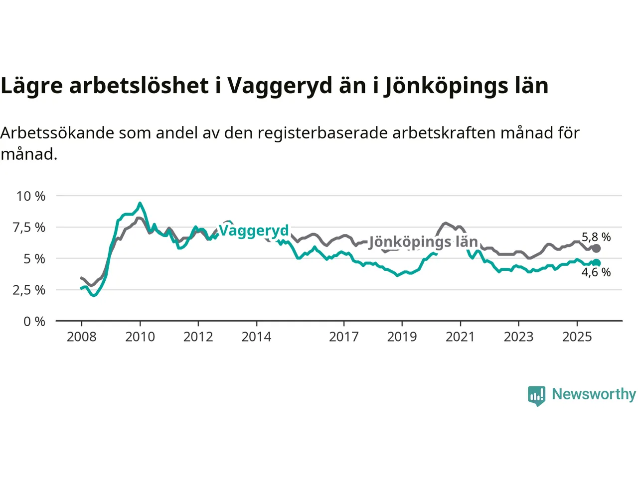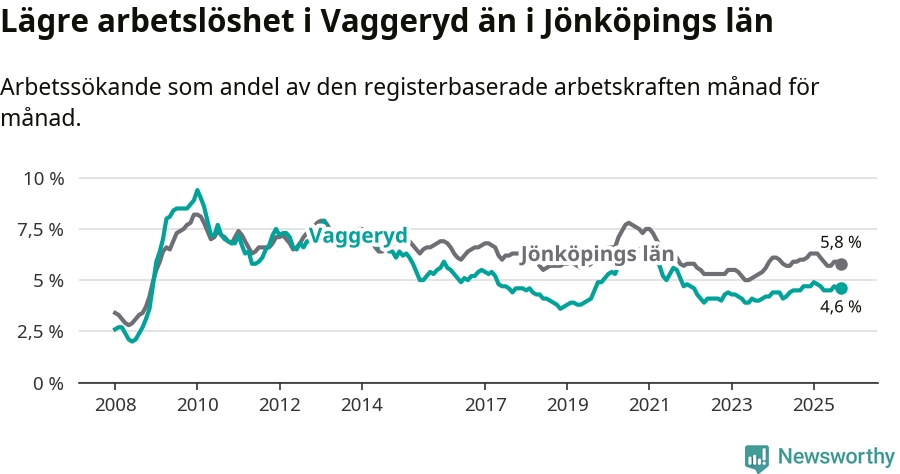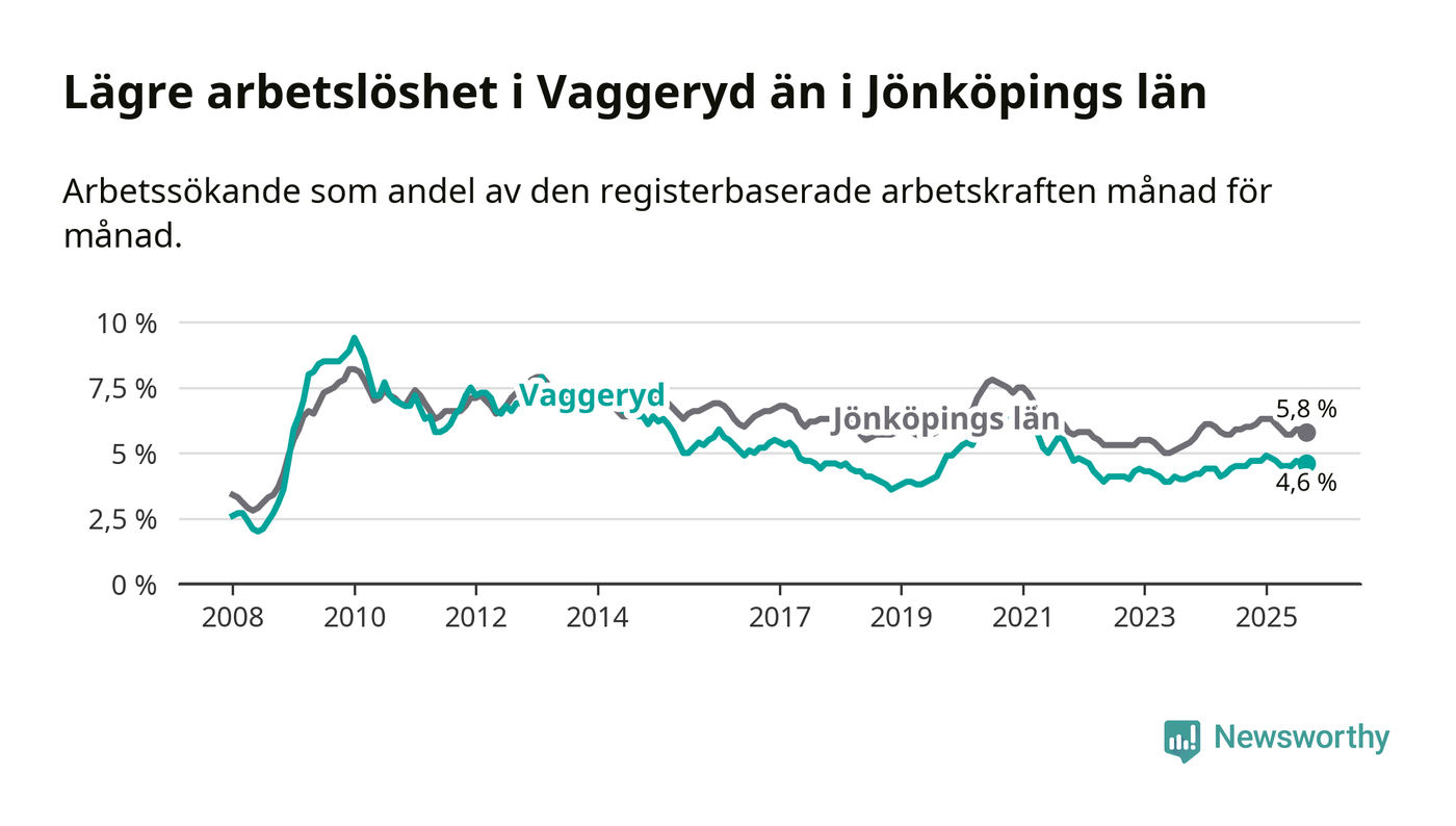 Även om arbetslösheten i Vaggeryd alltså ökar, så ligger den fortfarande under snittet i hela Jönköpings län (4,6 procent i kommunen, jämfört med 5,8 procent i hela länet). Habo har den lägsta arbetslösheten i länet (3,6 procent), medan Nässjö har den högsta (7,7 procent). För att Vaggeryd skulle komma ner i samma arbetslöshetsnivå som Habo skulle 75 personer behöva sysselsättas.