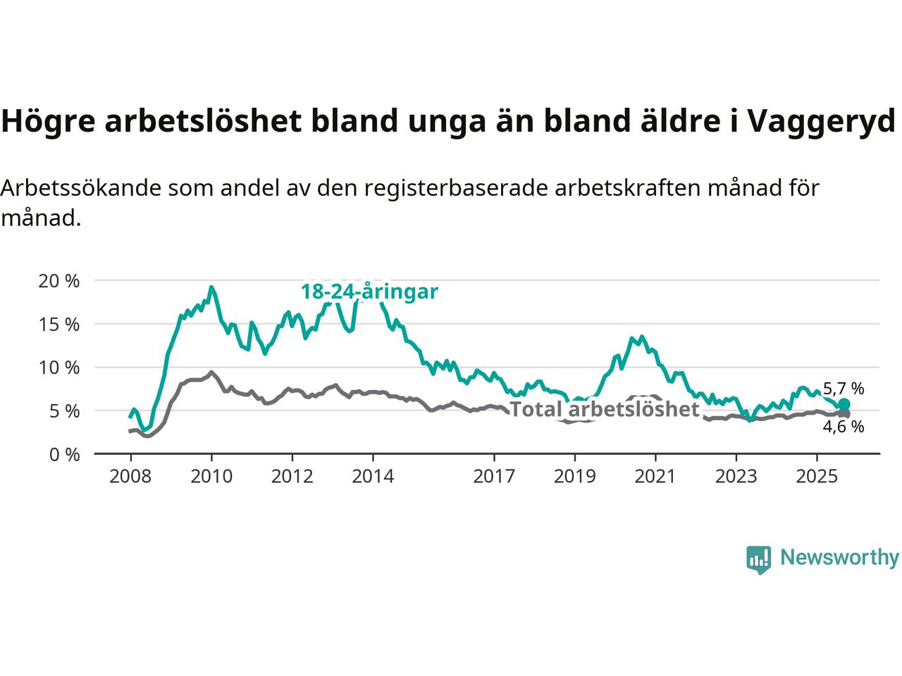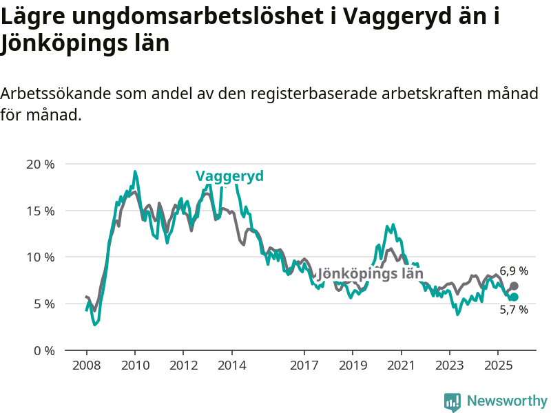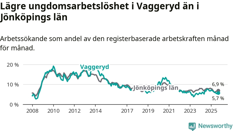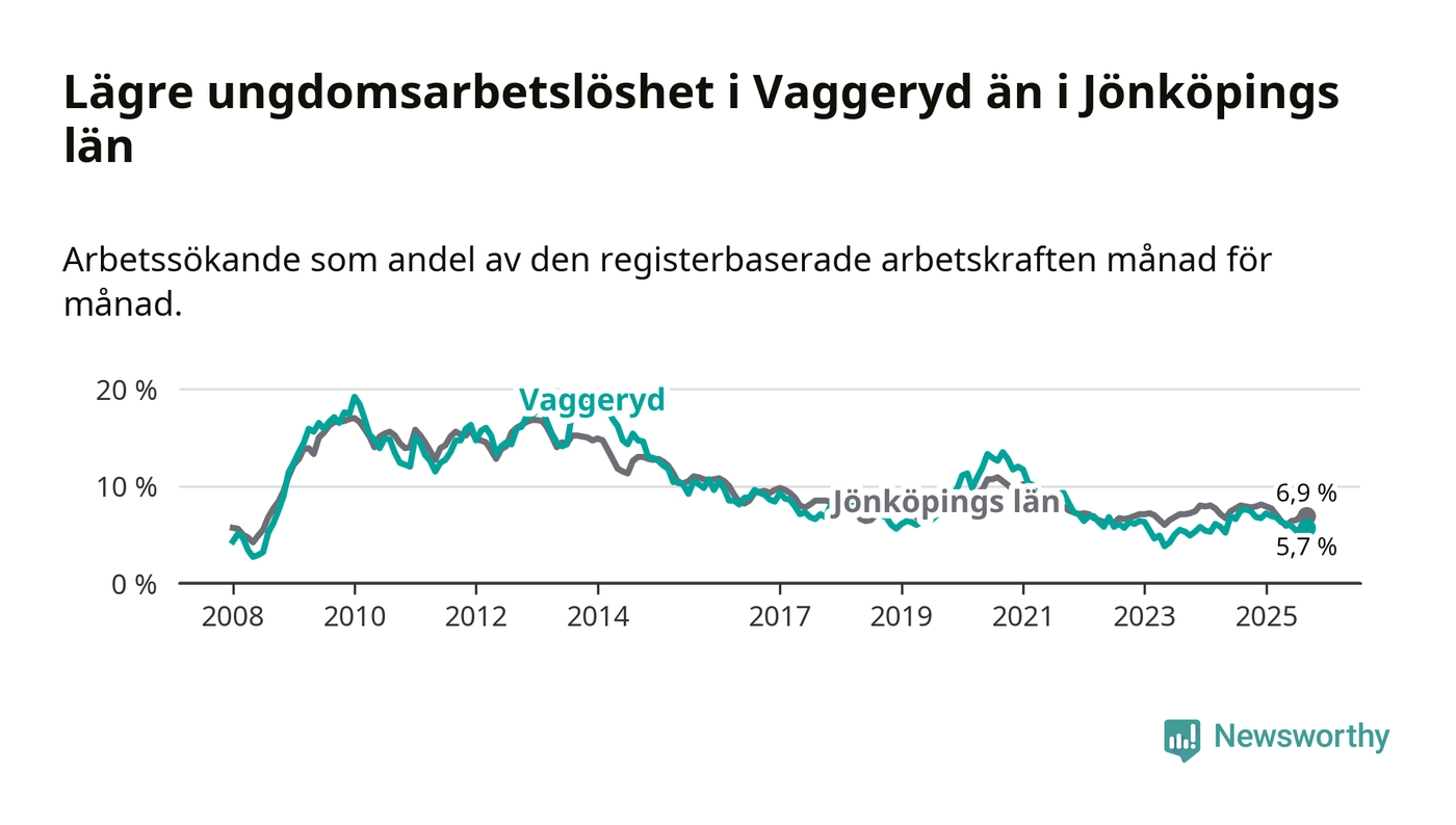 Precis som den totala arbetslösheten ligger ungdomsarbetslösheten i Vaggeryd lägre än i Jönköpings län som helhet. Skillnaden mellan kommunen och länet är 1,2 procentenheter.