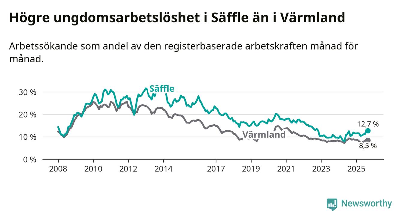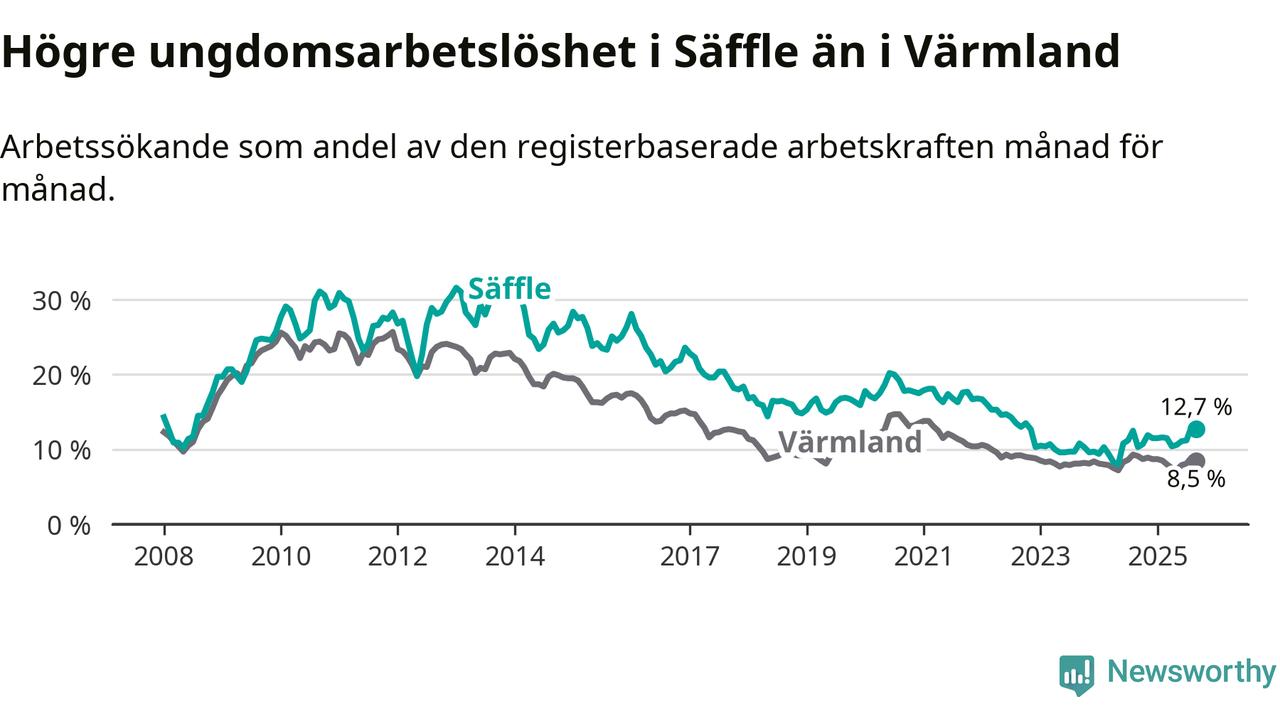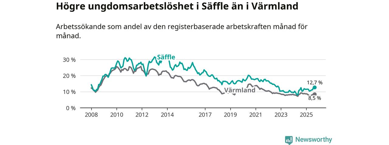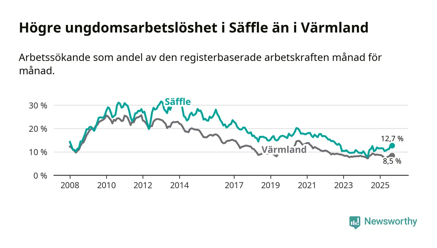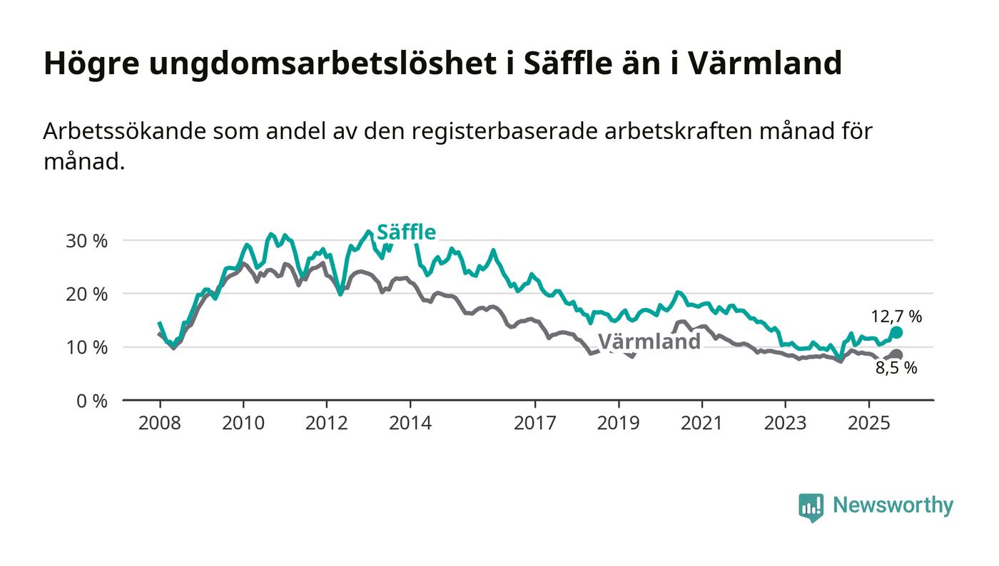 Precis som den totala arbetslösheten ligger ungdomsarbetslösheten i Säffle högre än i Värmland som helhet. Skillnaden mellan kommunen och länet är 4,2 procentenheter.