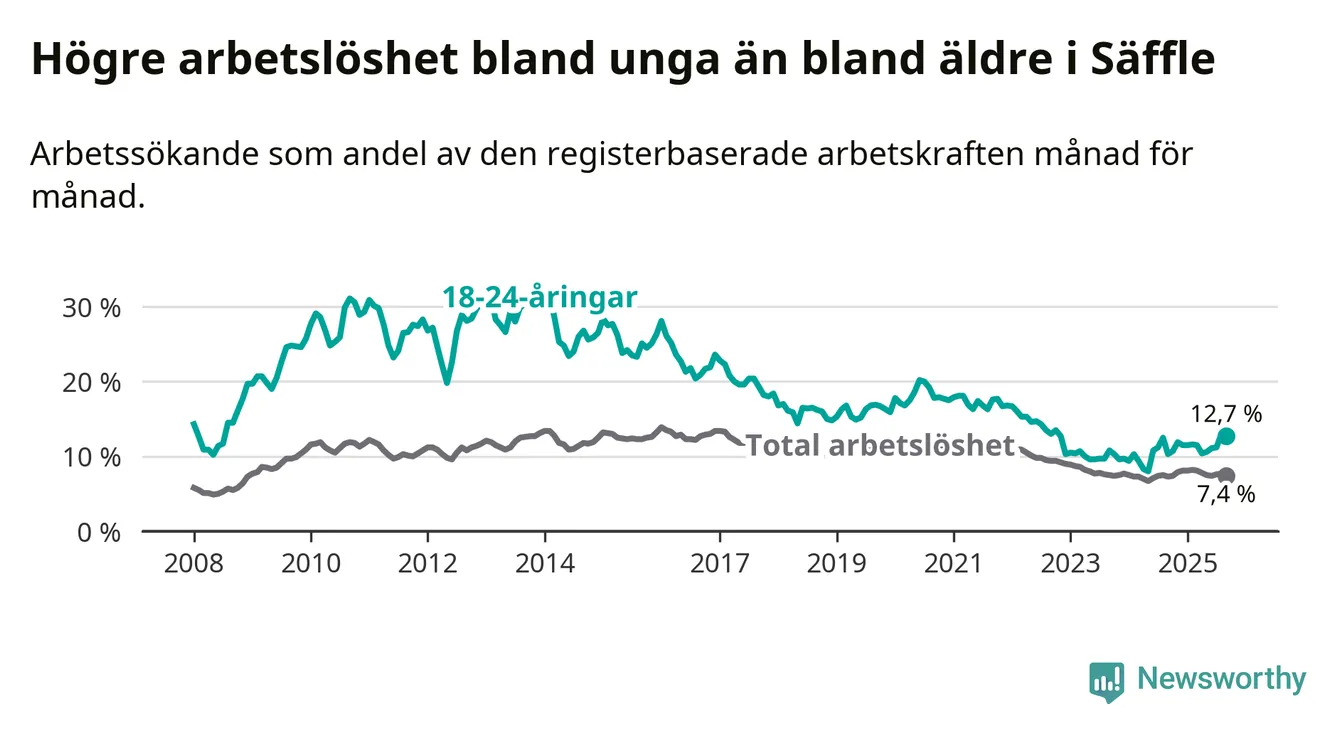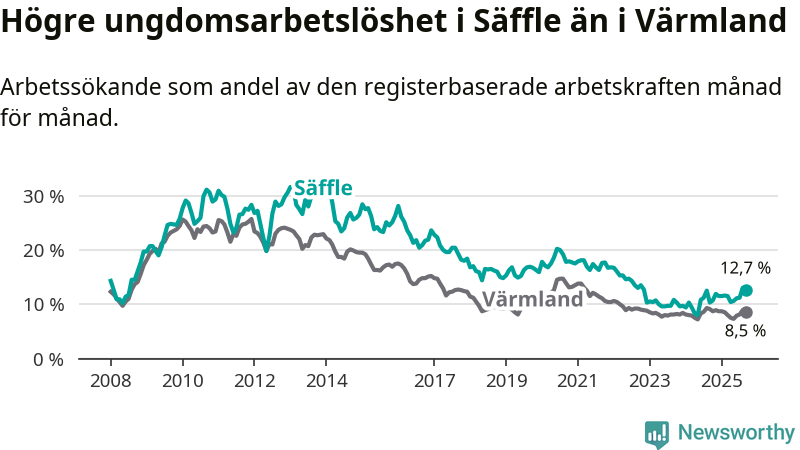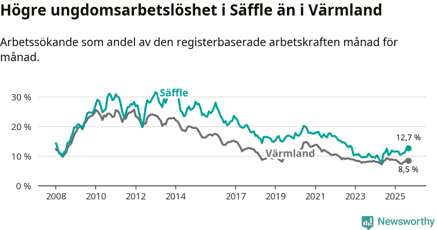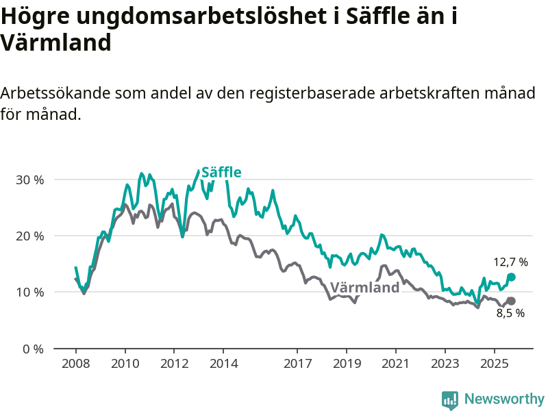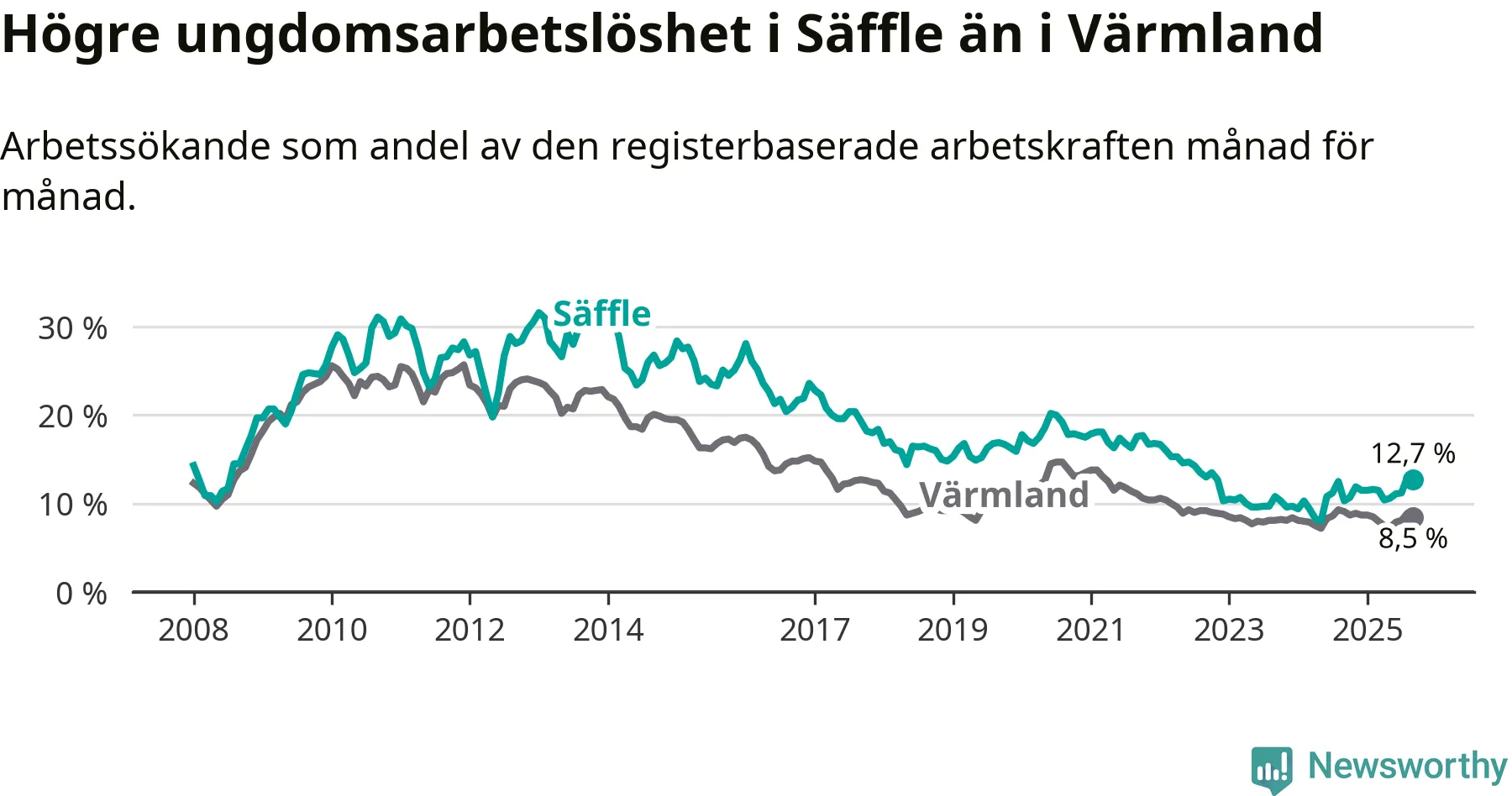 Precis som den totala arbetslösheten ligger ungdomsarbetslösheten i Säffle högre än i Värmland som helhet. Skillnaden mellan kommunen och länet är 4,2 procentenheter.