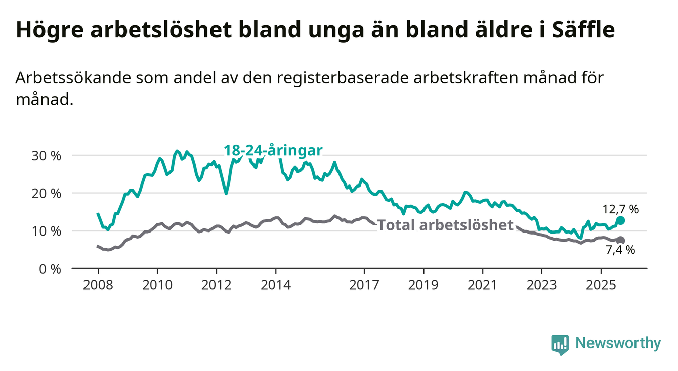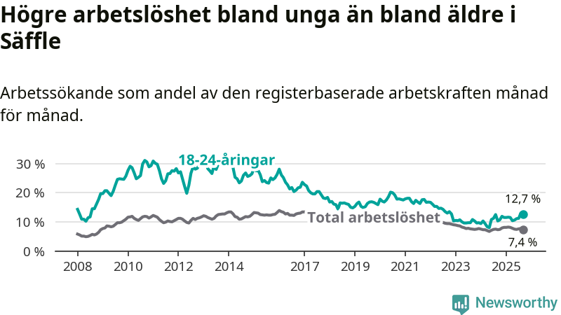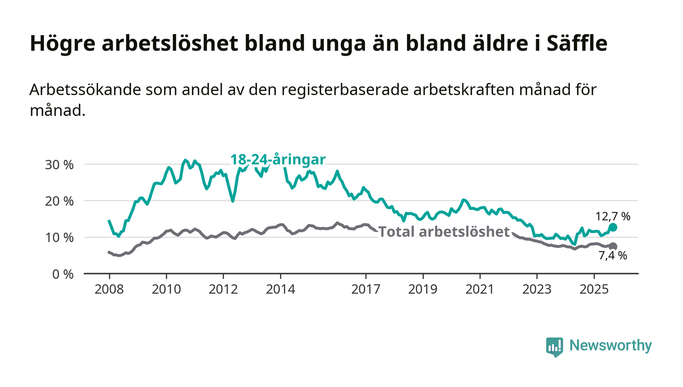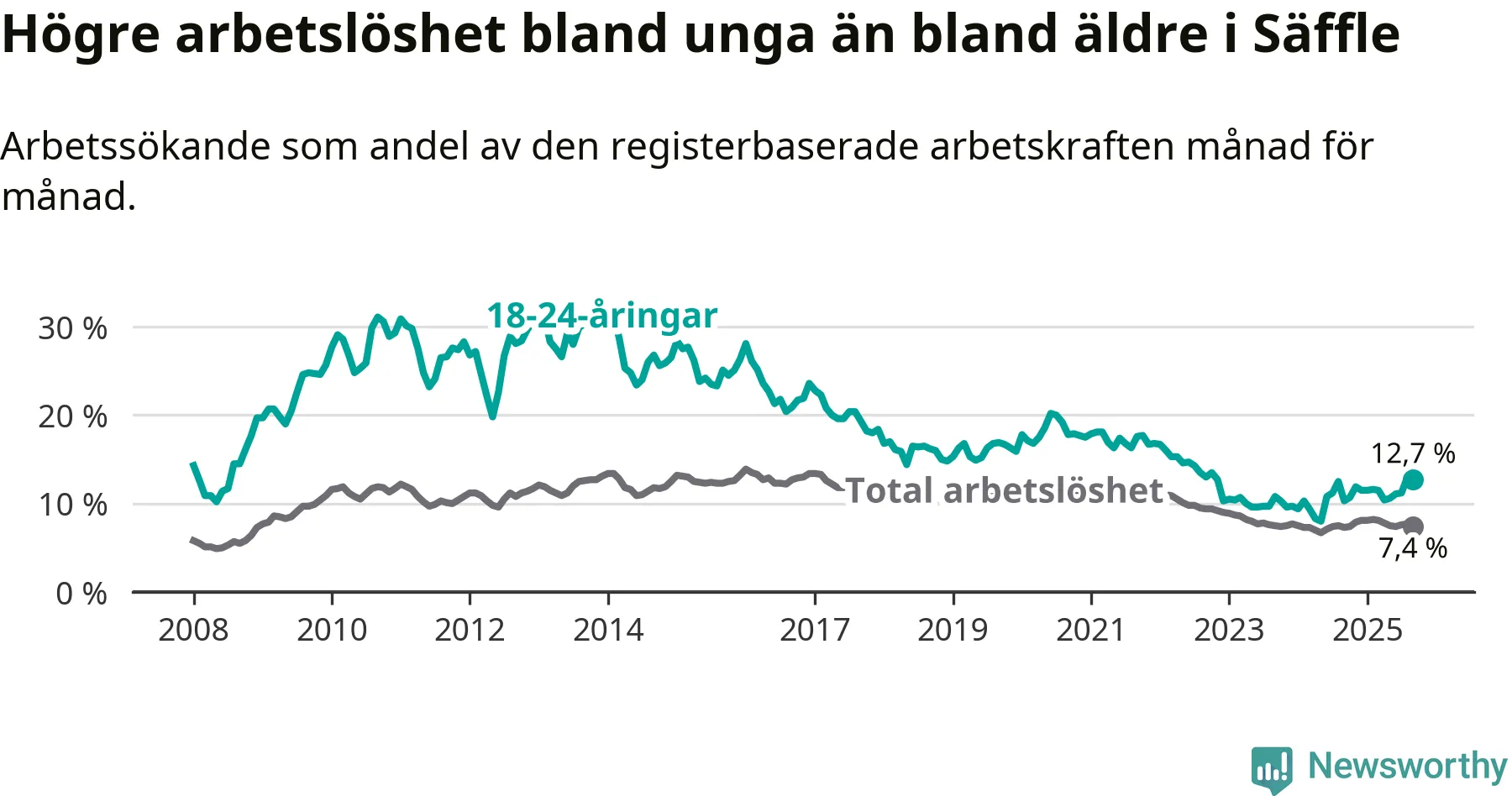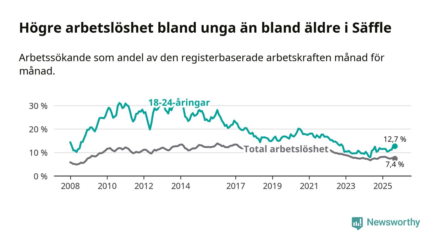 Precis som den totala arbetslösheten ligger ungdomsarbetslösheten i Säffle högre än i Värmland som helhet. Skillnaden mellan kommunen och länet är 4,2 procentenheter.