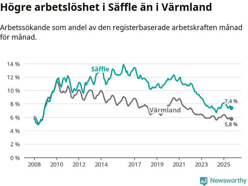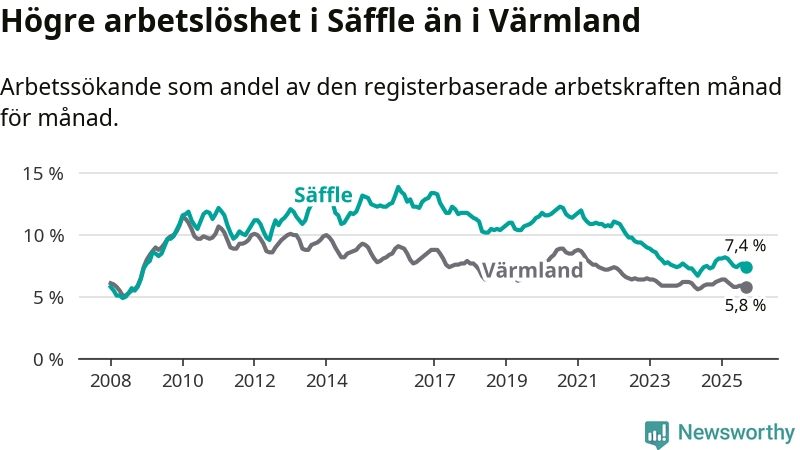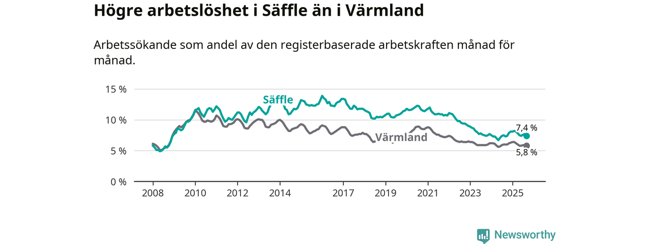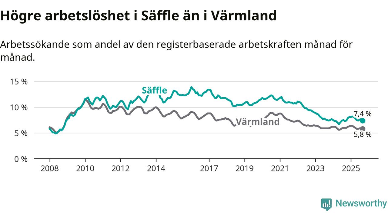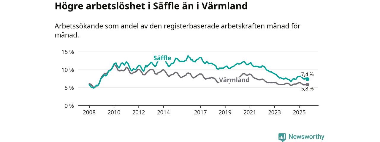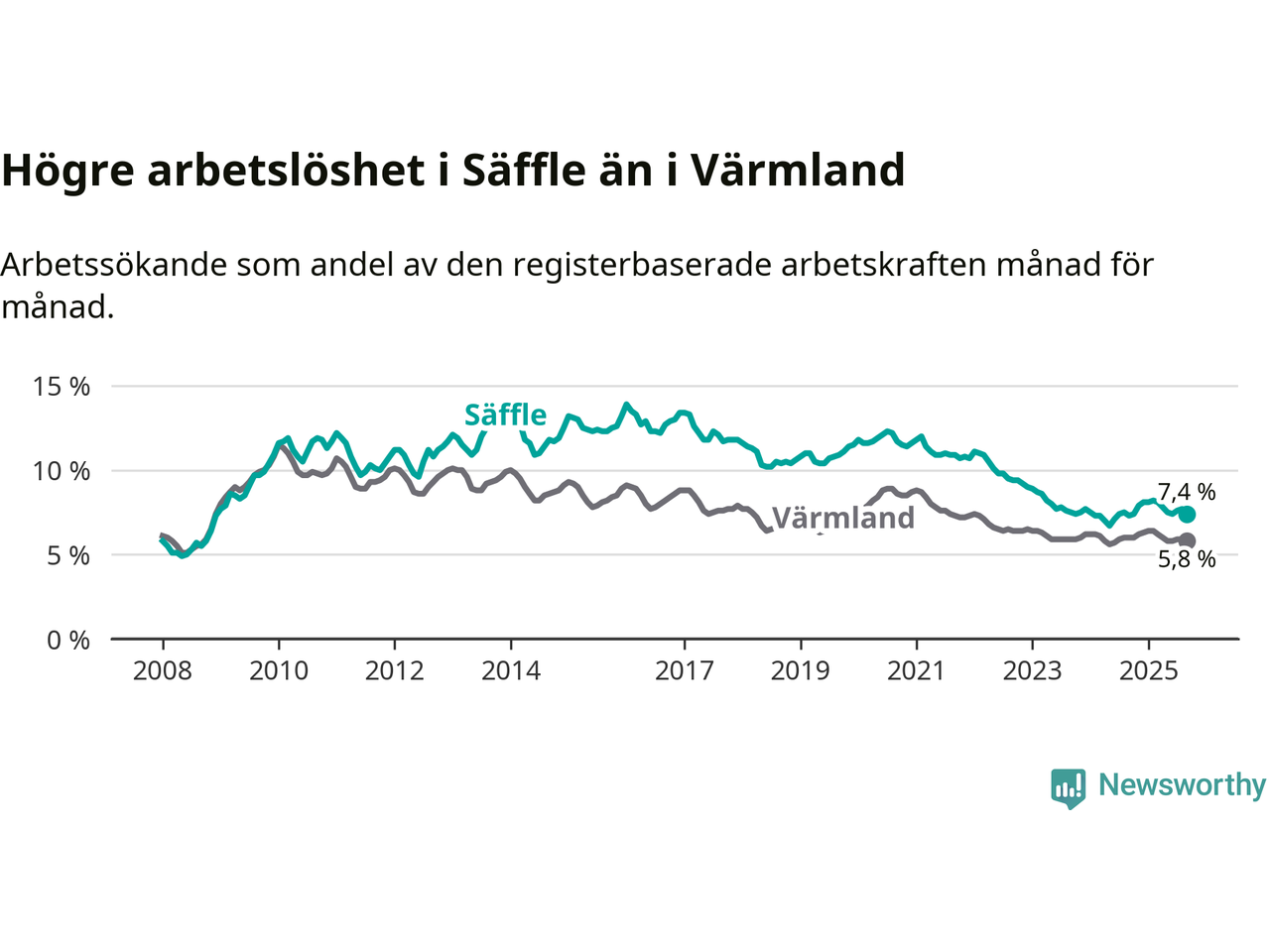Säffle hade redan tidigare högre arbetslöshet än snittet i hela Värmlands län och nu växer klyftan (7,4 procent i kommunen, jämfört med 5,8 procent i hela länet). Torsby har den lägsta arbetslösheten i länet (3,5 procent), medan Filipstad har den högsta (8,3 procent). För att Säffle skulle komma ner i samma arbetslöshetsnivå som Torsby skulle 252 personer behöva sysselsättas.