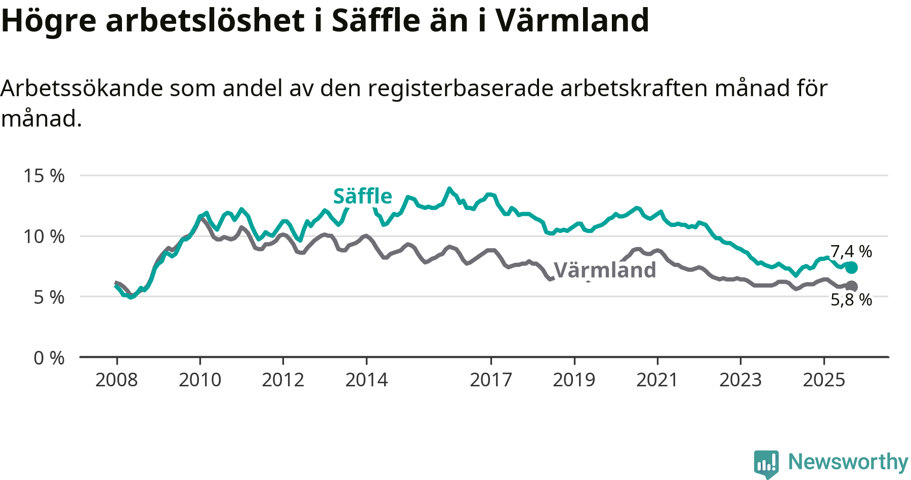 Under september månad rapporterade Säffle kommun en total arbetslöshet på 7,4 procent. Det är en ökning jämfört med samma tidpunkt i fjol (+0,1 procentenheter). I Värmlands län däremot sjunker arbetslösheten något.