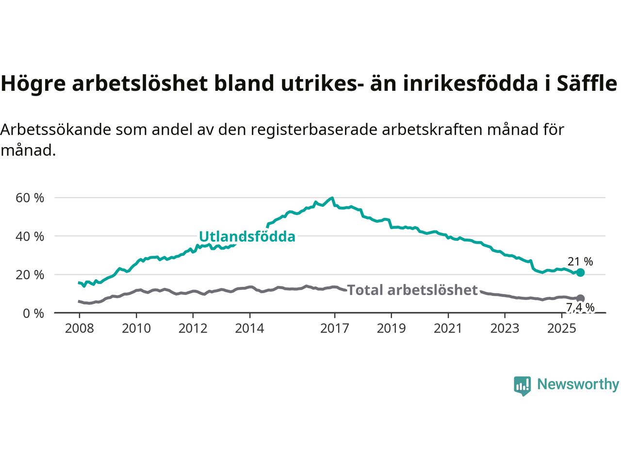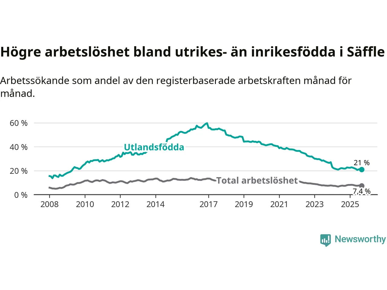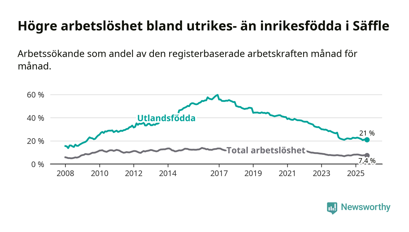 Skillnaden i arbetslöshet mellan utrikesfödda och hela befolkningen är 13,6 procentenheter i Säffle. Det är en mindre skillnad än för ett år sedan (−0,8 procentenheter).