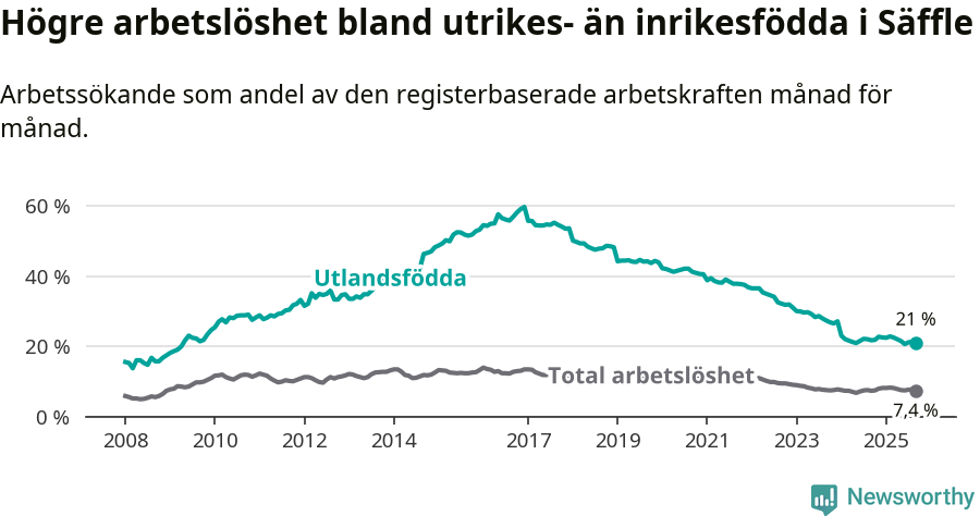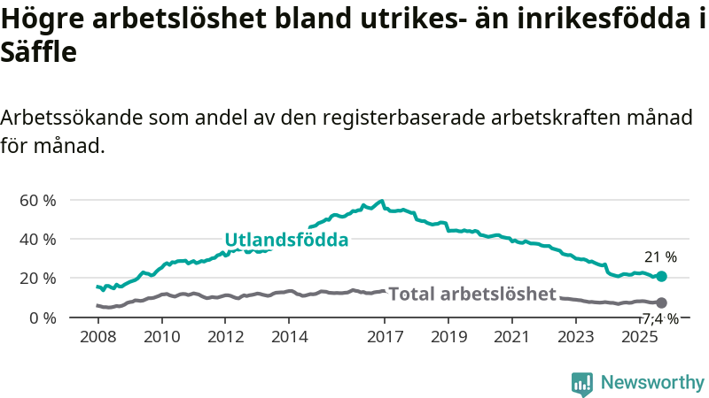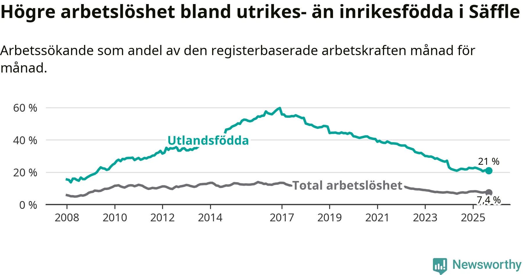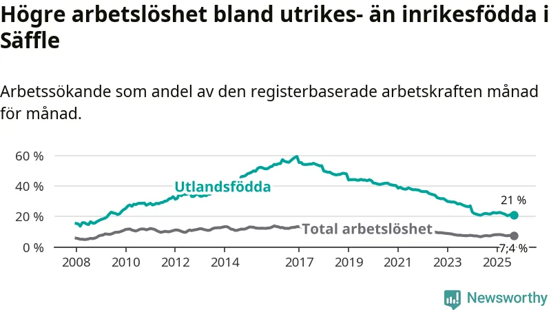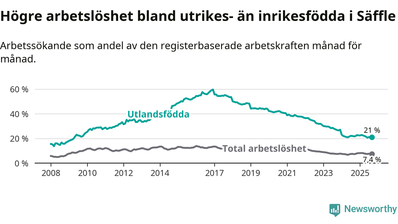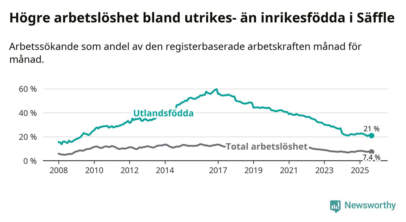 Skillnaden i arbetslöshet mellan utrikesfödda och hela befolkningen är 13,6 procentenheter i Säffle. Det är en mindre skillnad än för ett år sedan (−0,8 procentenheter).