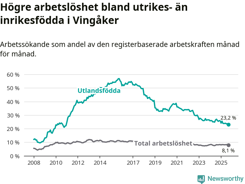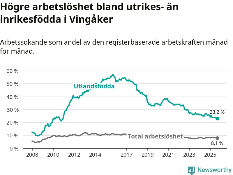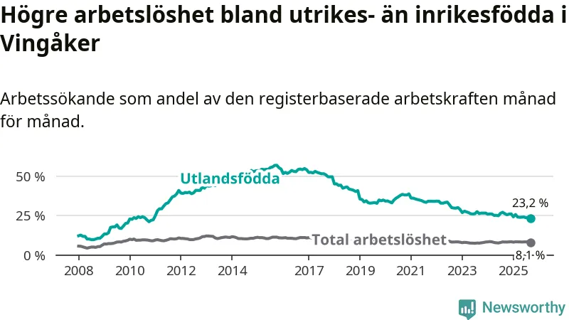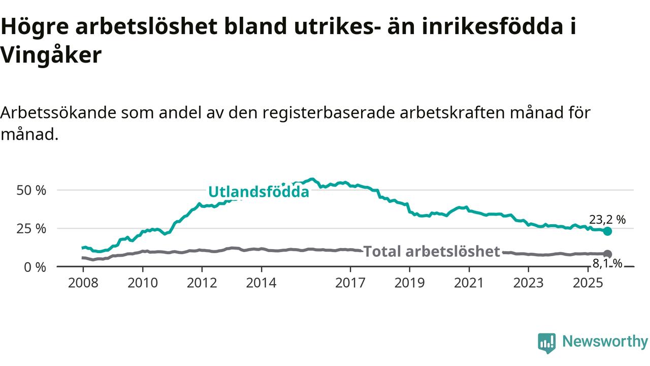 Arbetslösheten bland utlandsfödda var 23,2 procent i Vingåker under september månad, motsvarande 141 av 608 personer. Det är 3,0 procentenheter färre än vid samma tidpunkt i fjol (−22 om man räknar personer). Därmed är de utlandsföddas arbetslöshet lägre än vid samma tidpunkt i fjol för 14:e månaden i följd. Sedan juli 2024 har arbetslösheten bland utlandsfödda minskat från 26,5 till 23,2 procent. Den nuvarande arbetslöshetsnivån är den lägsta sedan december 2010.