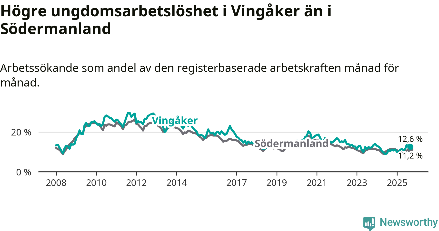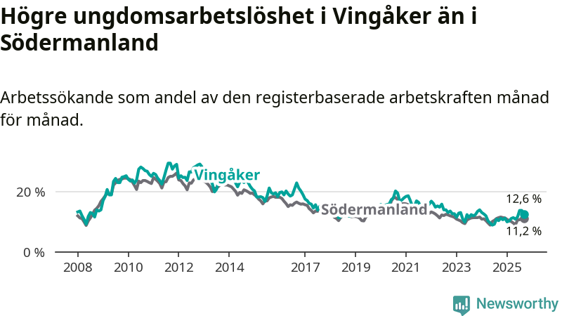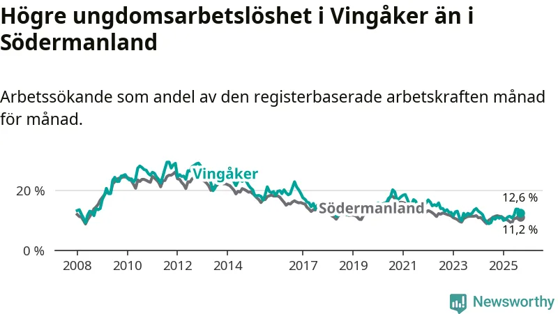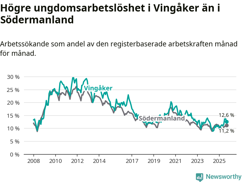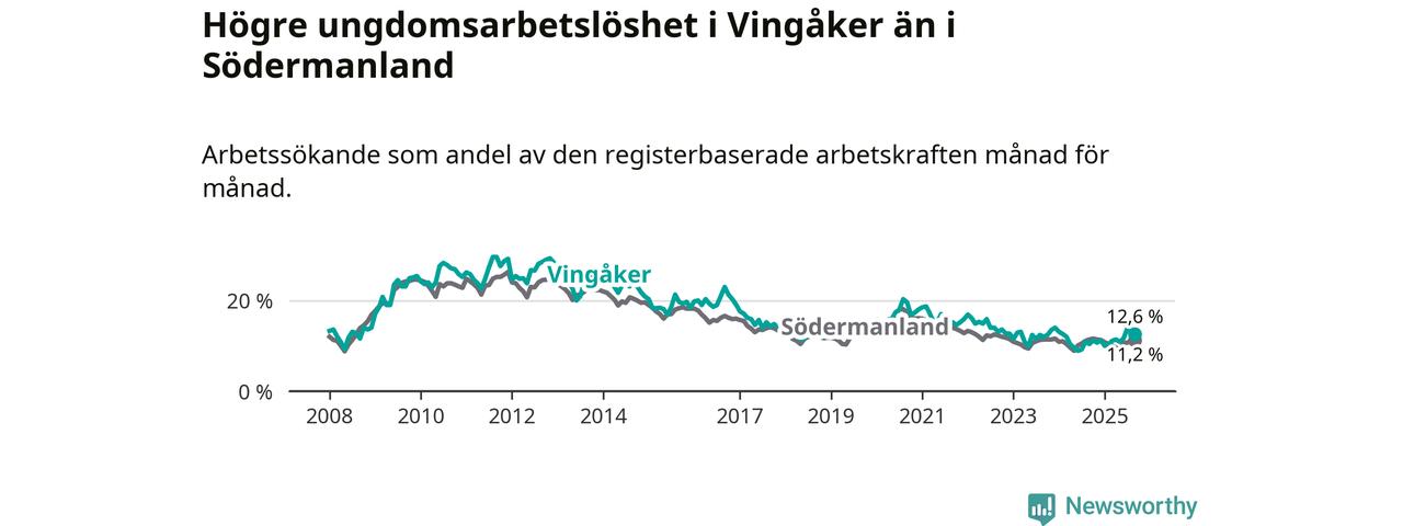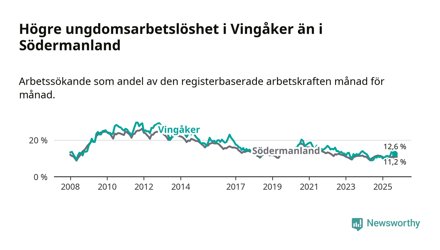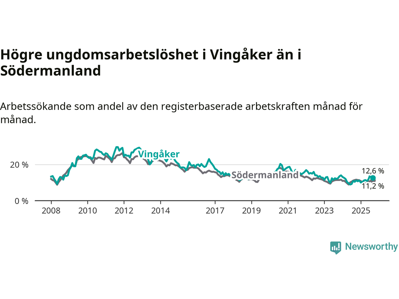 Medan Vingåker har lägre total arbetslöshet än Södermanland, ligger ungdomsarbetslösheten 1,4 procentenheter högre i Vingåker.
