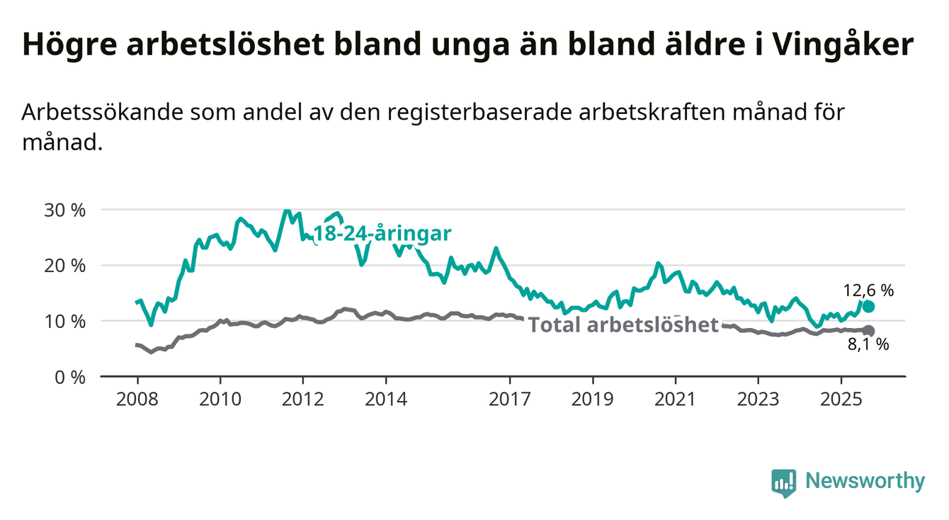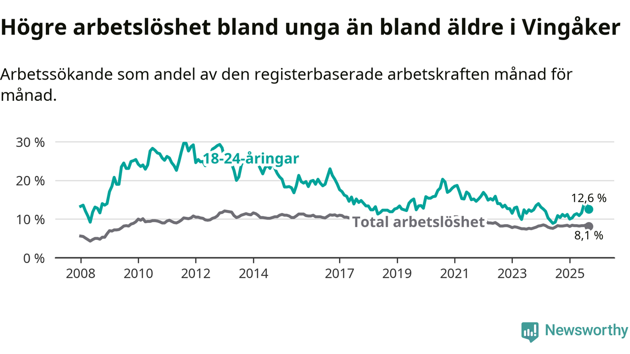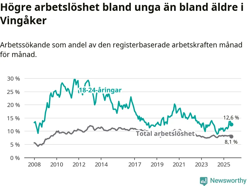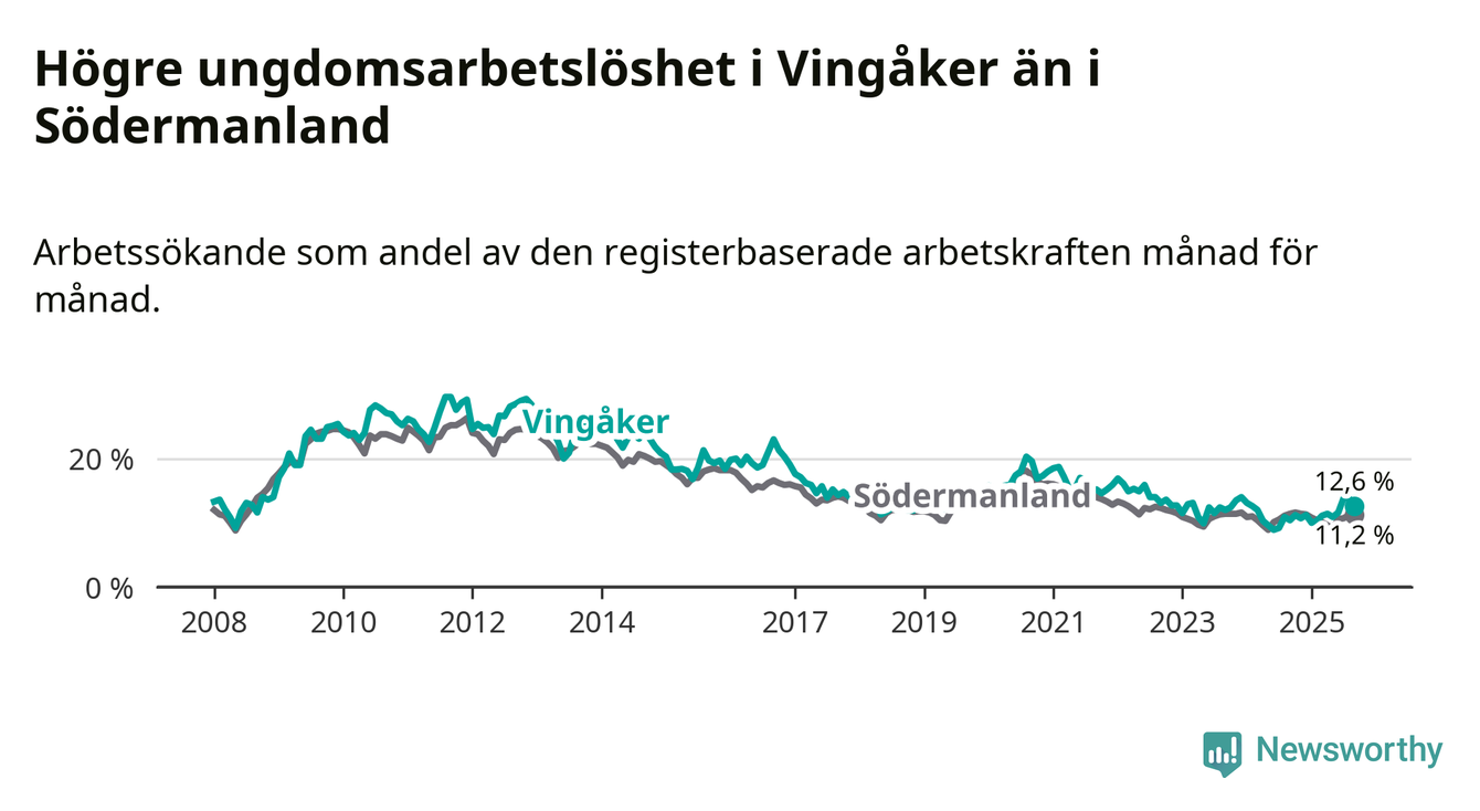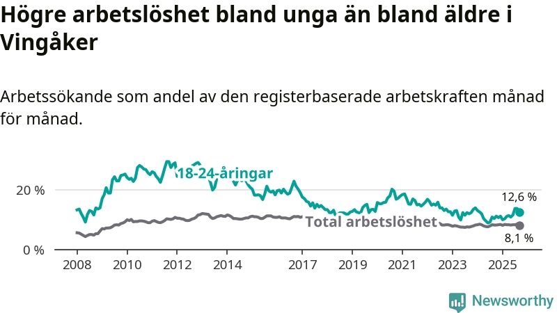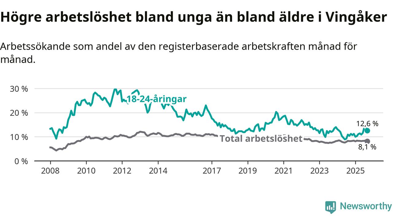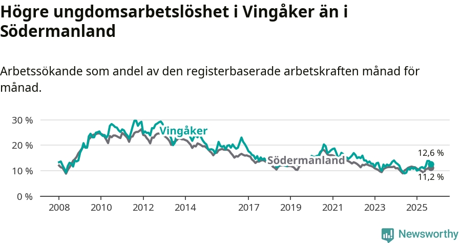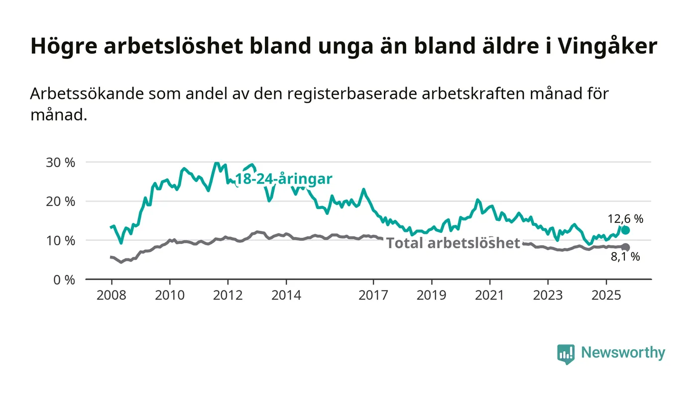 Medan Vingåker har lägre total arbetslöshet än Södermanland, ligger ungdomsarbetslösheten 1,4 procentenheter högre i Vingåker.