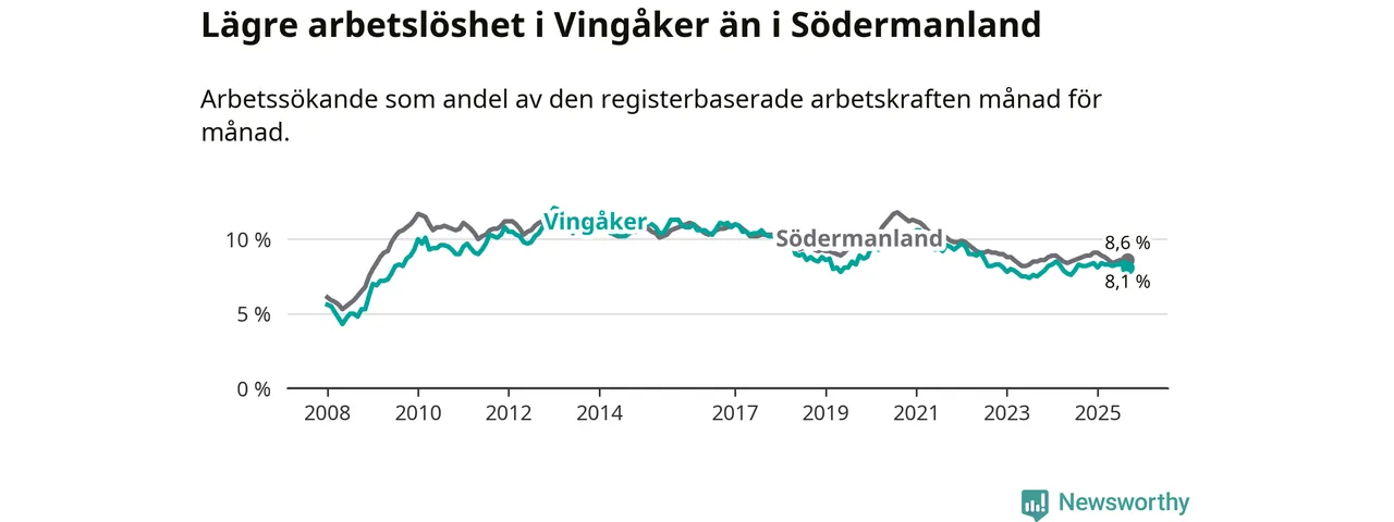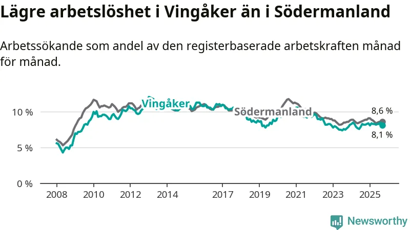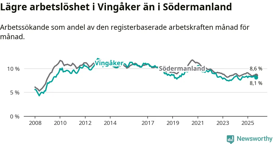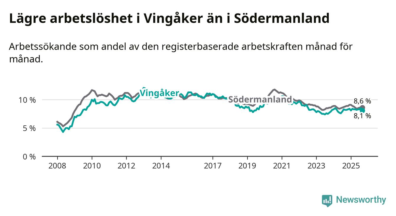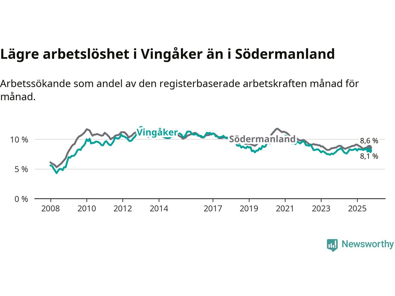 Under september månad rapporterade Vingåkers kommun en total arbetslöshet på 8,1 procent. Det är en minskning jämfört med samma tidpunkt i fjol (−0,1 procentenheter). Även i Södermanlands län sjunker arbetslösheten .