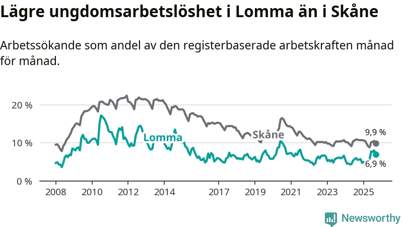 Precis som den totala arbetslösheten ligger ungdomsarbetslösheten i Lomma lägre än i Skåne som helhet. Skillnaden mellan kommunen och länet är 3,0 procentenheter.