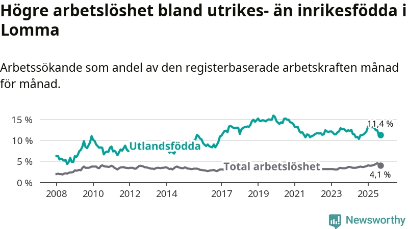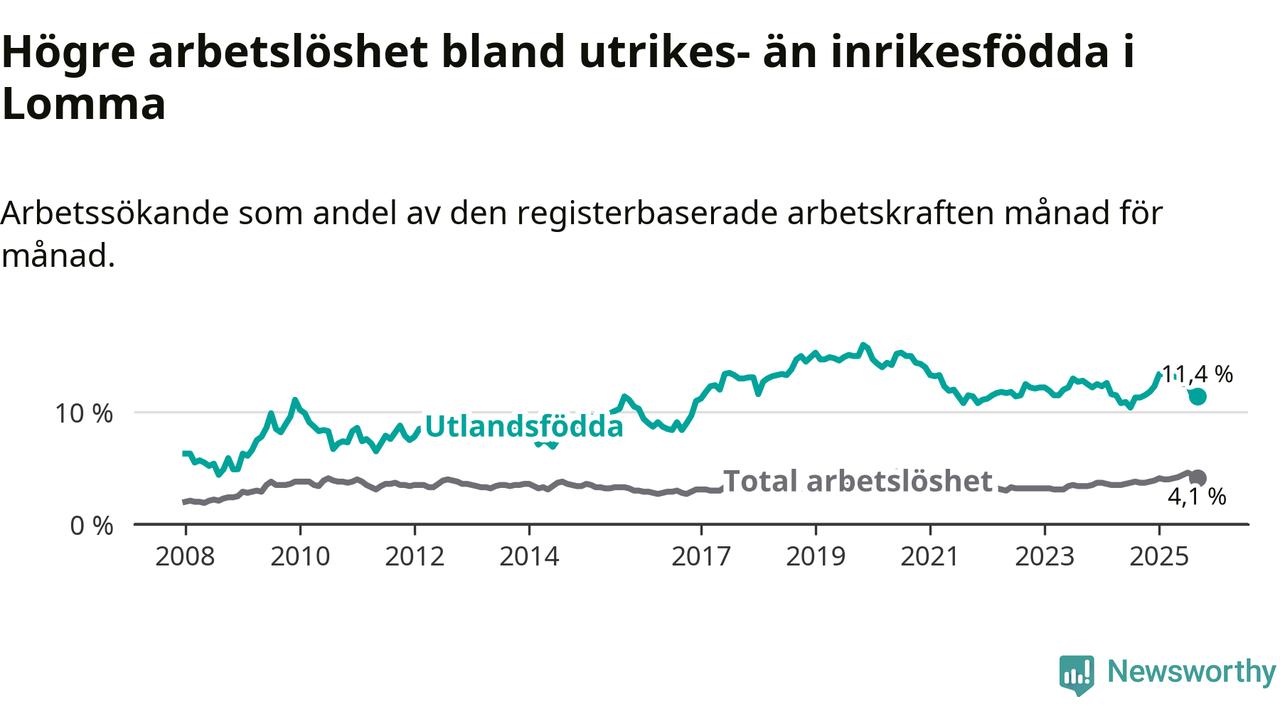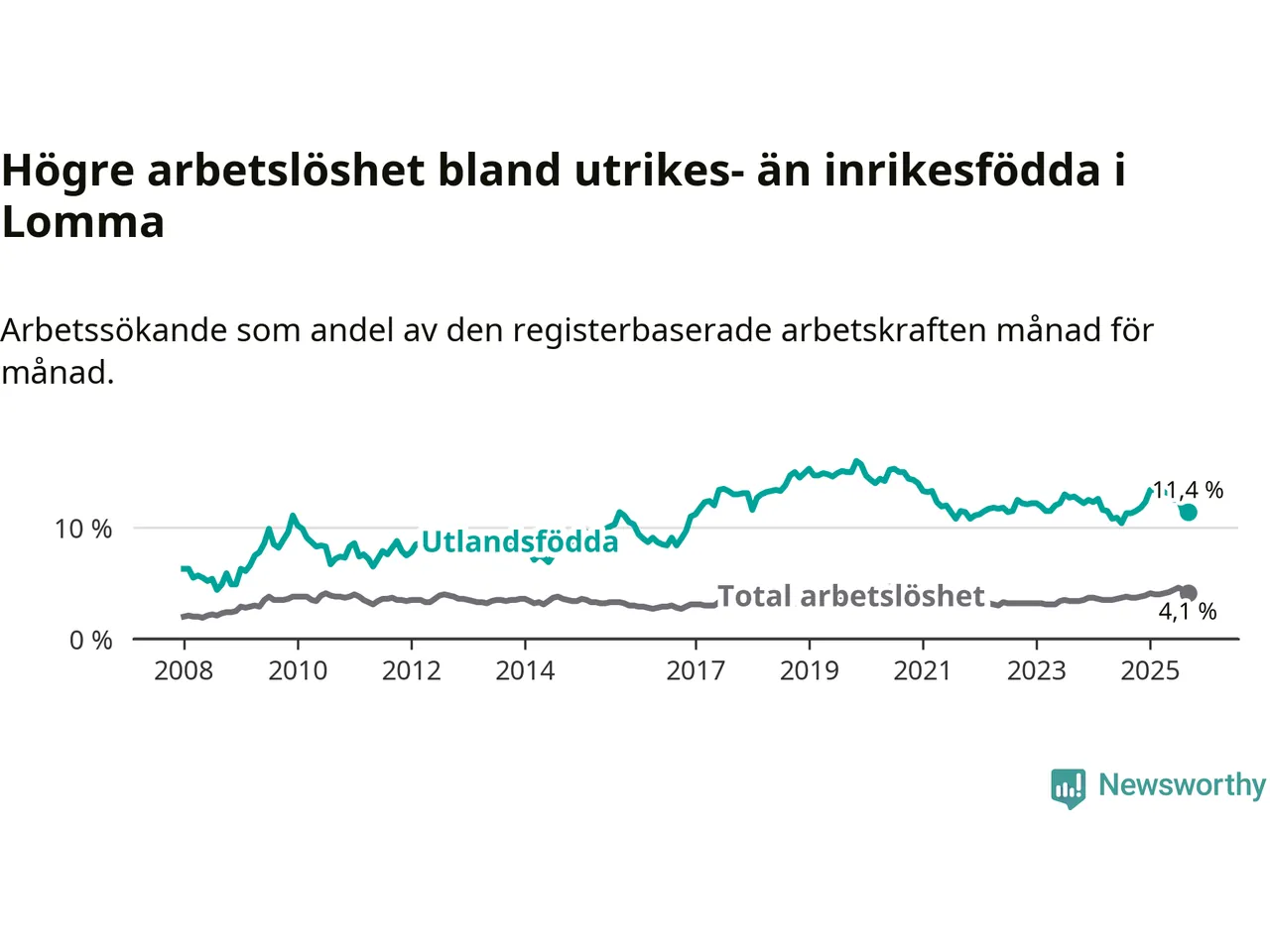 Arbetslösheten bland utlandsfödda var 11,4 procent i Lomma under september månad, motsvarande 155 av 1 360 personer. Det är 0,1 procentenheter fler än vid samma tidpunkt i fjol (+3 om man räknar personer). Därmed är de utlandsföddas arbetslöshet högre än vid samma tidpunkt i fjol för nionde månaden i följd.