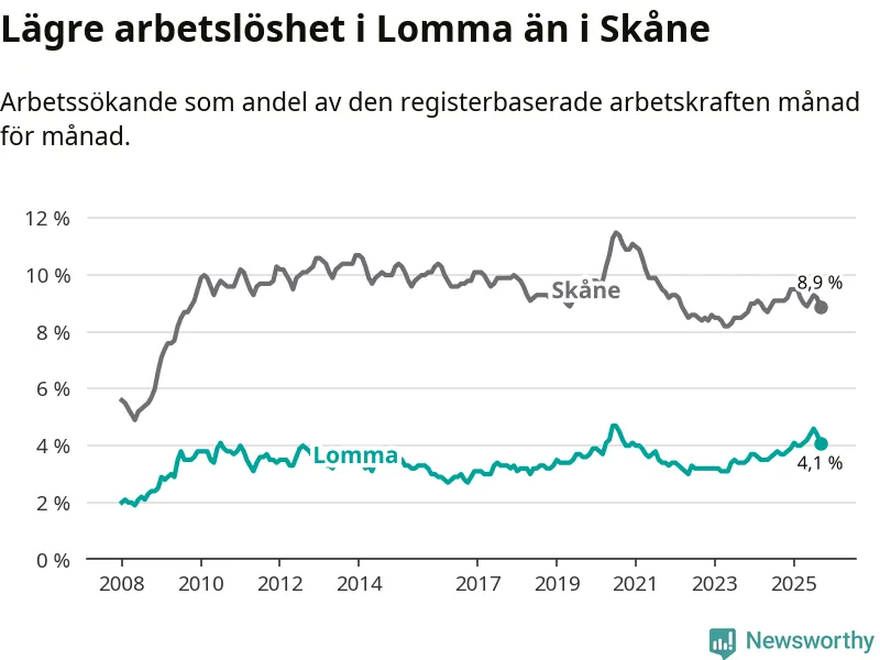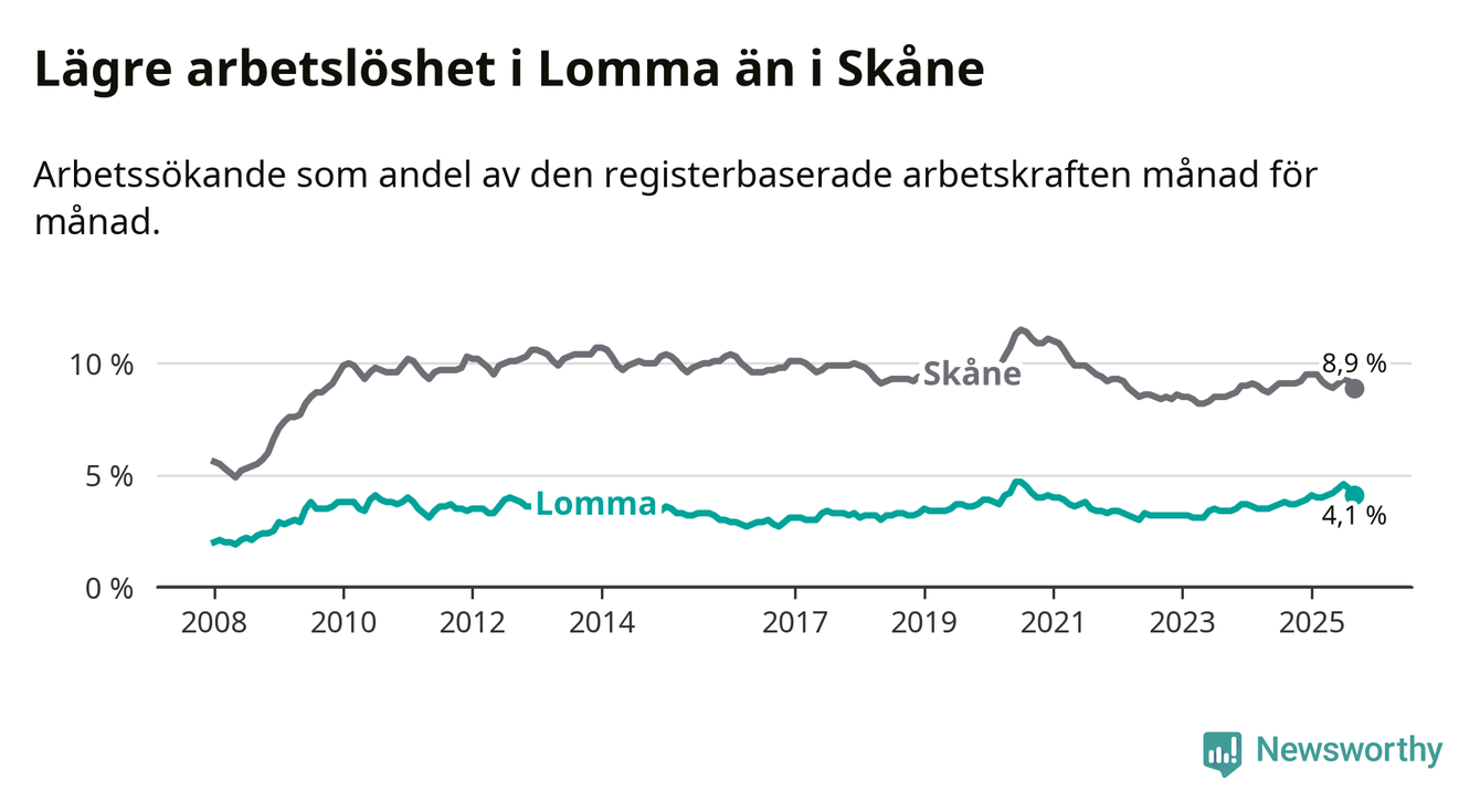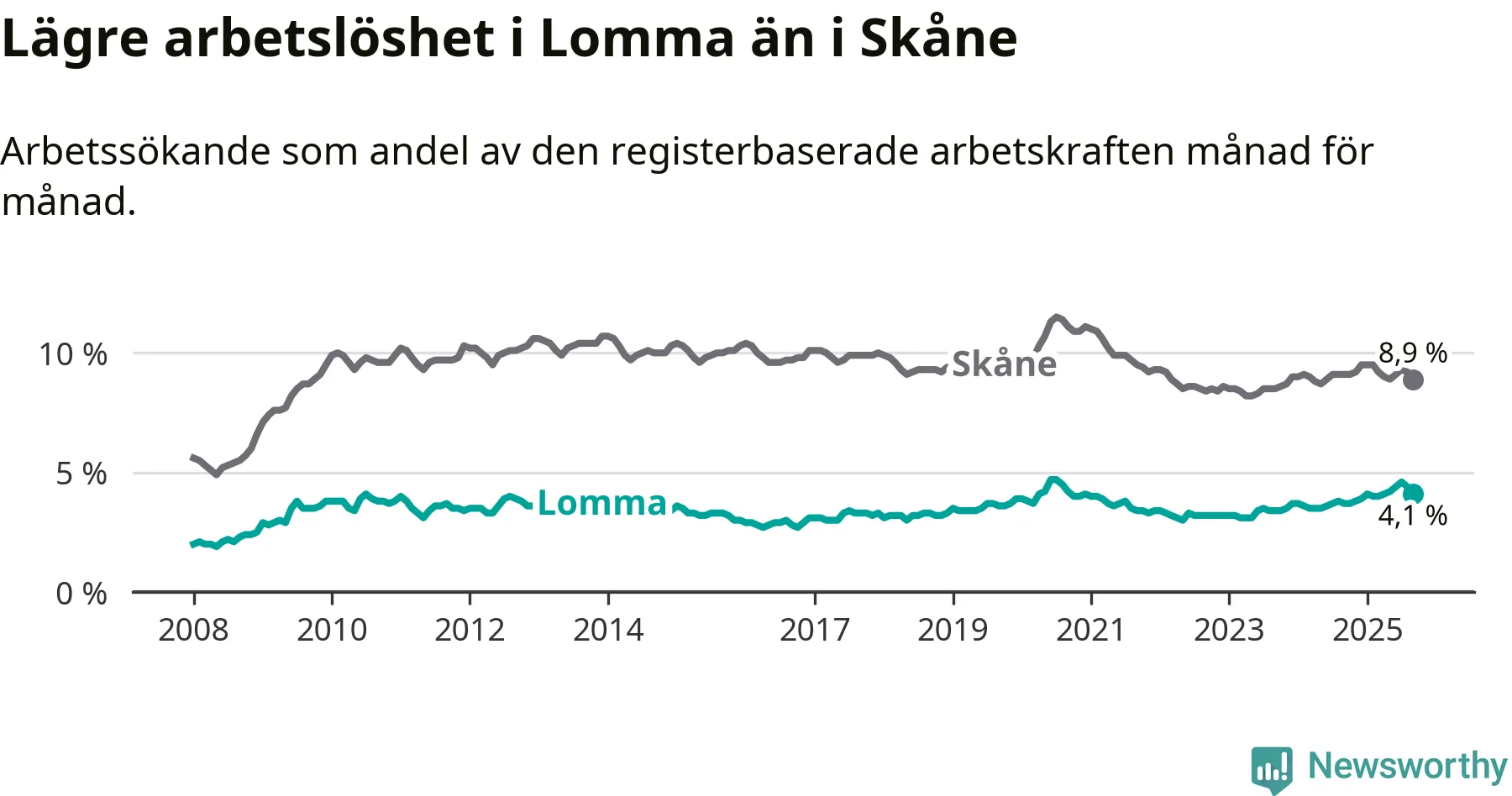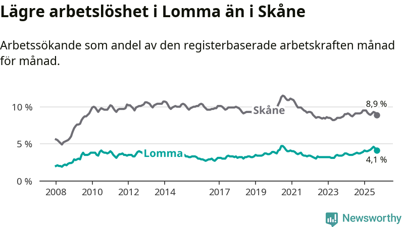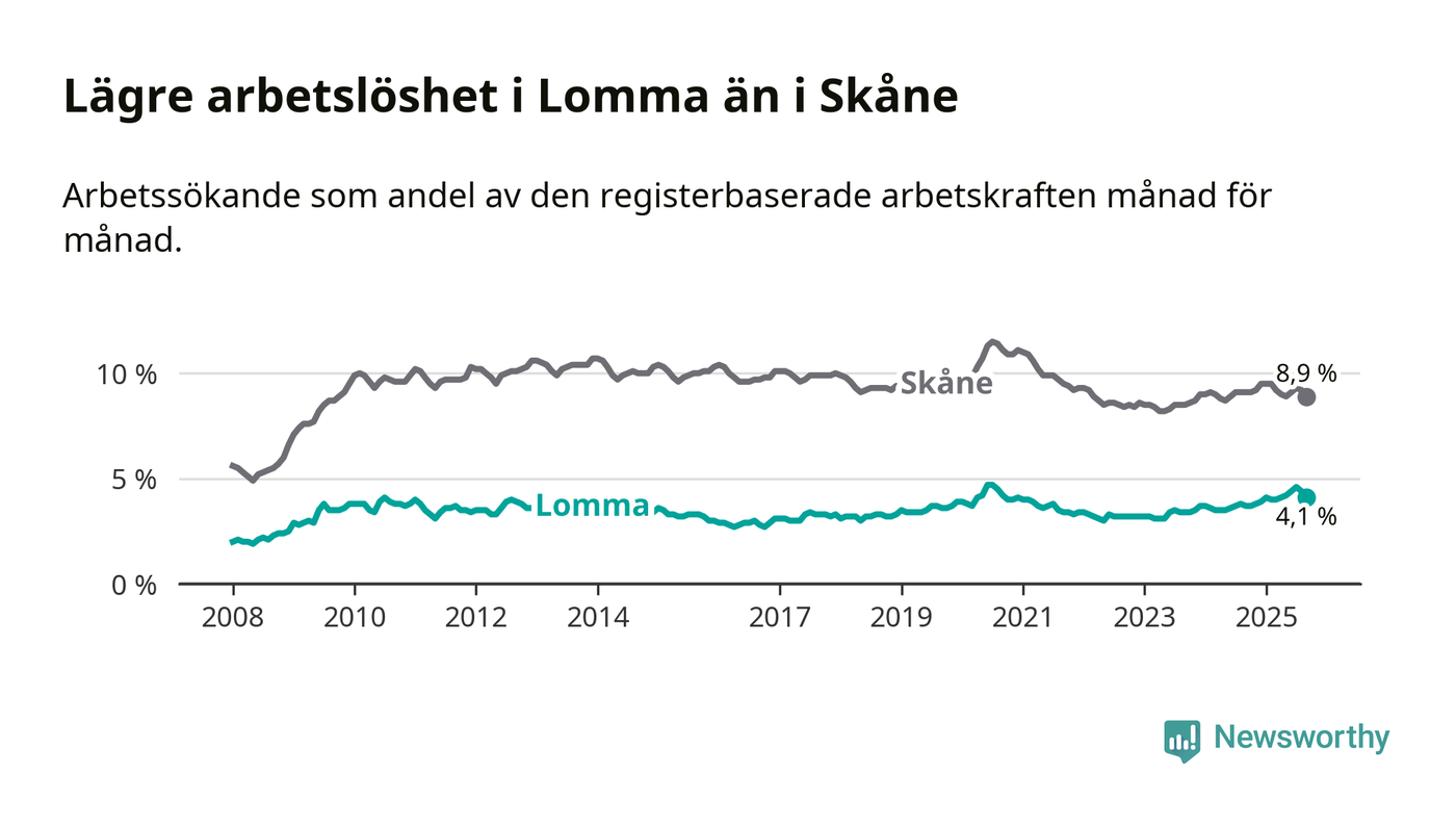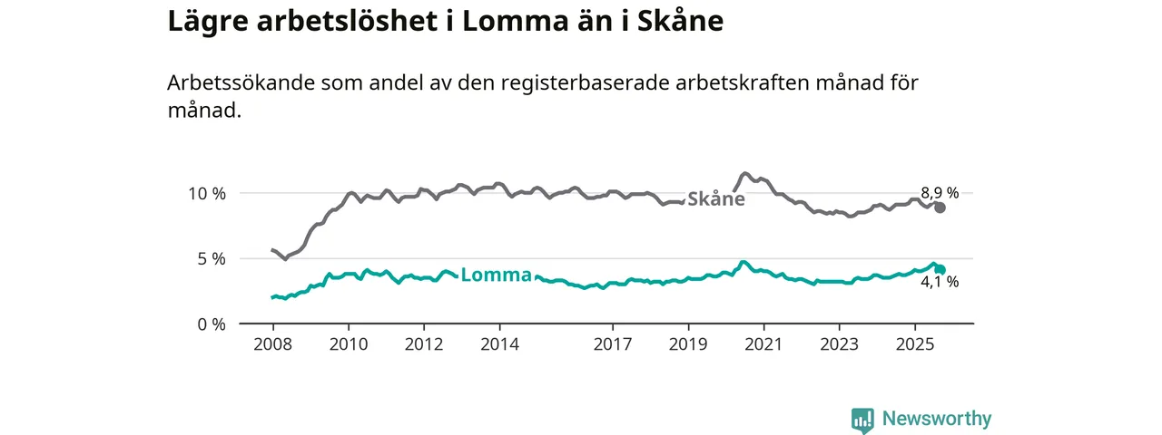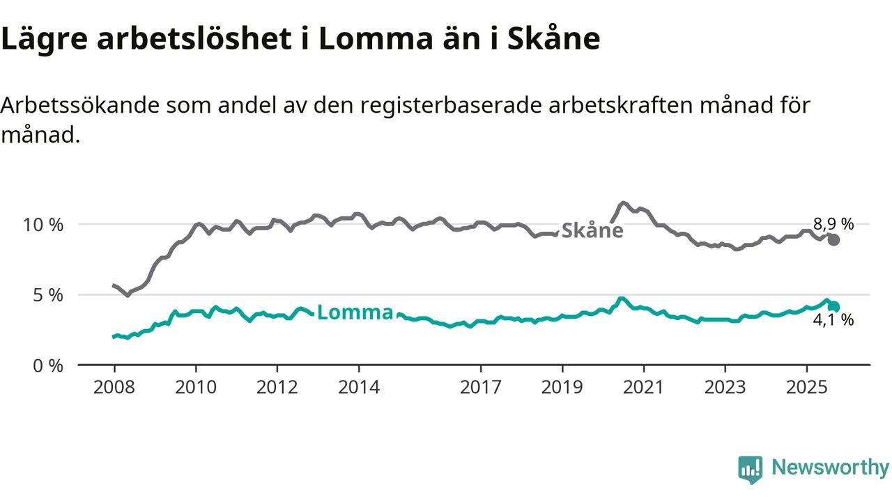Även om arbetslösheten i Lomma alltså ökar, så ligger den fortfarande under snittet i hela Skåne län (4,1 procent i kommunen, jämfört med 8,9 procent i hela länet). Lomma har därmed även den lägsta arbetslöshetsnivån i länet. Perstorp har den högsta (13,6 procent).