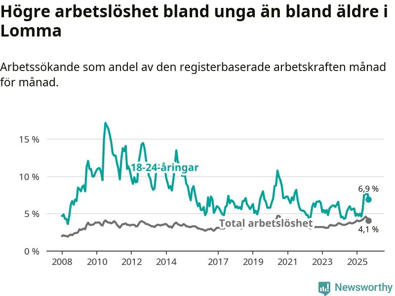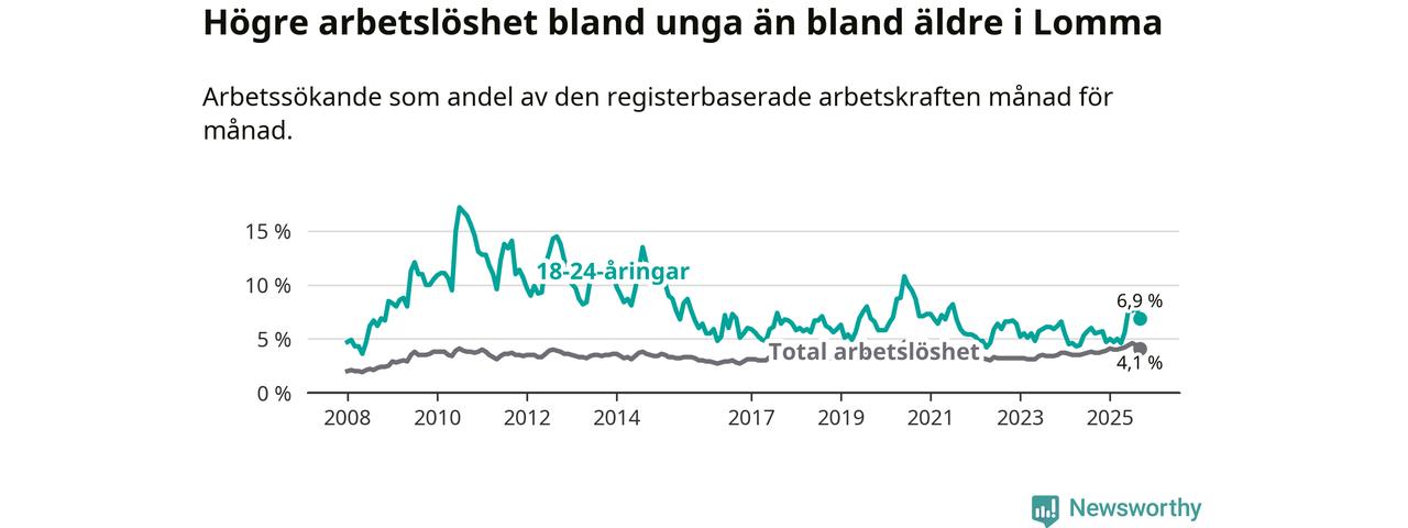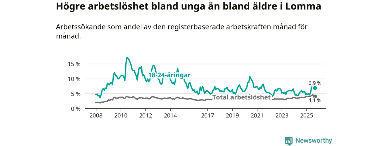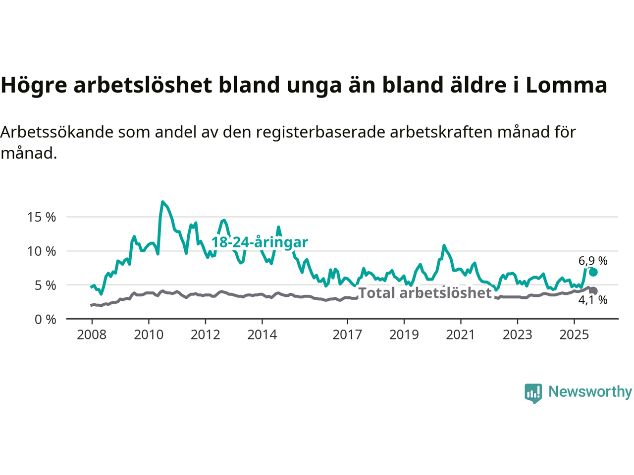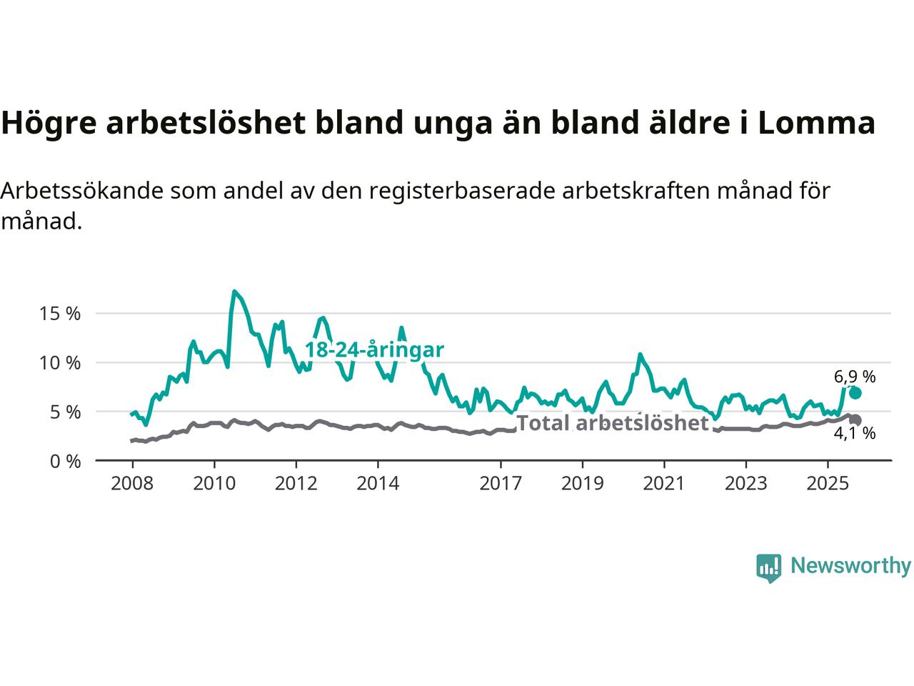 I och med den senaste månadens uppgång har de ungas arbetslöshet i Lomma stigit åtta månader i följd (upp från 5,0 procent i januari till 6,9 procent nu).