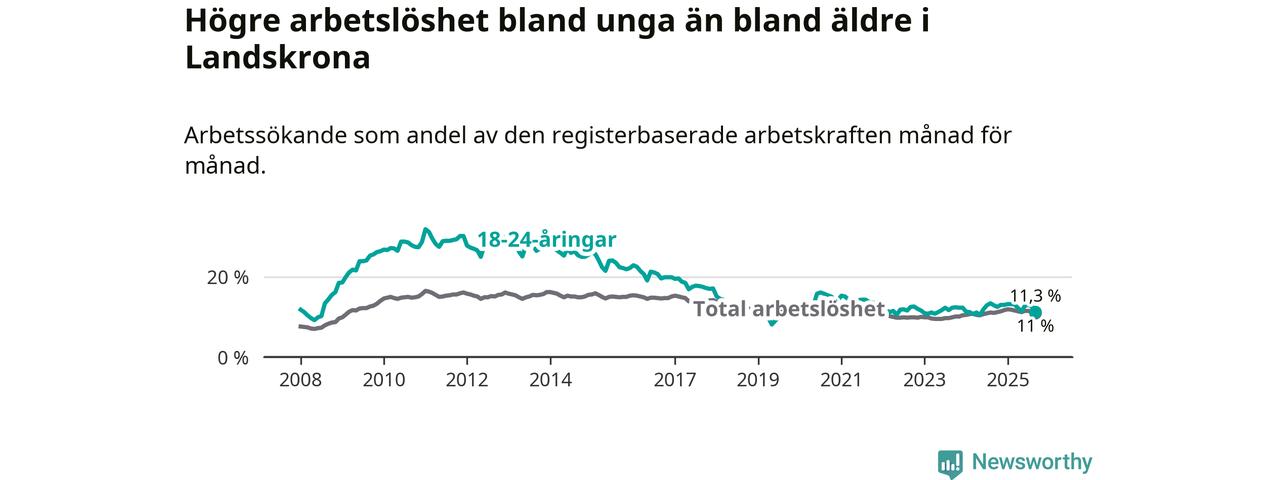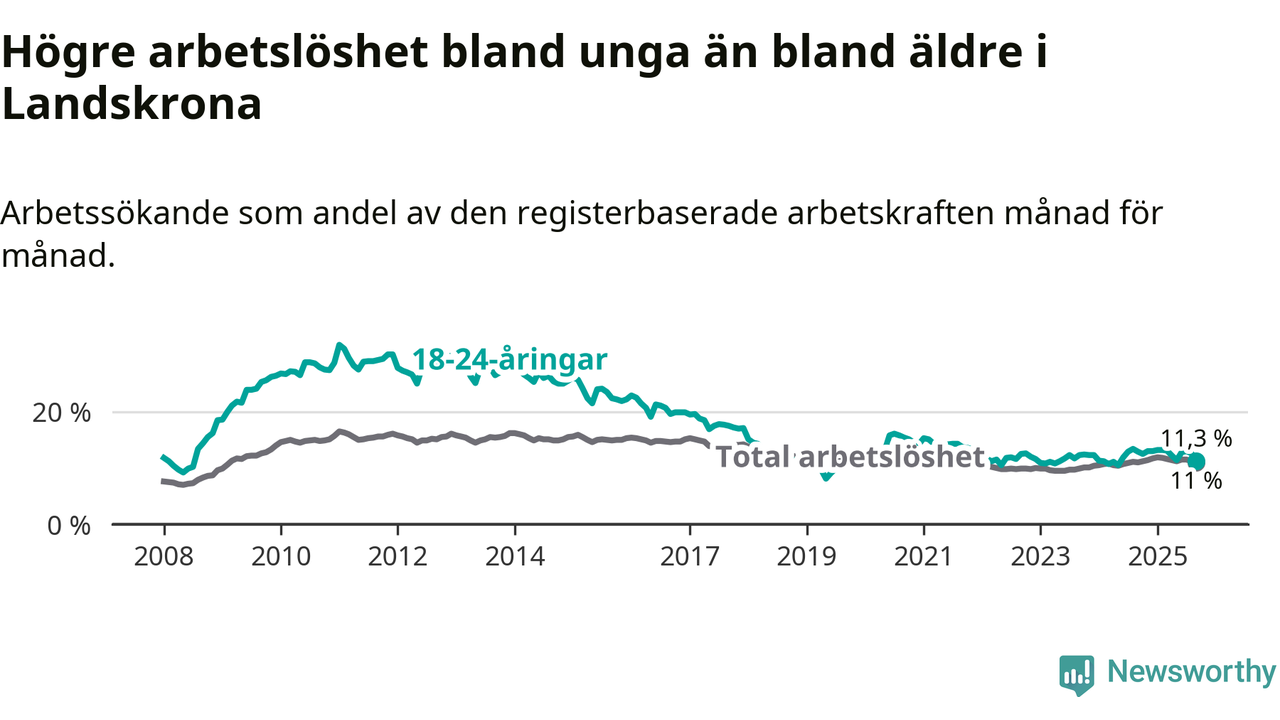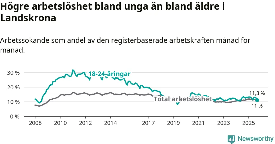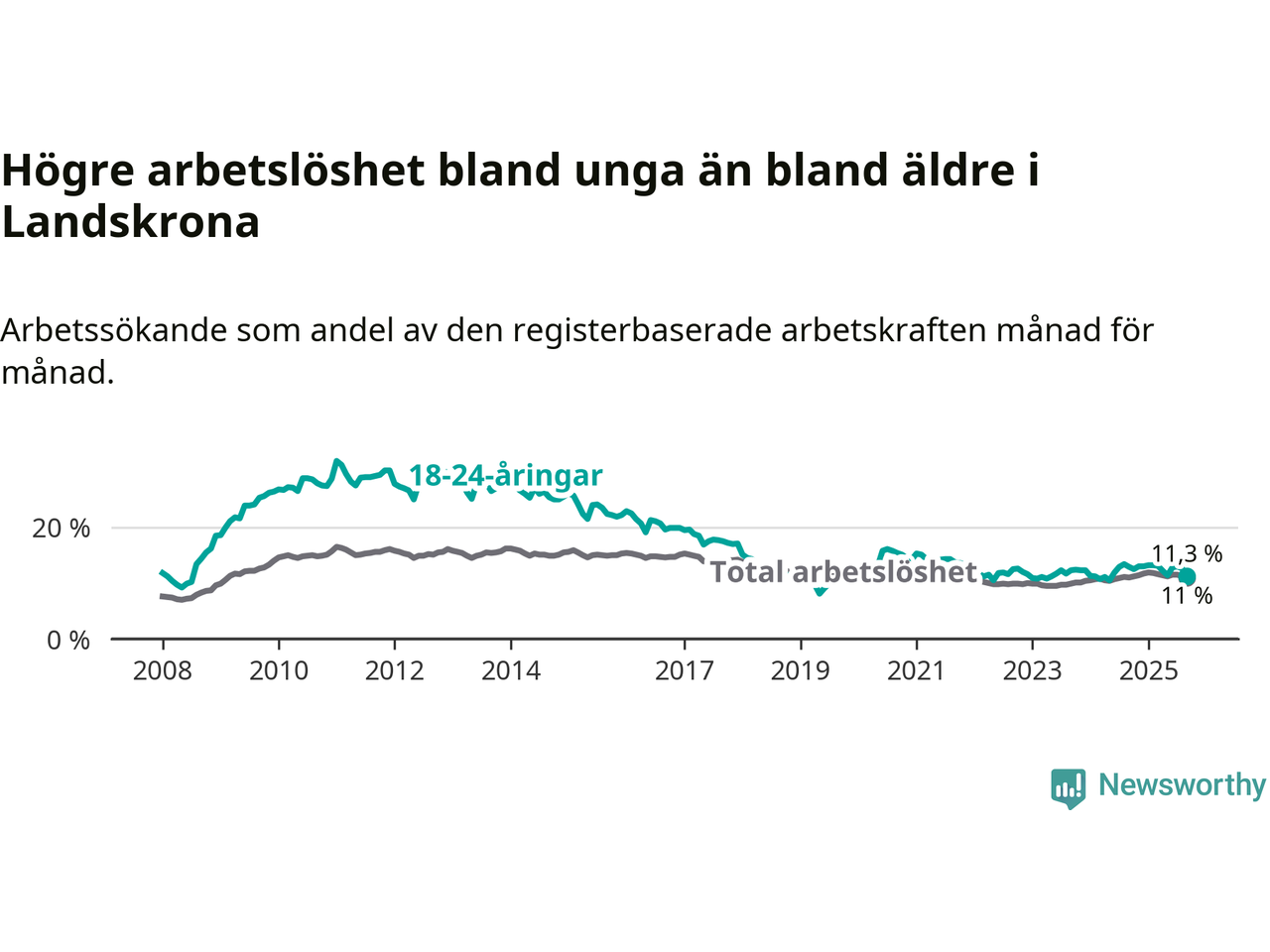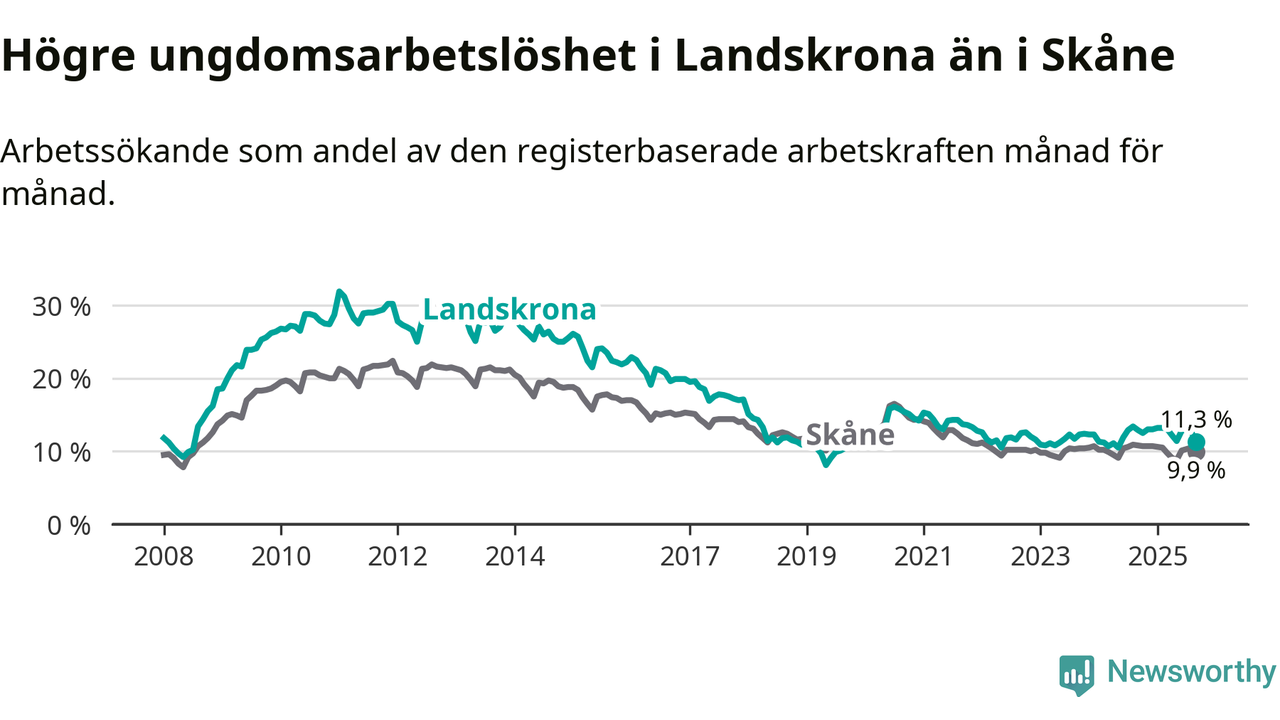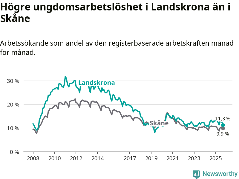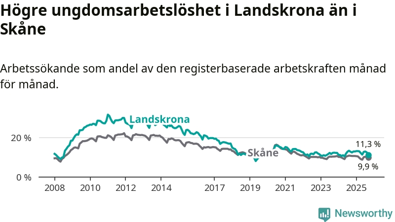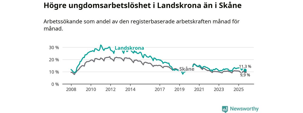 Precis som den totala arbetslösheten ligger ungdomsarbetslösheten i Landskrona högre än i Skåne som helhet. Skillnaden mellan kommunen och länet är 1,4 procentenheter.
