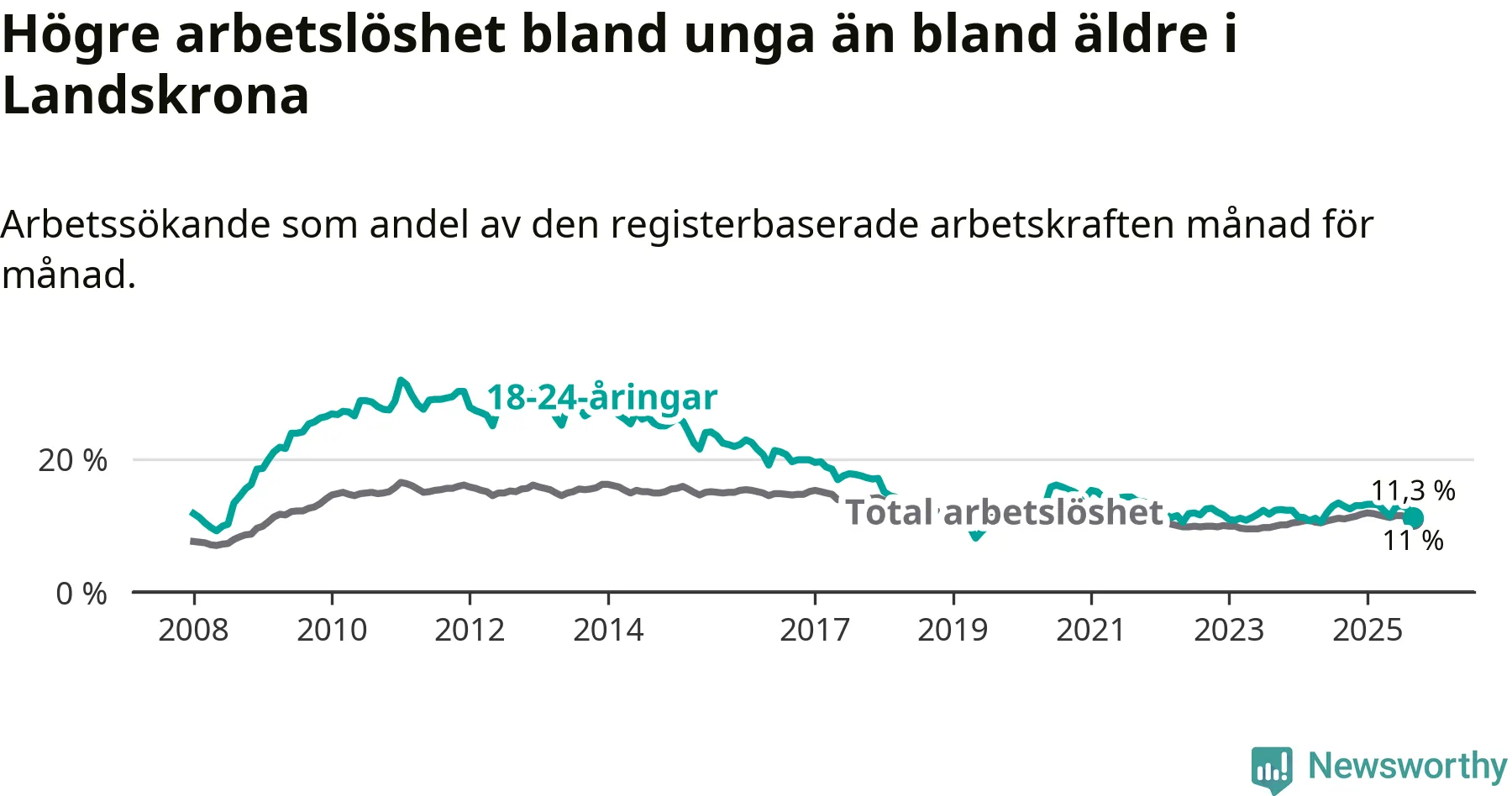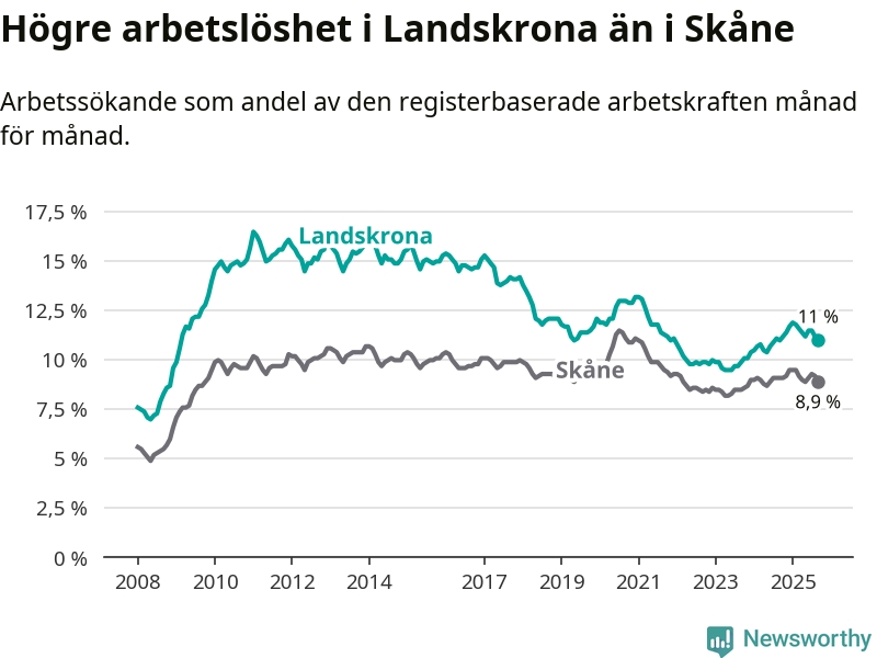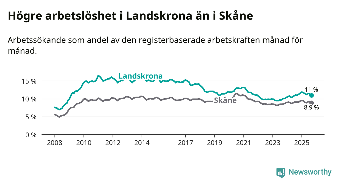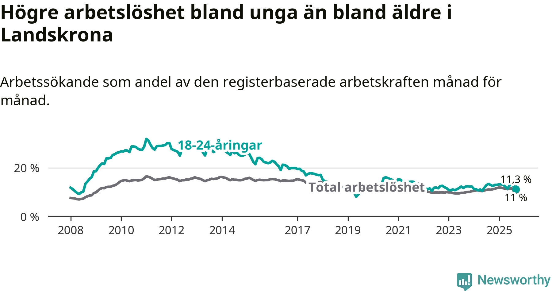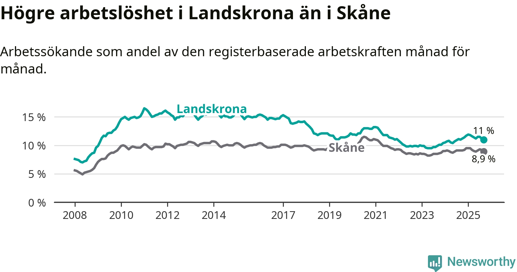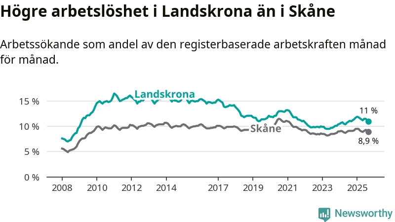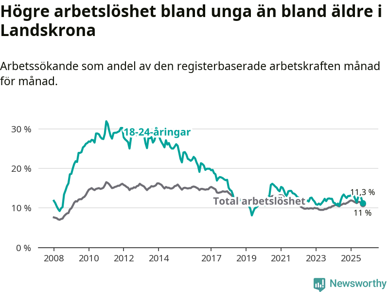 Precis som den totala arbetslösheten ligger ungdomsarbetslösheten i Landskrona högre än i Skåne som helhet. Skillnaden mellan kommunen och länet är 1,4 procentenheter.