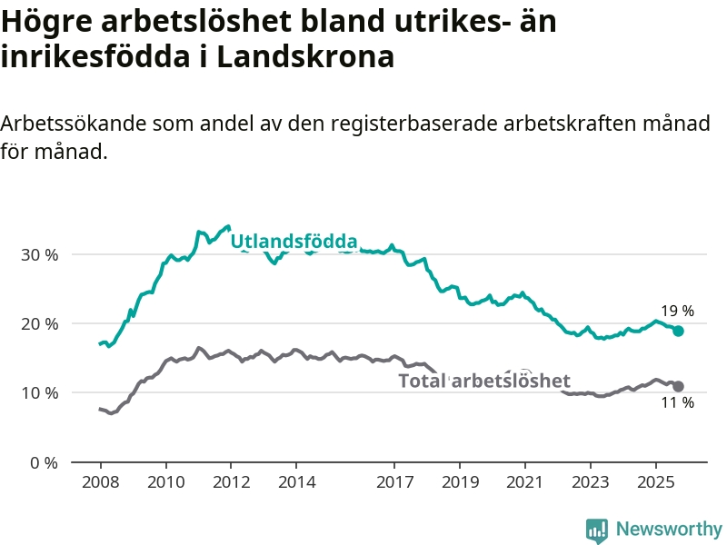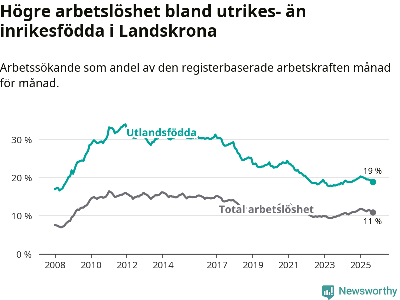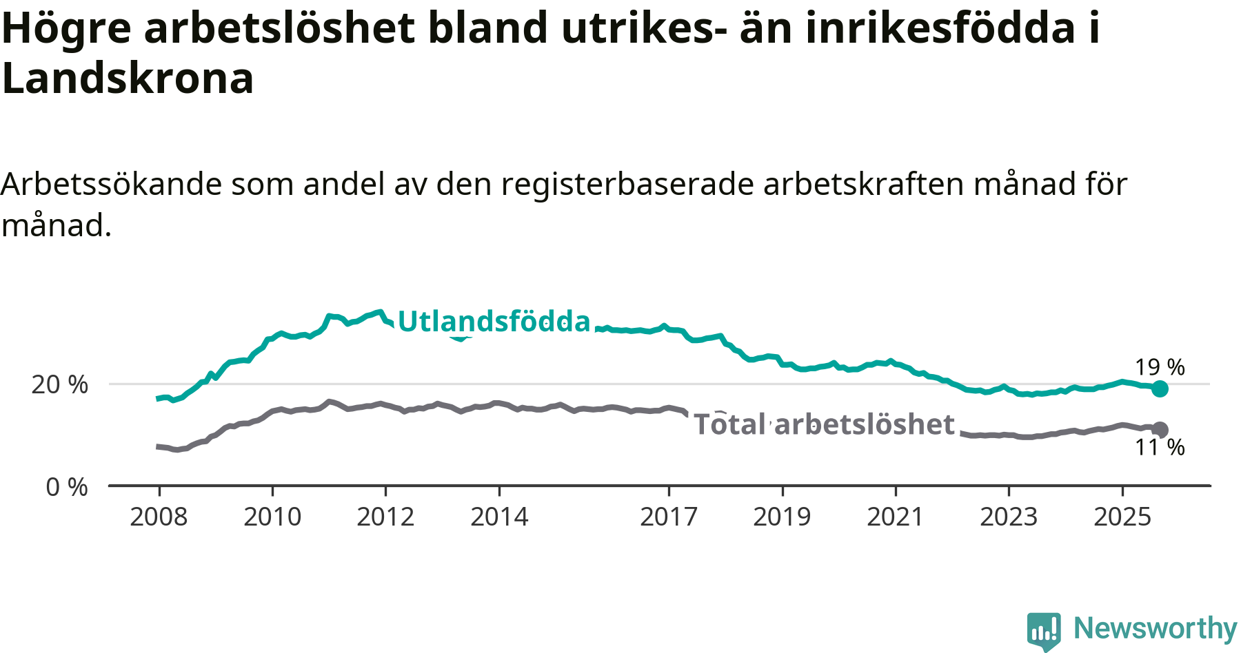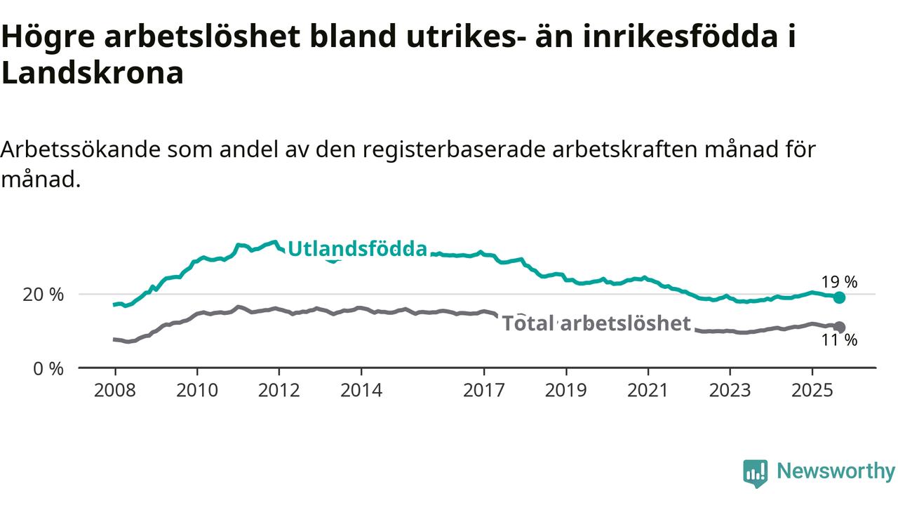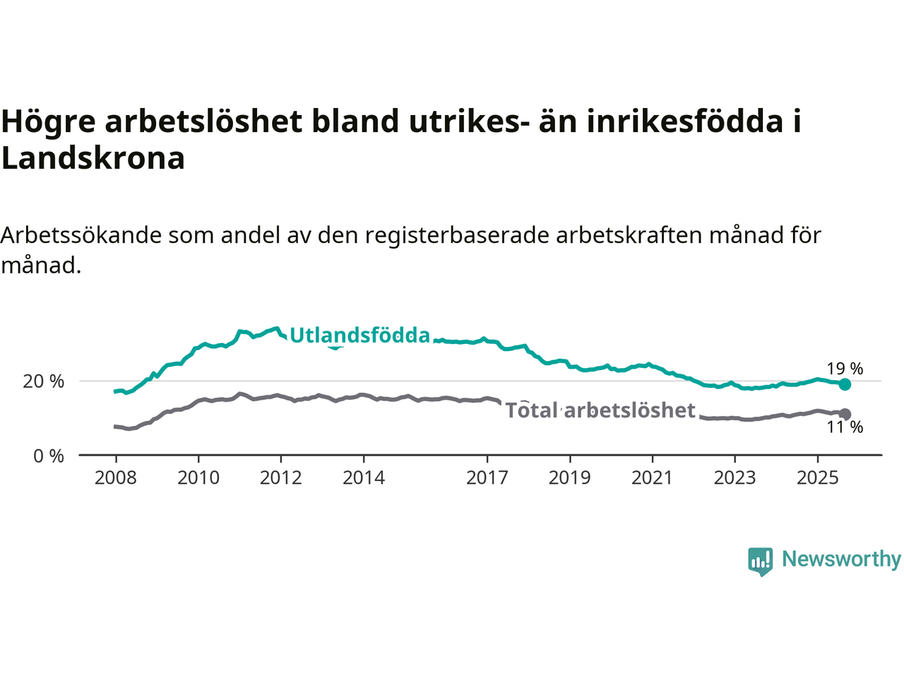Arbetslösheten bland utlandsfödda var 19,0 procent i Landskrona under september månad, motsvarande 1 437 av 7 563 personer. Det är 0,3 procentenheter färre än vid samma tidpunkt i fjol (−13 om man räknar personer).