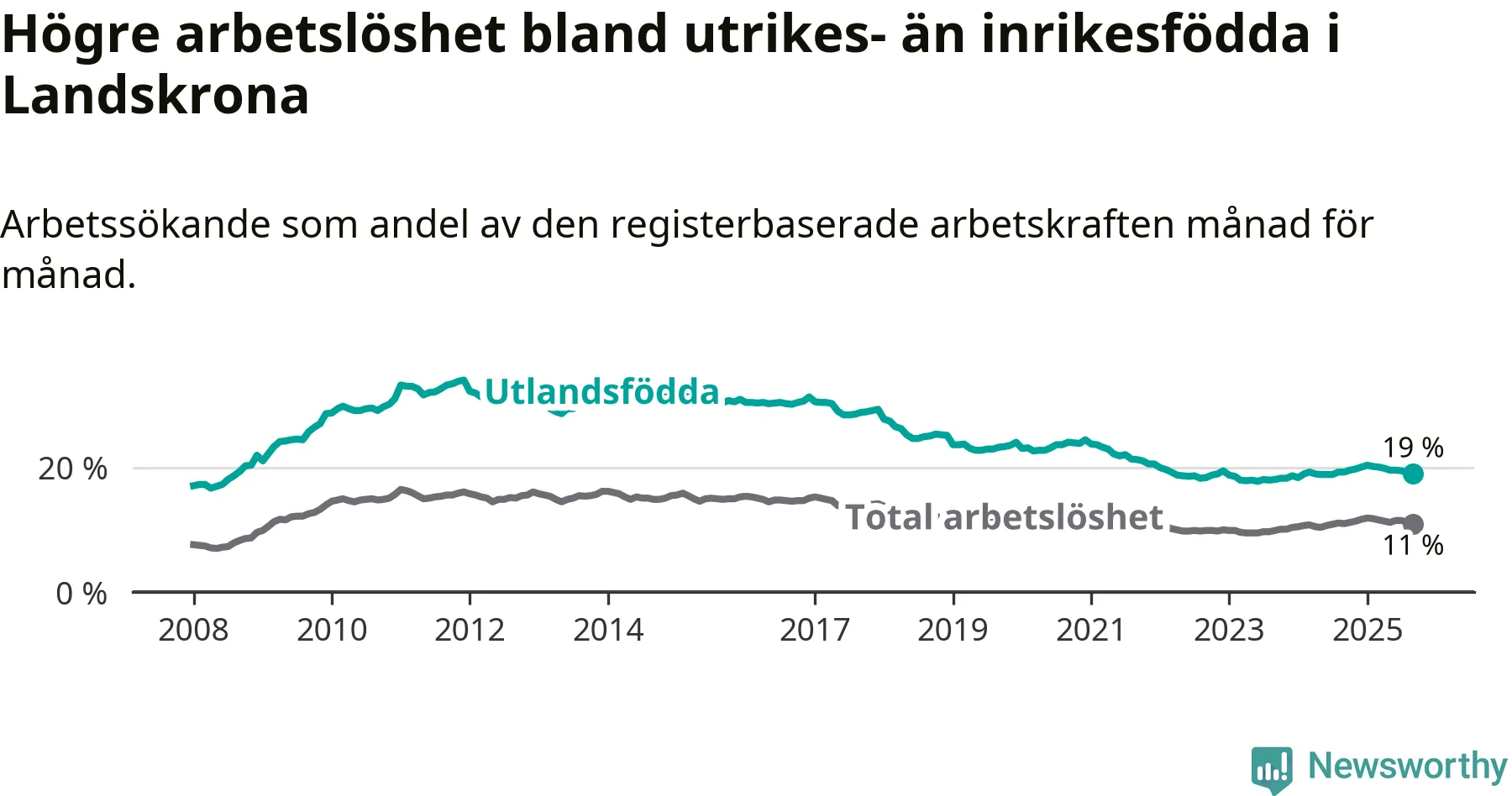 Skillnaden i arbetslöshet mellan utrikesfödda och hela befolkningen är 8,0 procentenheter i Landskrona.