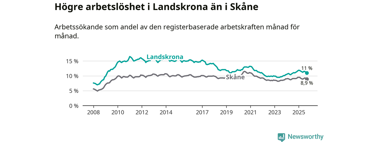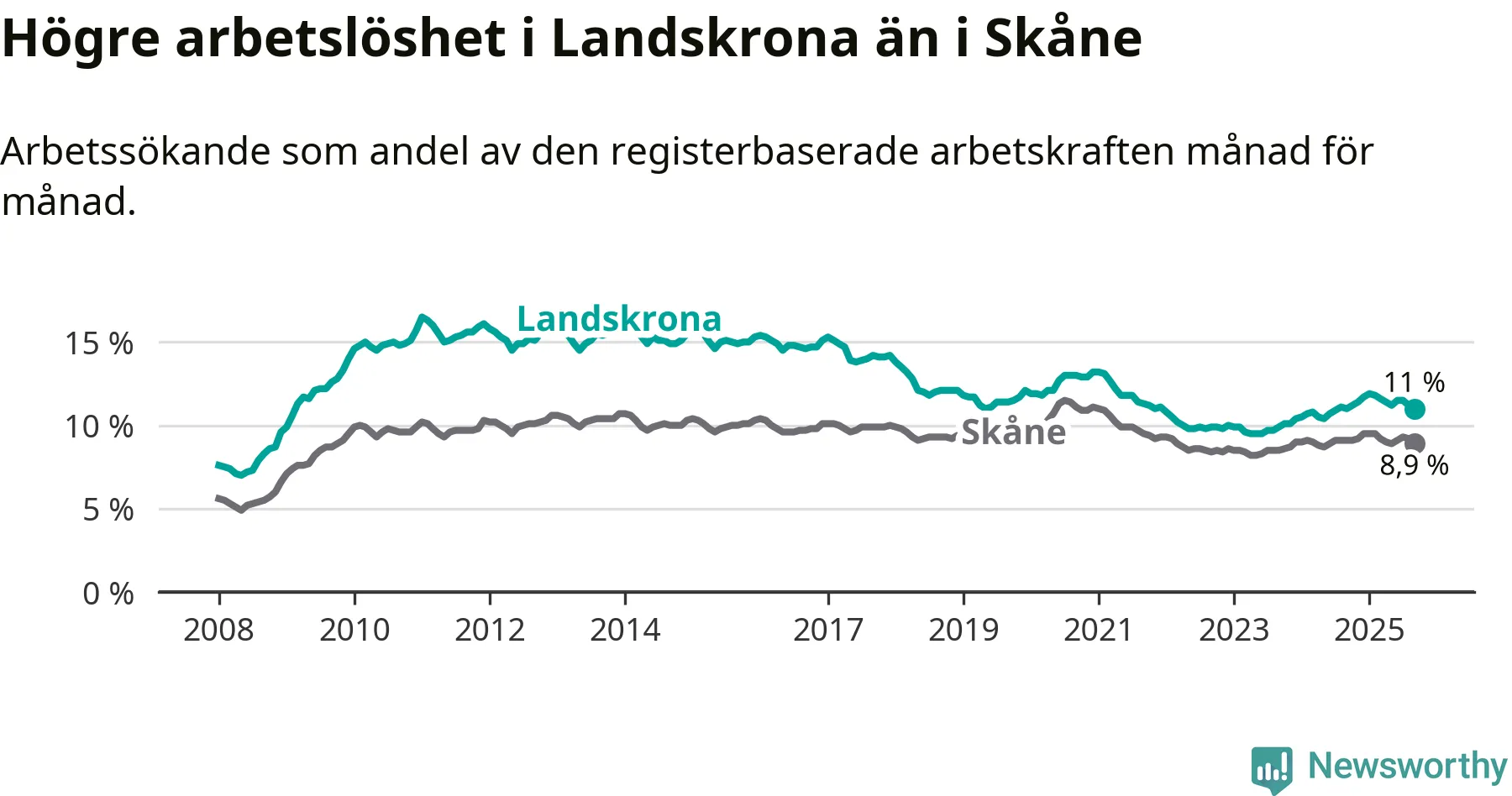 Perstorp är den kommun som har högst arbetslöshet just nu (13,6 procent) i landet som helhet, medan Gällivare och Kiruna har den lägsta (2,6 procent). Landskronas arbetslöshet sticker ut som den fjärde högsta i hela landet.