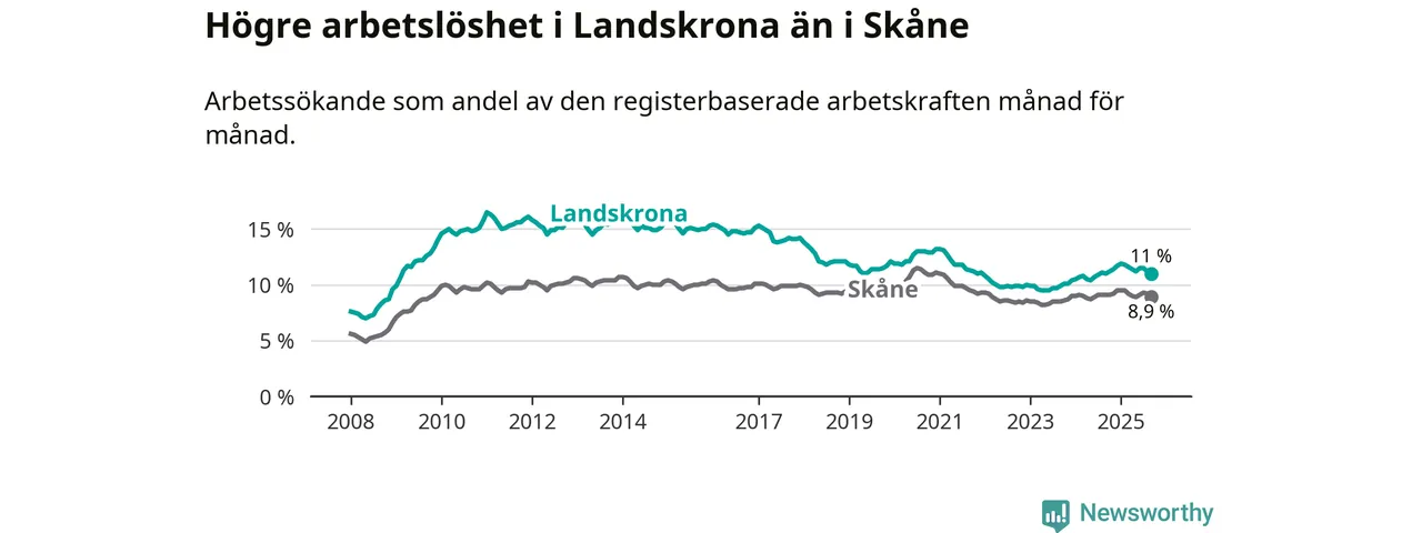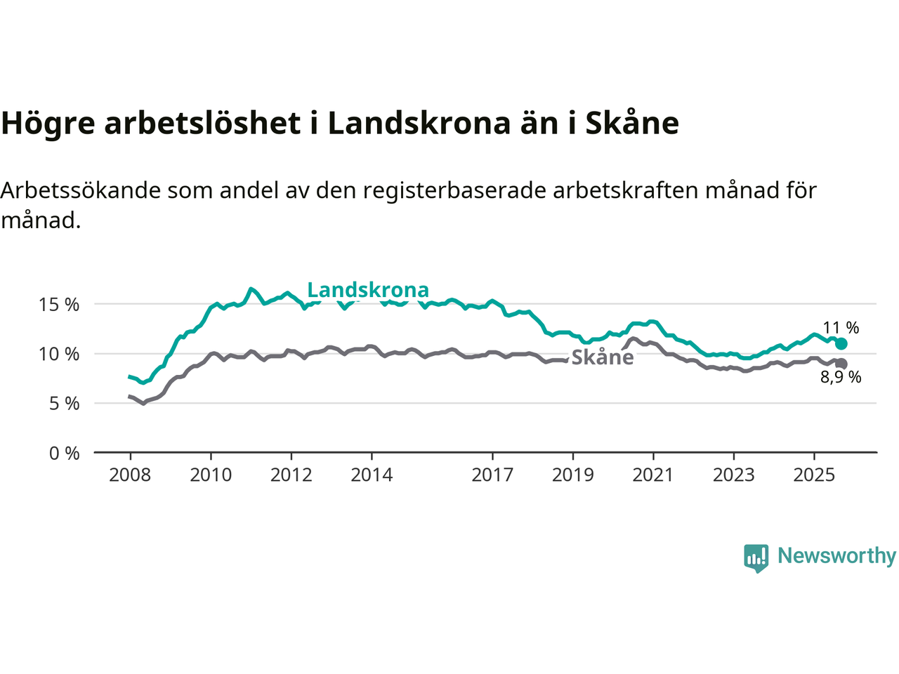 Under september månad rapporterade Landskrona kommun en total arbetslöshet på 11,0 procent. Det är i samma nivå som i september i fjol. I Skåne län däremot sjunker arbetslösheten