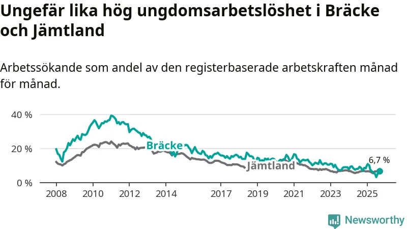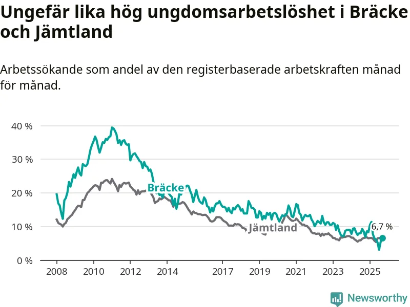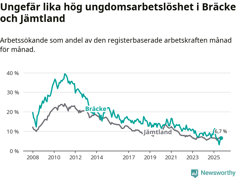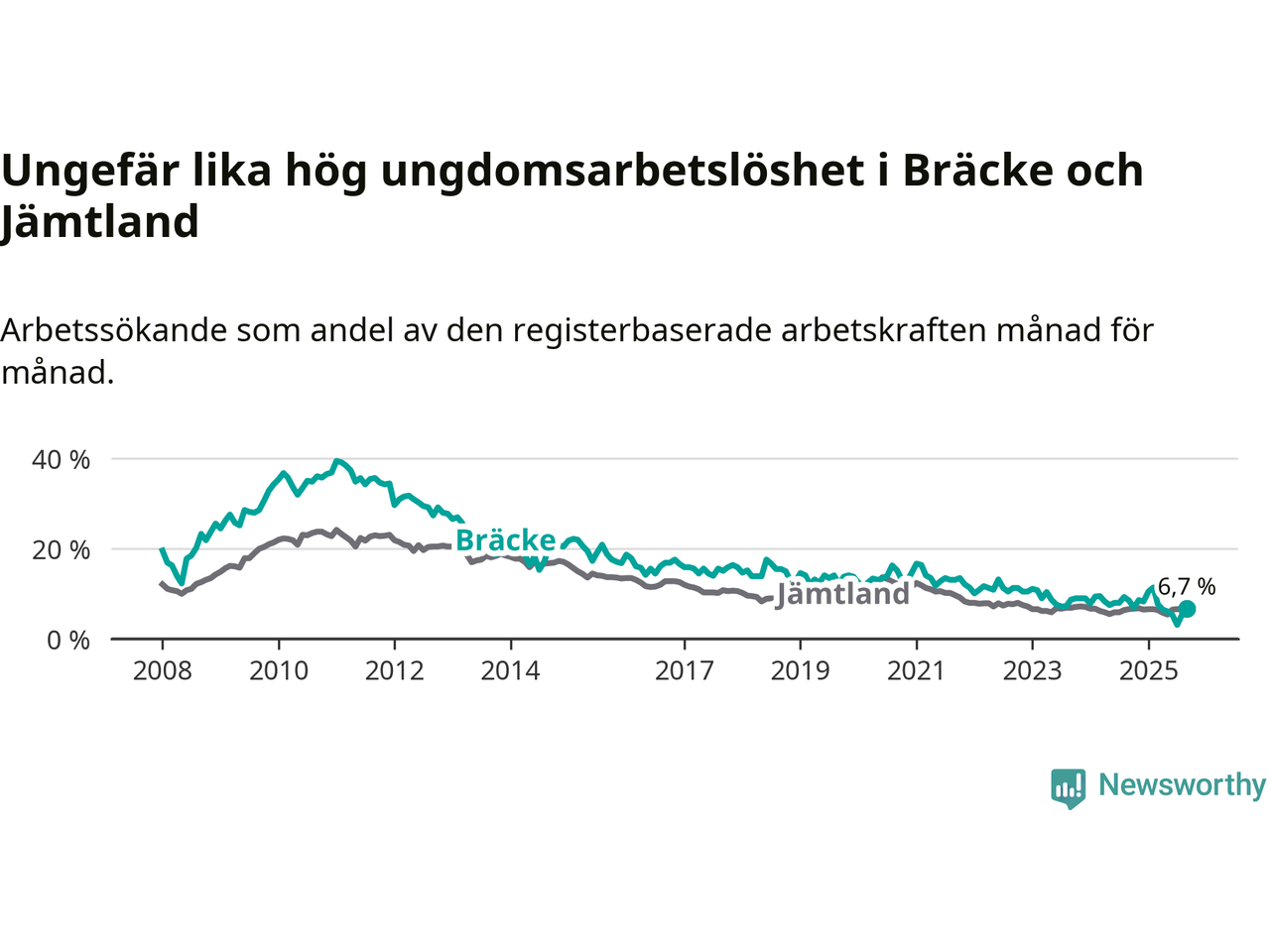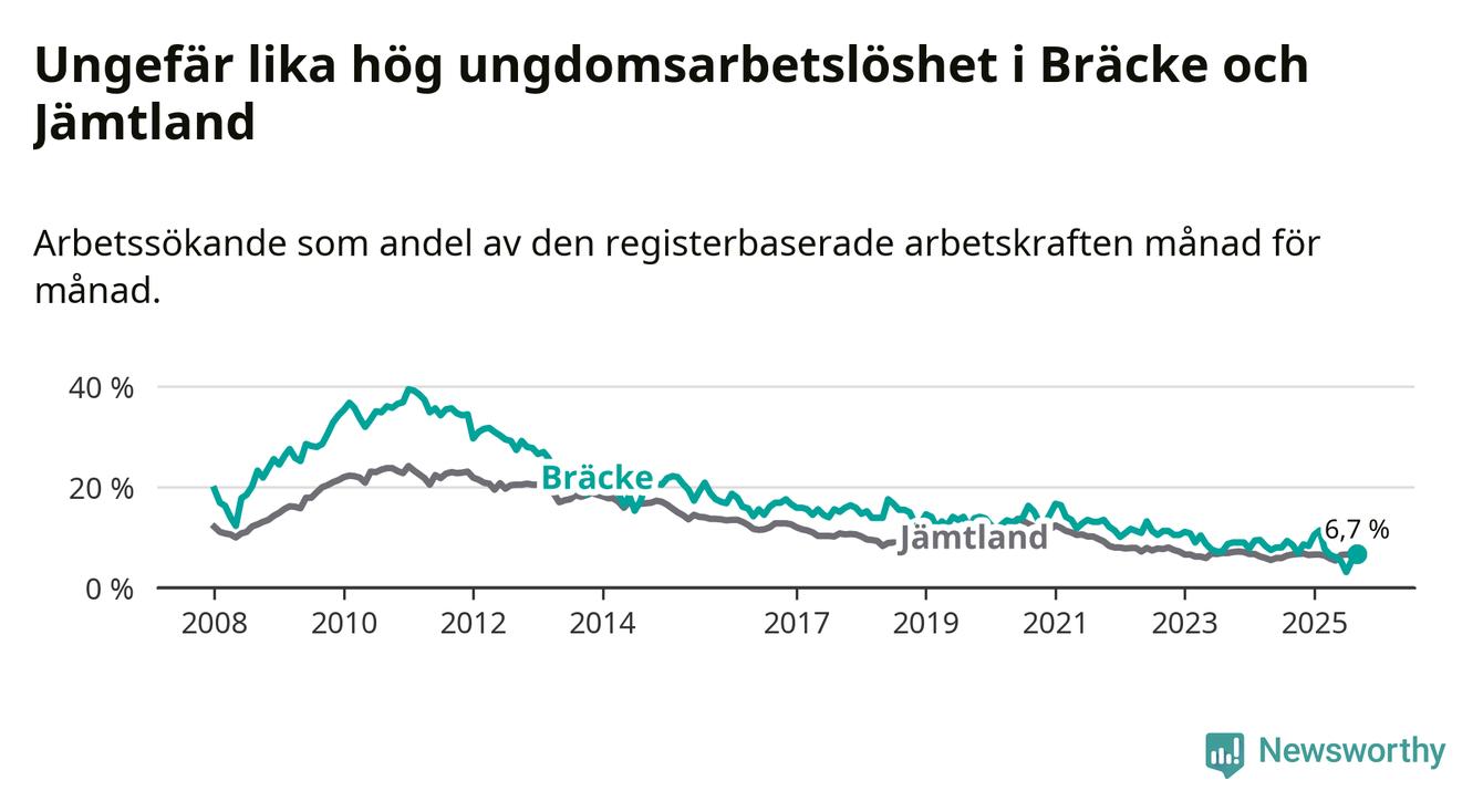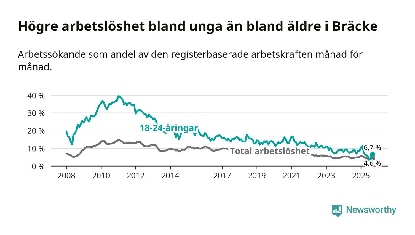 I och med den senaste månadens nedgång har de ungas arbetslöshet i Bräcke sjunkit sju månader i följd (ner från 11,4 procent i februari till 6,7 procent nu).
