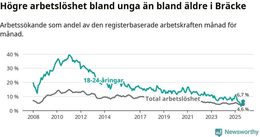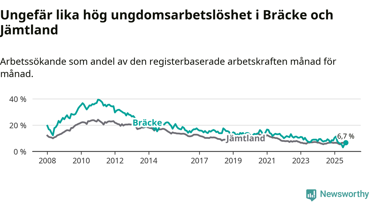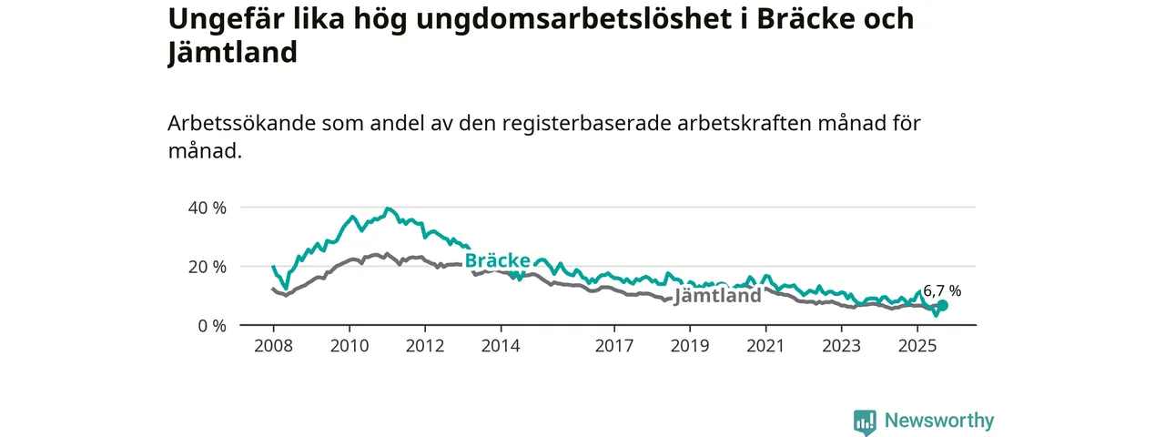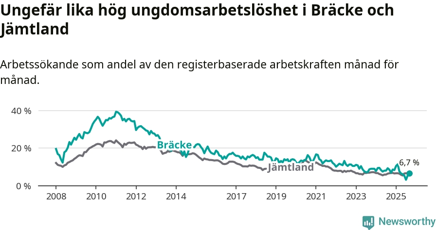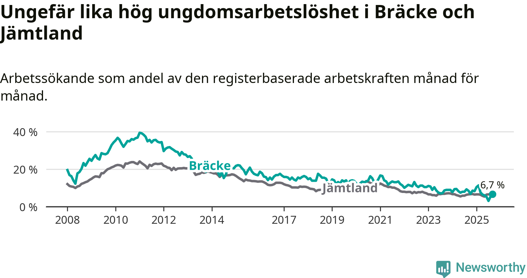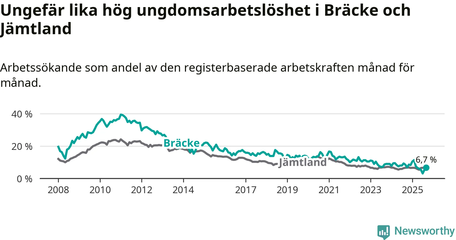 I och med den senaste månadens nedgång har de ungas arbetslöshet i Bräcke sjunkit sju månader i följd (ner från 11,4 procent i februari till 6,7 procent nu).