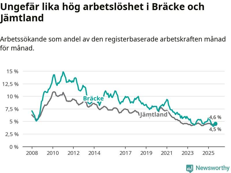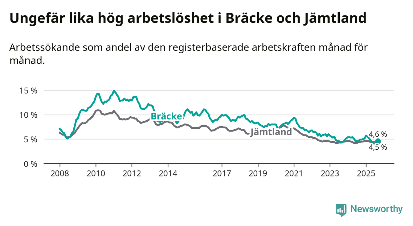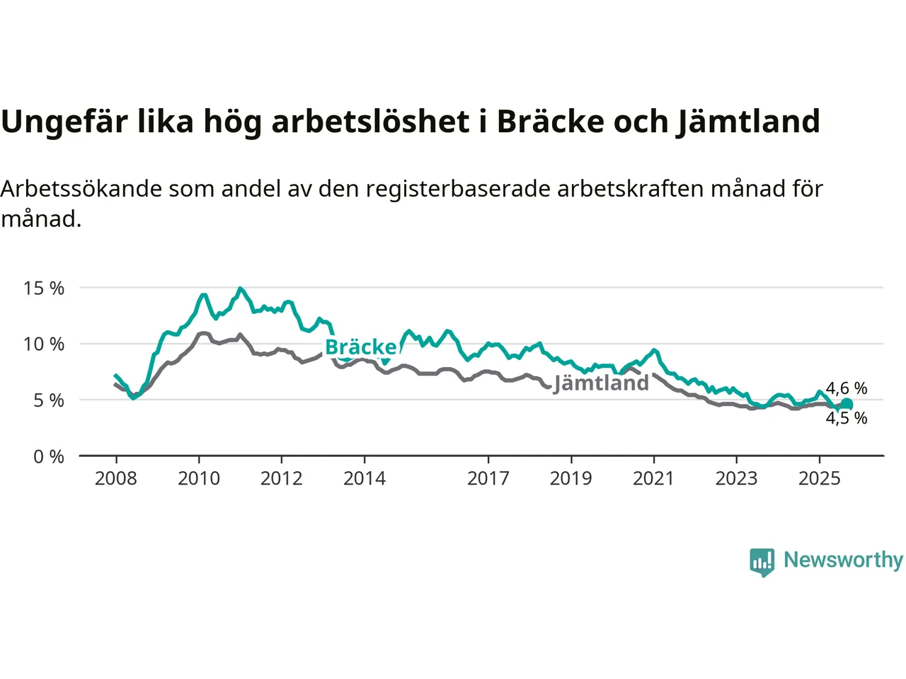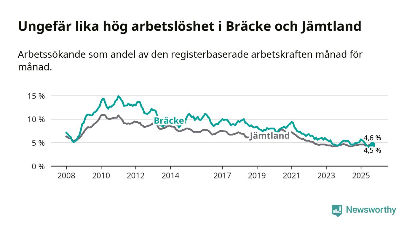Under september månad rapporterade Bräcke kommun en total arbetslöshet på 4,6 procent. Det är en minskning jämfört med samma tidpunkt i fjol (−0,3 procentenheter). I Jämtlands län däremot stiger arbetslösheten något.