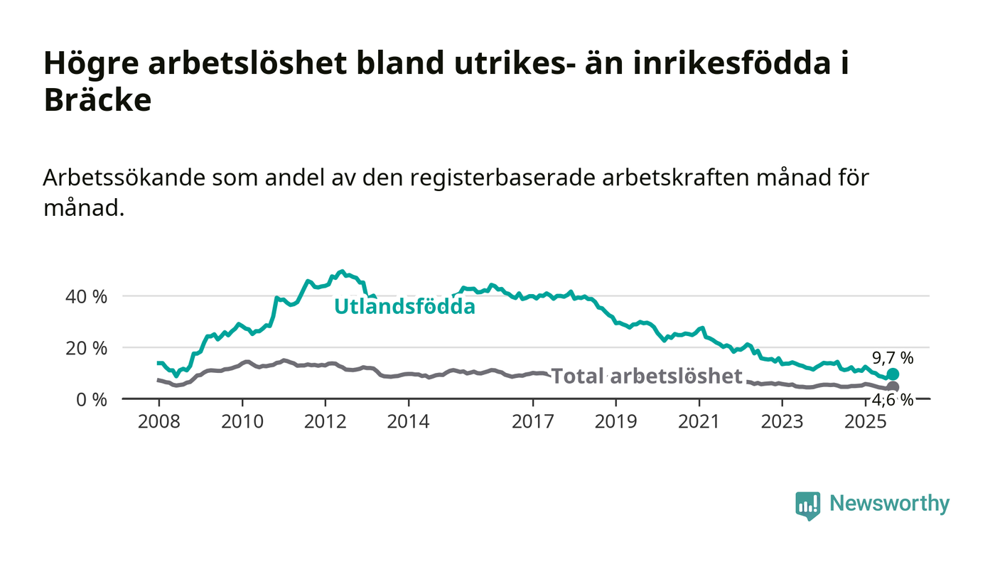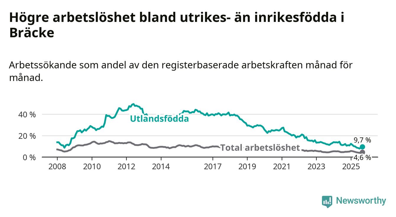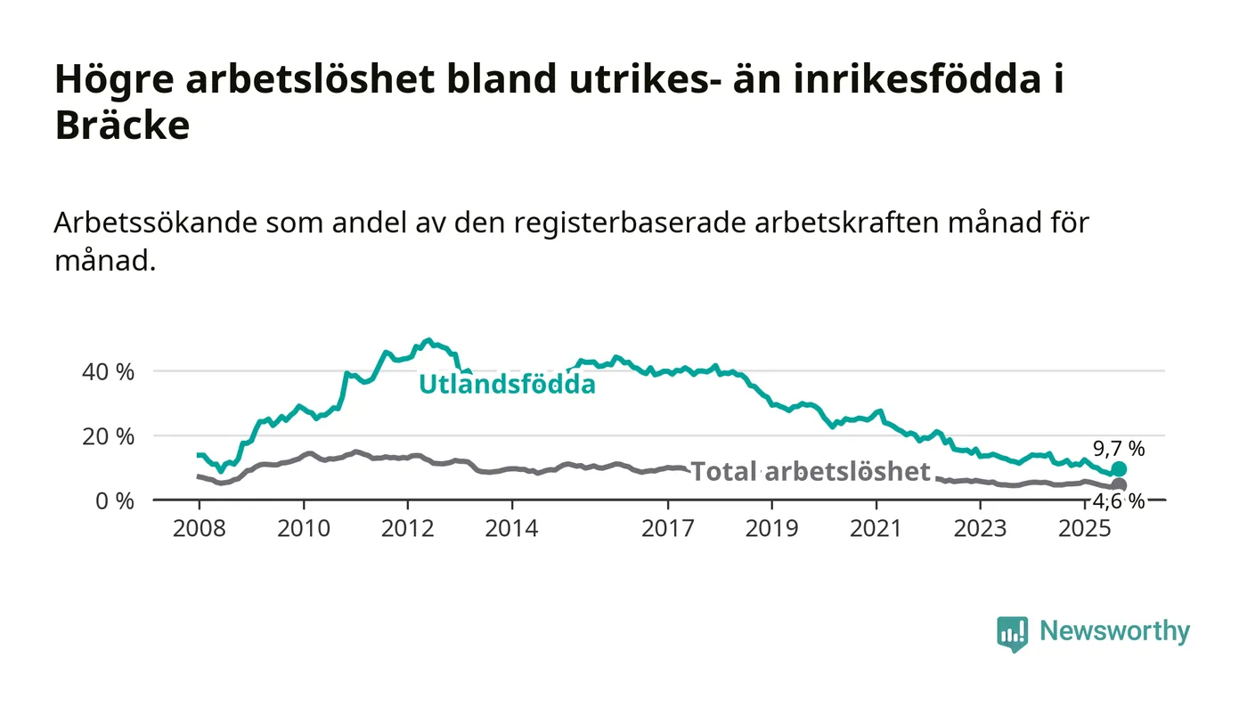 Arbetslösheten bland utlandsfödda var 9,7 procent i Bräcke under september månad, motsvarande 37 av 381 personer. Det är 2,5 procentenheter färre än vid samma tidpunkt i fjol (−8 om man räknar personer). Därmed är de utlandsföddas arbetslöshet lägre än vid samma tidpunkt i fjol för tolfte månaden i följd. Sedan september 2024 har arbetslösheten bland utlandsfödda minskat från 12,2 till 9,7 procent.