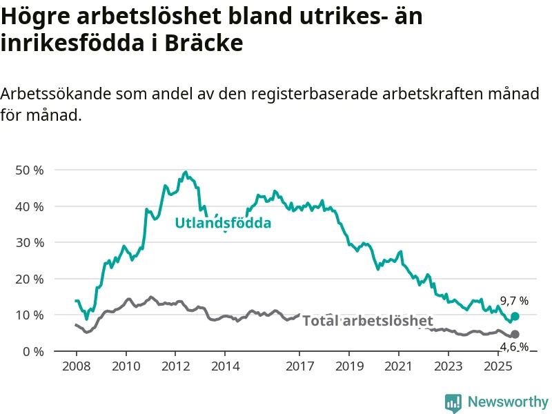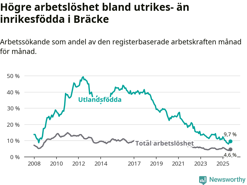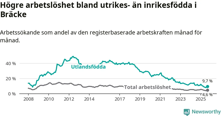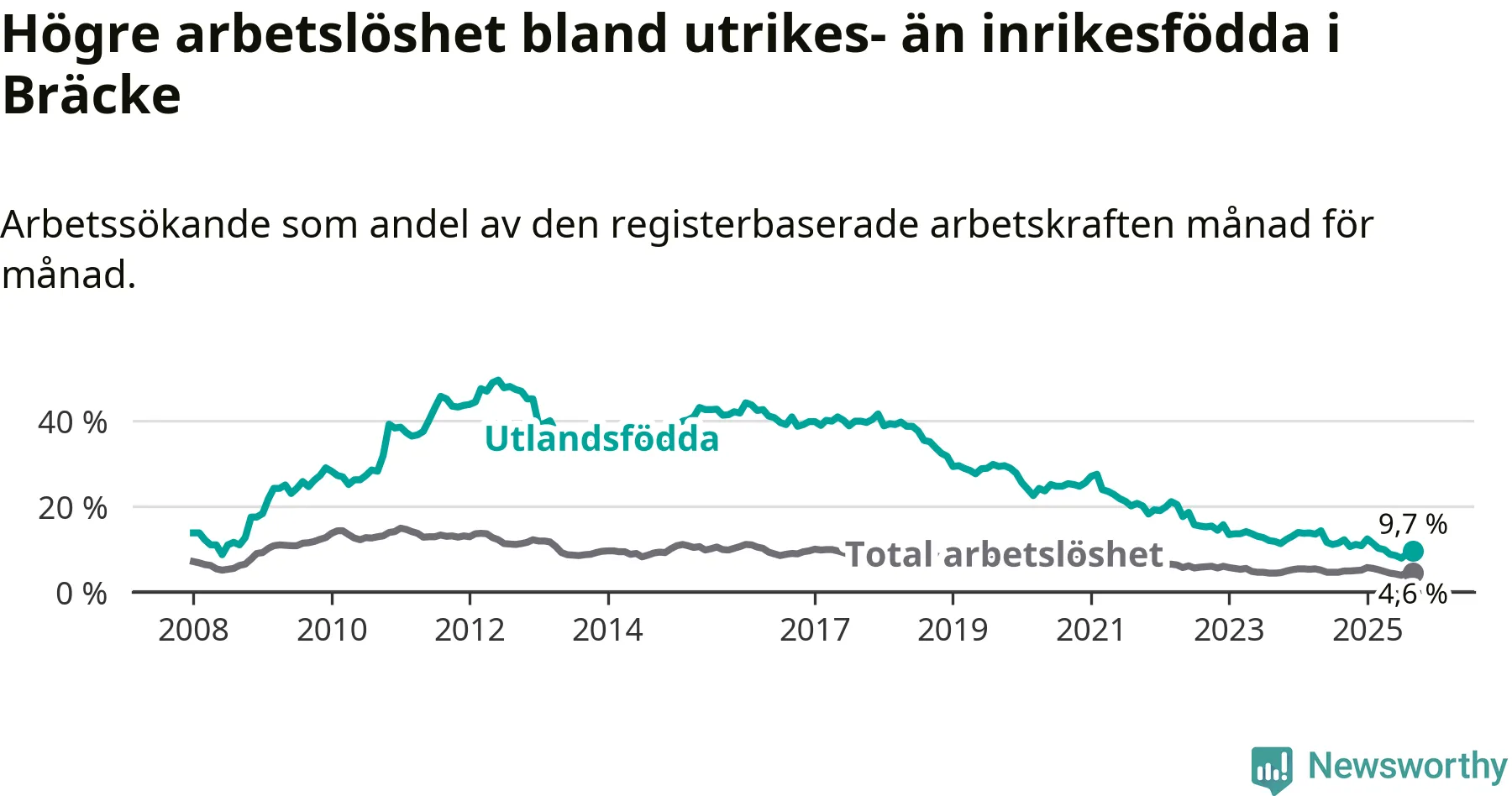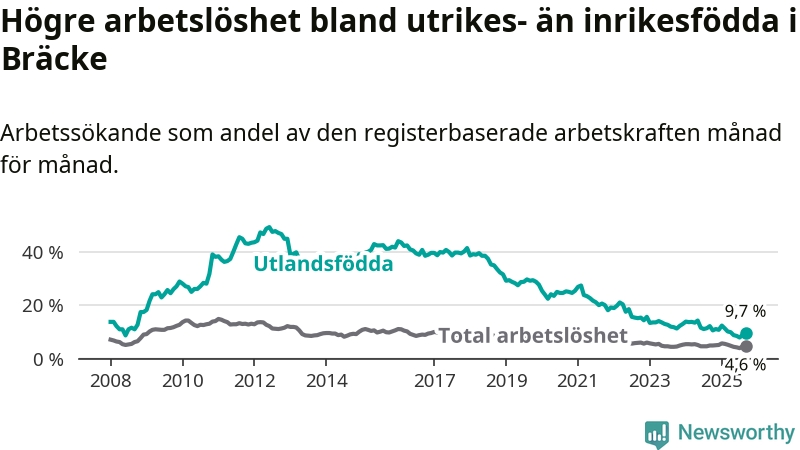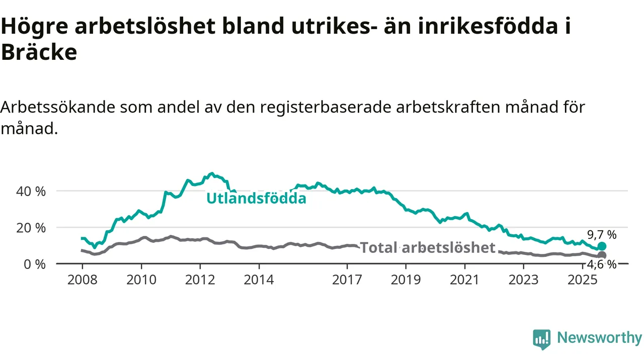 Arbetslösheten bland utlandsfödda var 9,7 procent i Bräcke under september månad, motsvarande 37 av 381 personer. Det är 2,5 procentenheter färre än vid samma tidpunkt i fjol (−8 om man räknar personer). Därmed är de utlandsföddas arbetslöshet lägre än vid samma tidpunkt i fjol för tolfte månaden i följd. Sedan september 2024 har arbetslösheten bland utlandsfödda minskat från 12,2 till 9,7 procent.