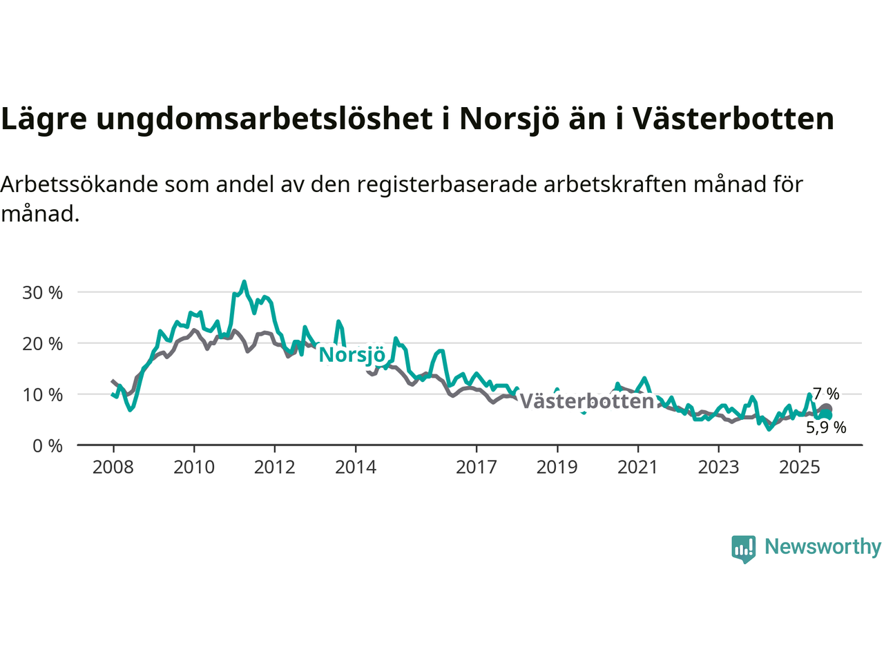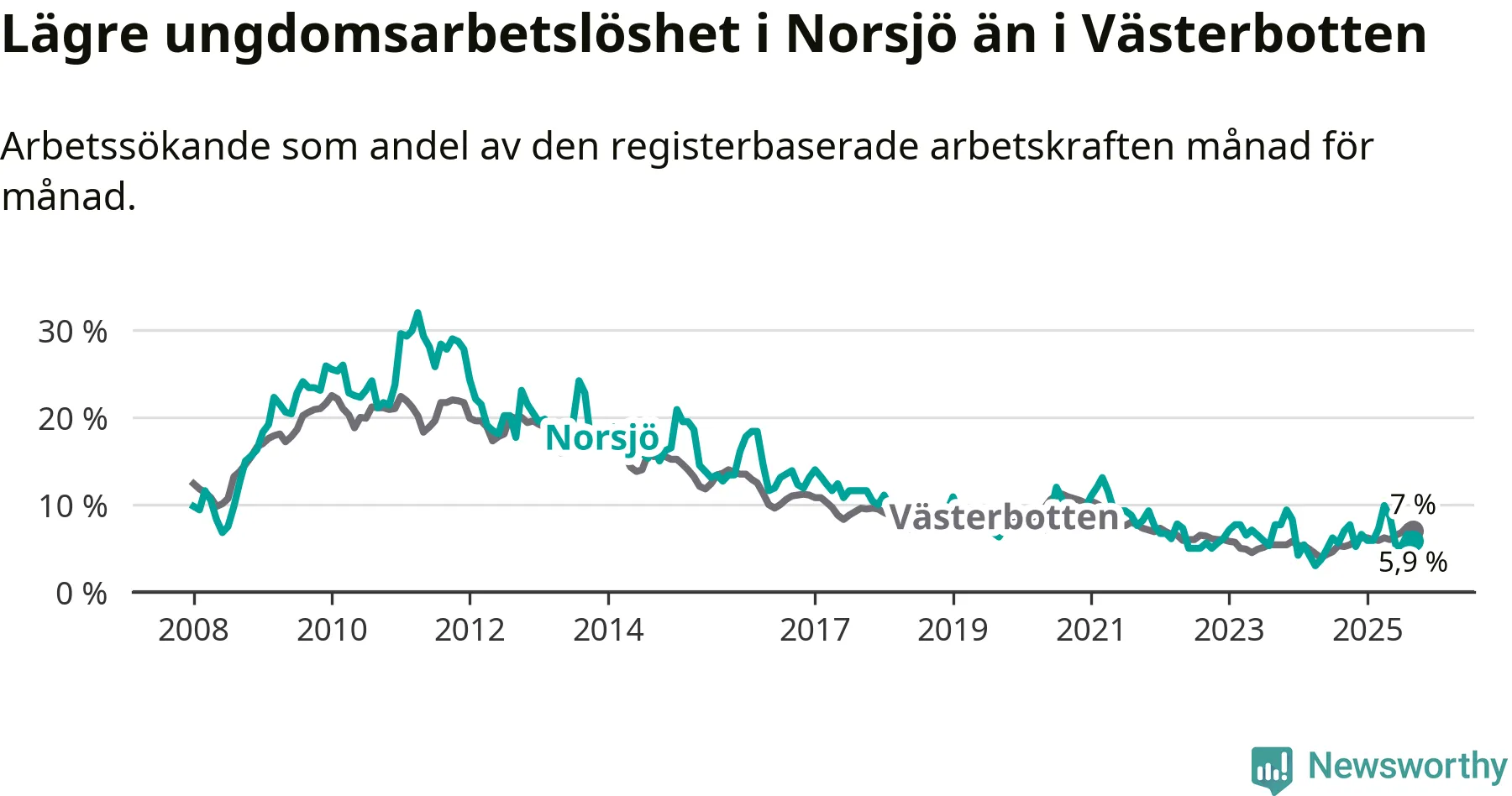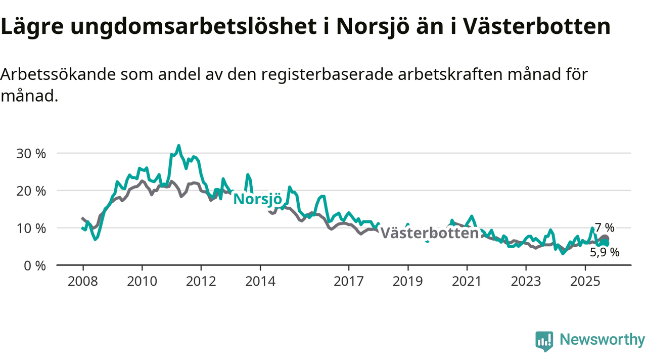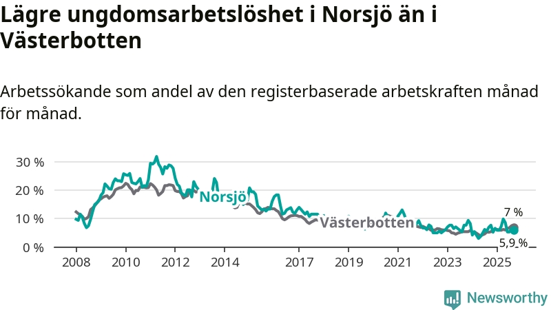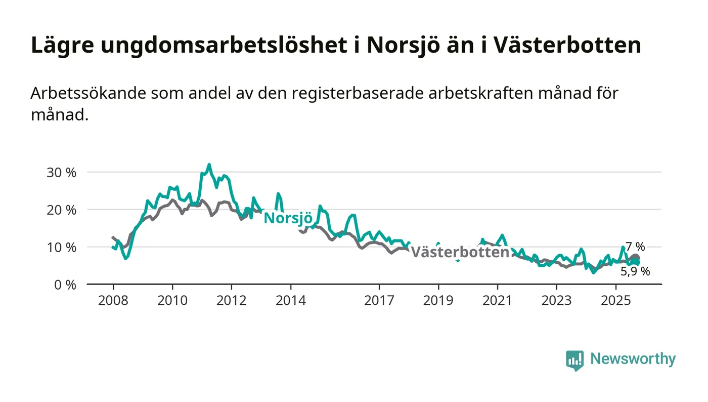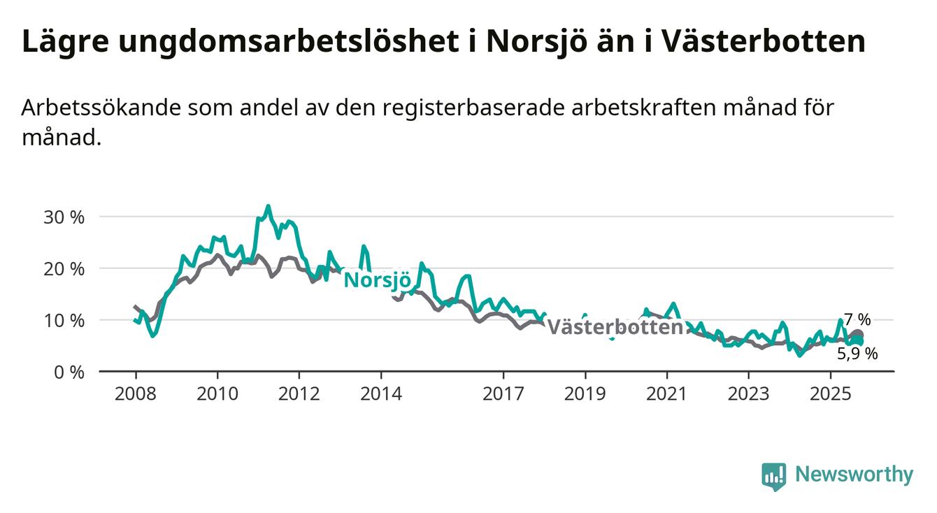 Precis som den totala arbetslösheten ligger ungdomsarbetslösheten i Norsjö lägre än i Västerbotten som helhet. Skillnaden mellan kommunen och länet är 1,1 procentenheter.
