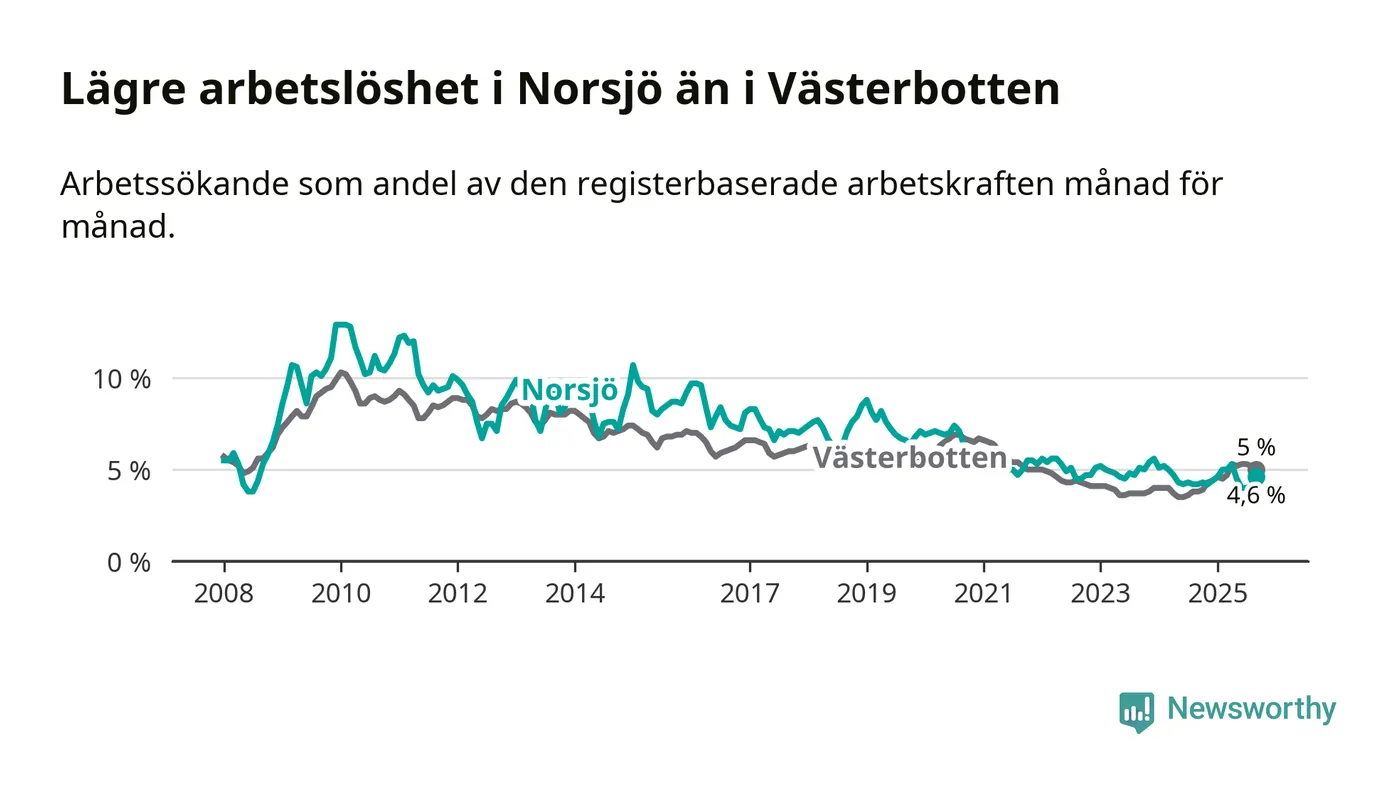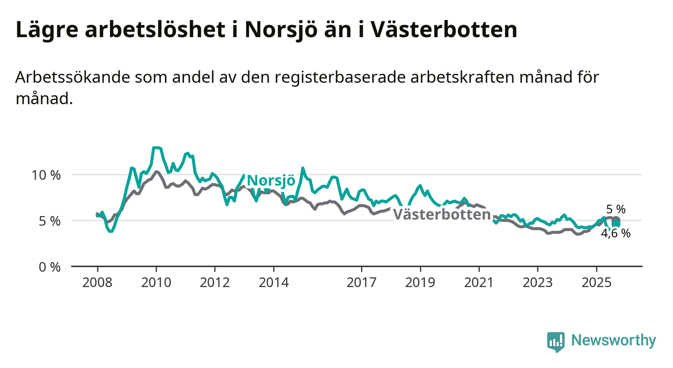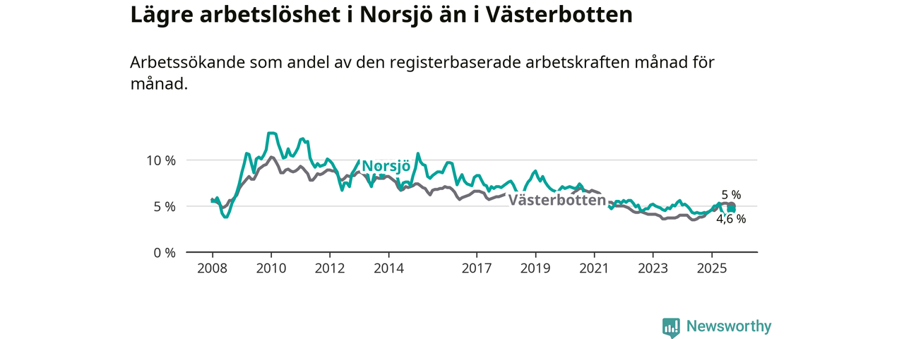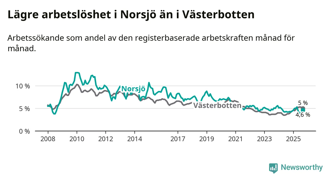 Under september månad rapporterade Norsjö kommun en total arbetslöshet på 4,6 procent. Det är en ökning jämfört med samma tidpunkt i fjol (+0,4 procentenheter). Även i Västerbottens län stiger arbetslösheten .