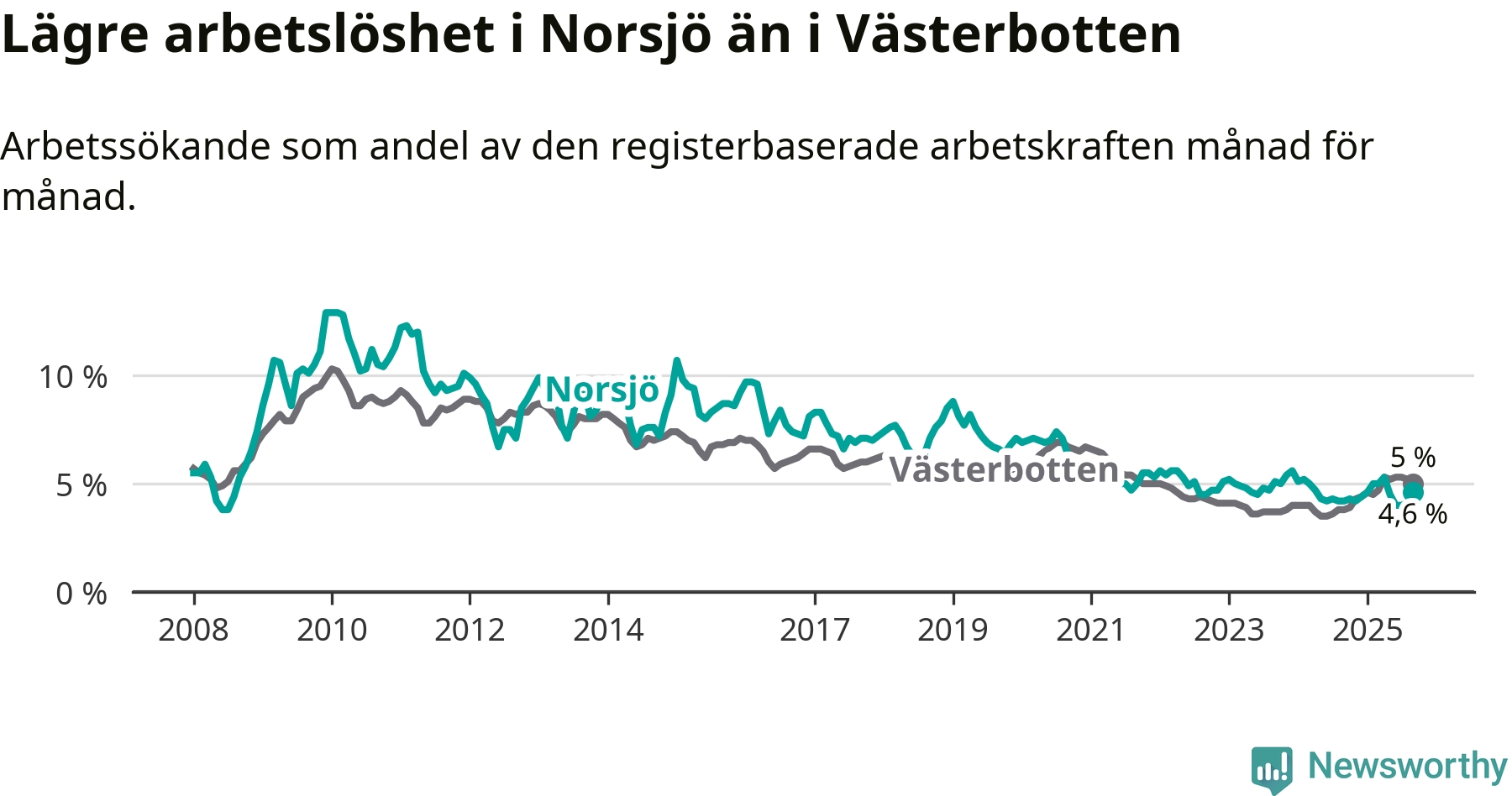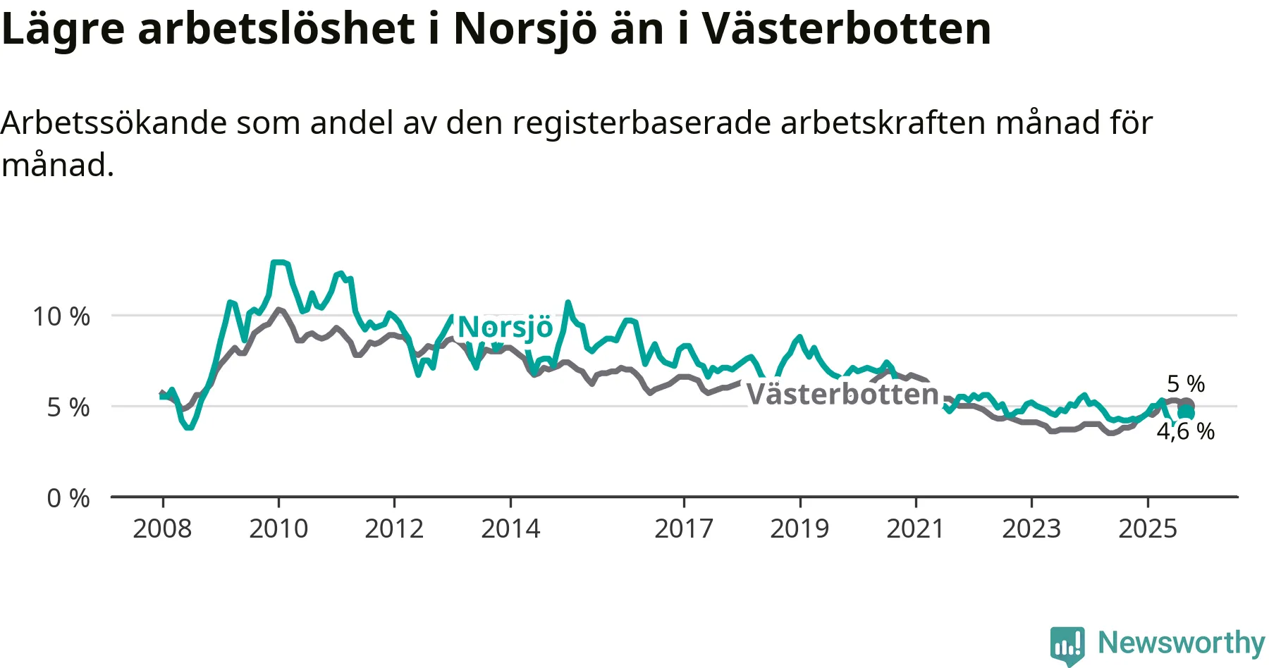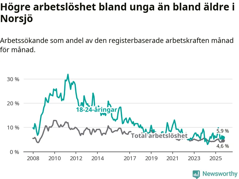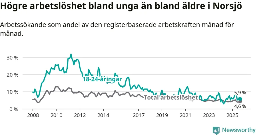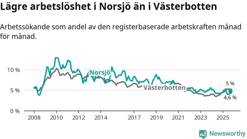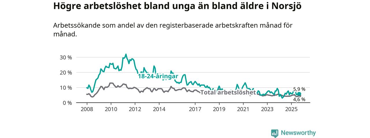 Under september månad rapporterade Norsjö kommun en total arbetslöshet på 4,6 procent. Det är en ökning jämfört med samma tidpunkt i fjol (+0,4 procentenheter). Även i Västerbottens län stiger arbetslösheten .