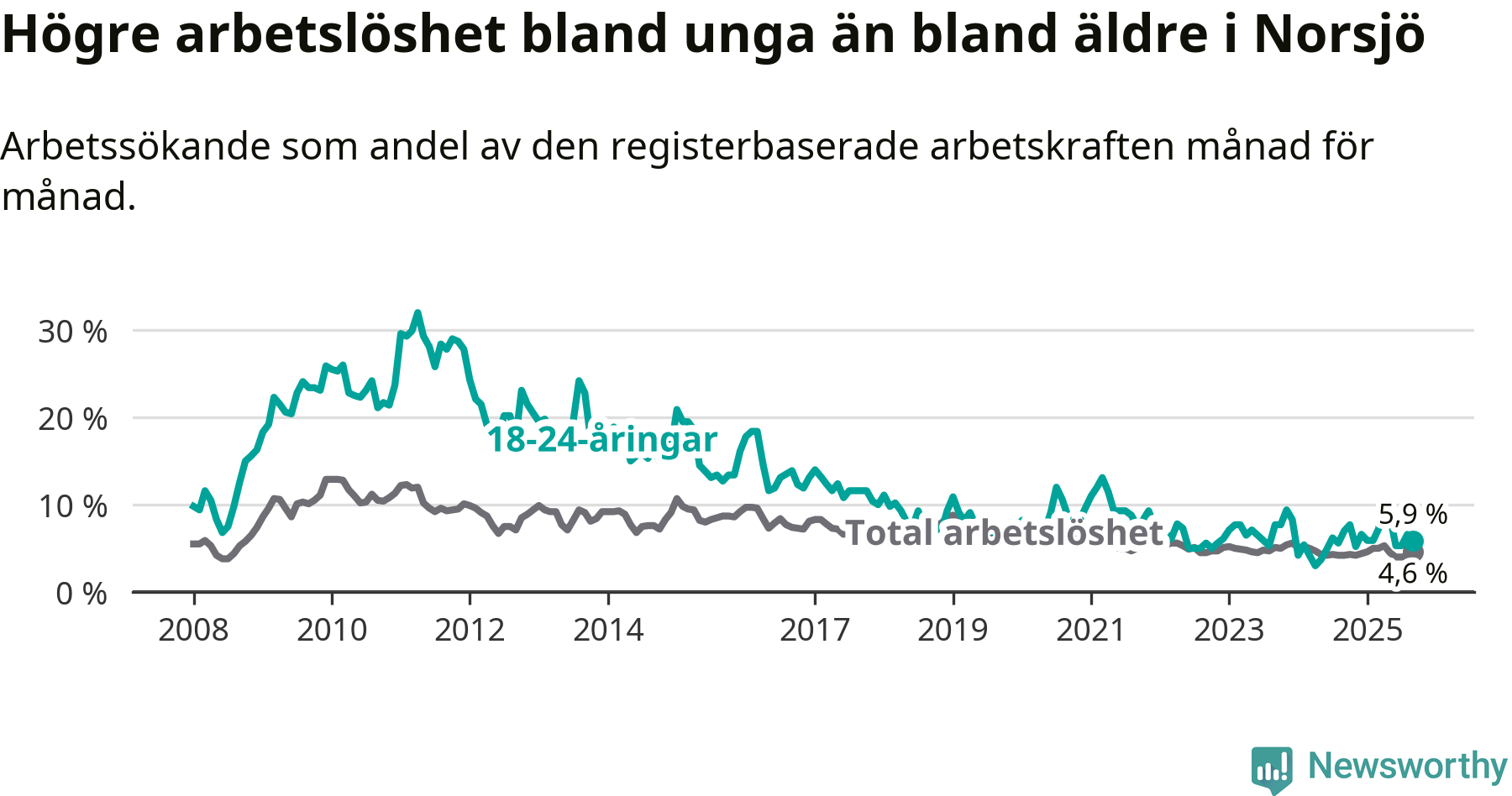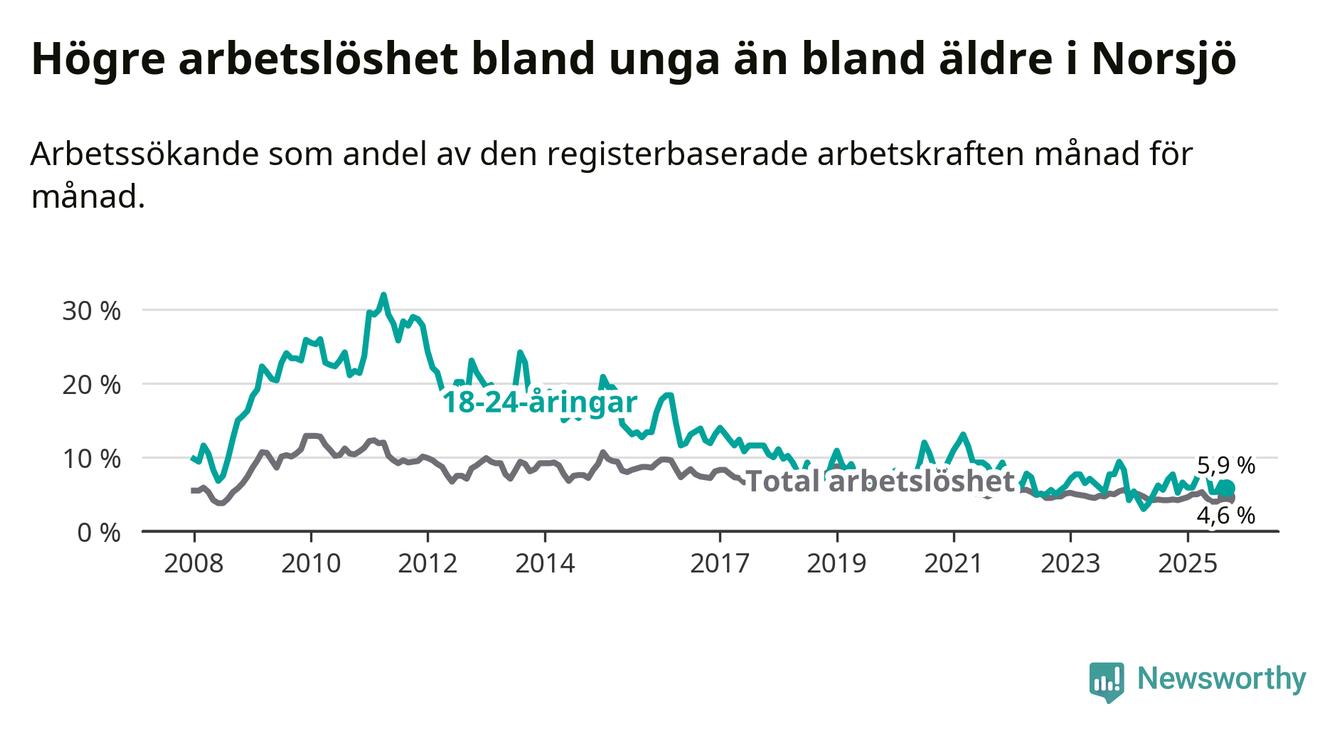 Till skillnad från den totala arbetslösheten sjunker arbetslösheten bland unga (−1,1 procentenheter). I september var 5,9 procent av 18–24-åringarna inskrivna som arbetssökande (motsvarande nio personer). Mäter vi antalet inskrivna ser vi en minskning med två personer på ett års sikt.
