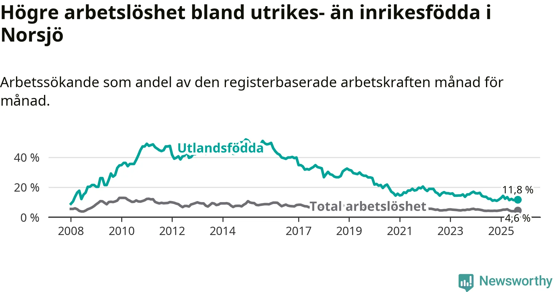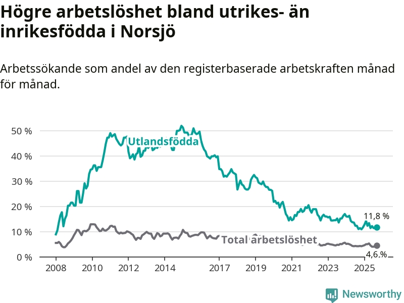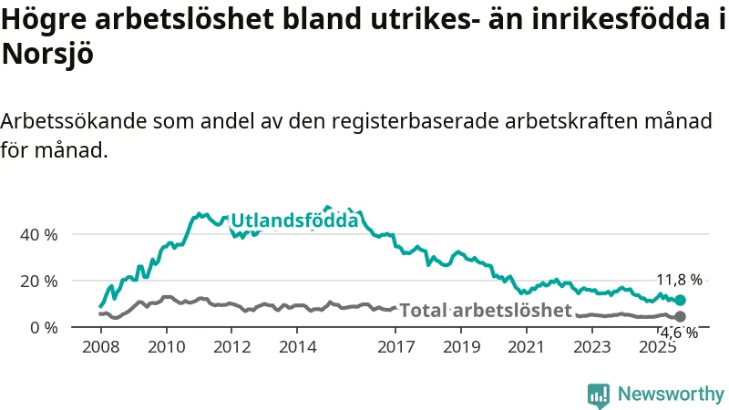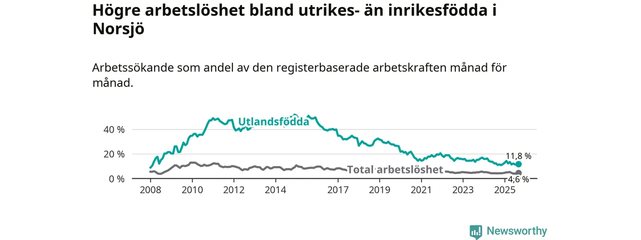 Arbetslösheten bland utlandsfödda var 11,8 procent i Norsjö under september månad, motsvarande 30 av 254 personer. Det är 0,8 procentenheter fler än vid samma tidpunkt i fjol (+3 om man räknar personer). Den senaste månadens uppgång innebär ett trendbrott. Under de 17 föregående månaderna hade arbetslösheten bland utlandsfödda varit lägre än motsvarande tidpunkt året innan.