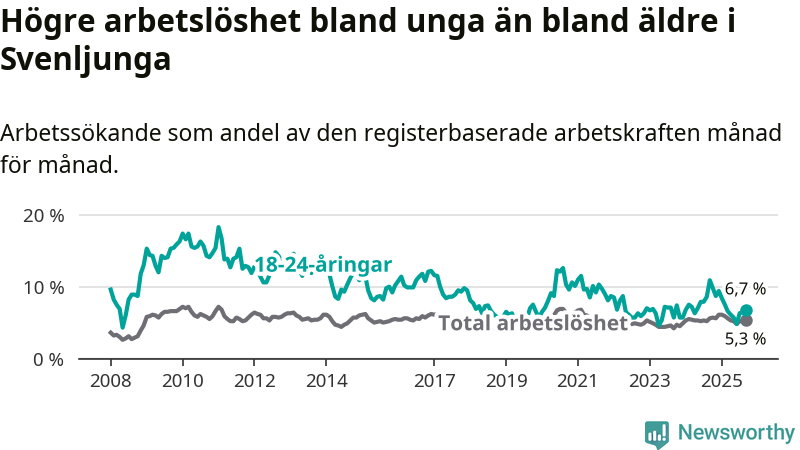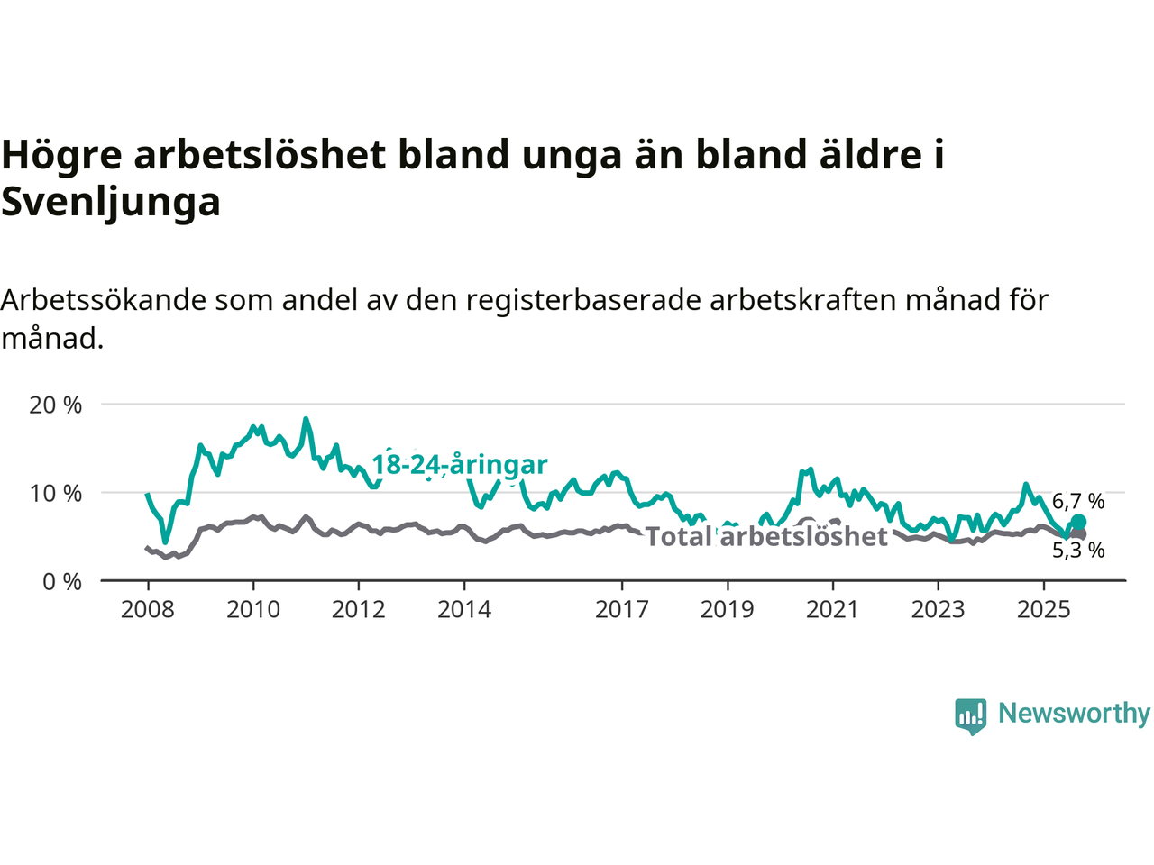 Den senaste månadsstatistiken från Arbetsförmedlingen visar på en nedgång i ungdomsarbetslöshet i Svenljunga kommun med 4,2 procentenheter. Arbetslösheten bland personer i åldern 18–24 år låg i september på 6,7 procent.