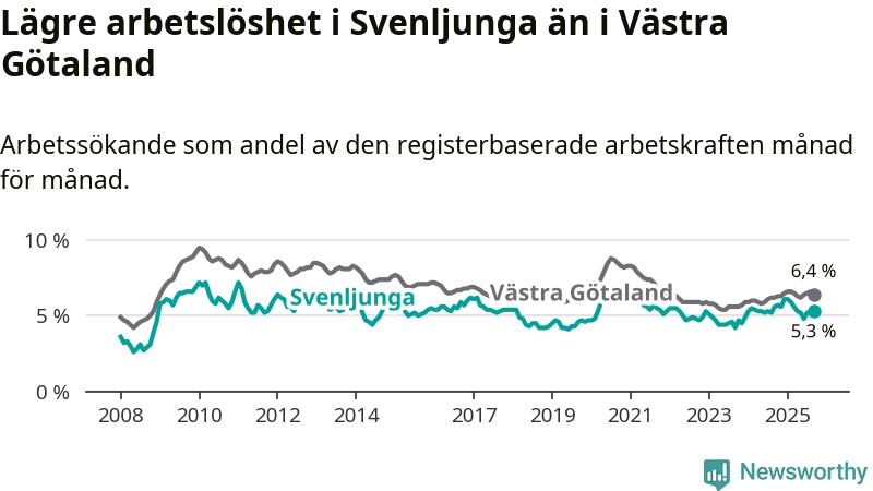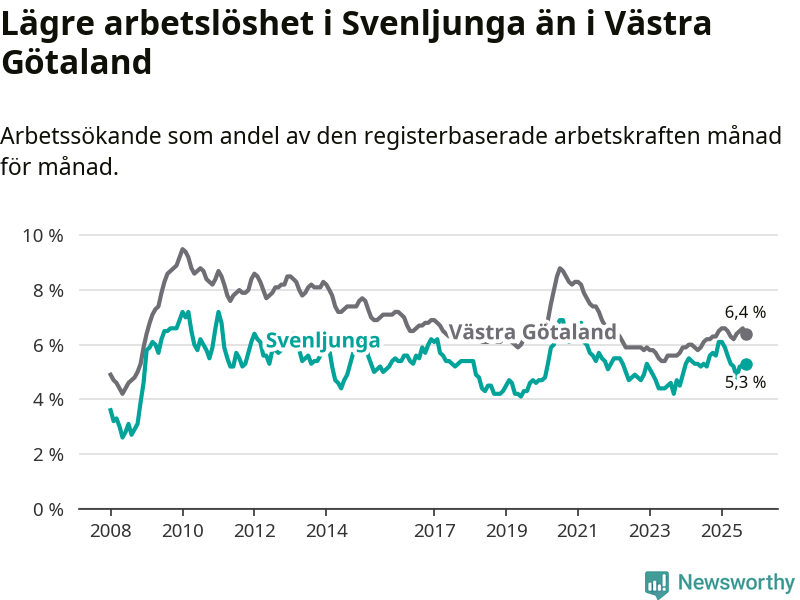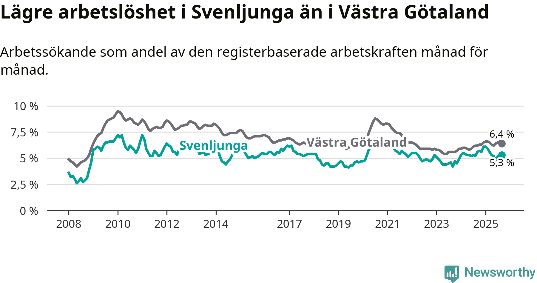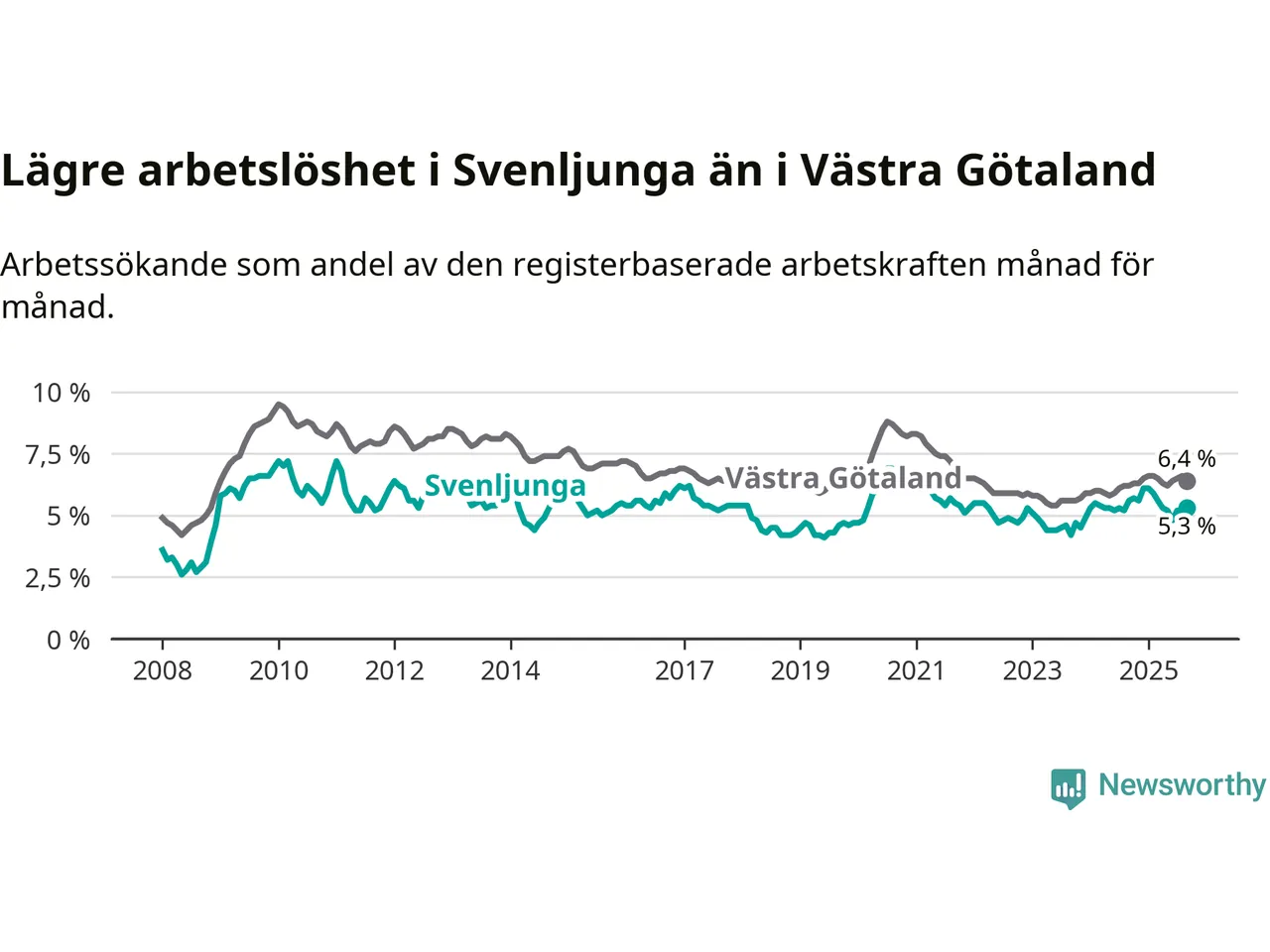 Under september månad rapporterade Svenljunga kommun en total arbetslöshet på 5,3 procent. Det är en minskning jämfört med samma tidpunkt i fjol (−0,3 procentenheter). I Västra Götalands län däremot stiger arbetslösheten .