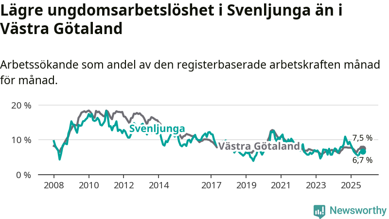I och med den senaste månadens nedgång har de ungas arbetslöshet i Svenljunga sjunkit sju månader i följd (ner från 7,5 procent i februari till 6,7 procent nu).