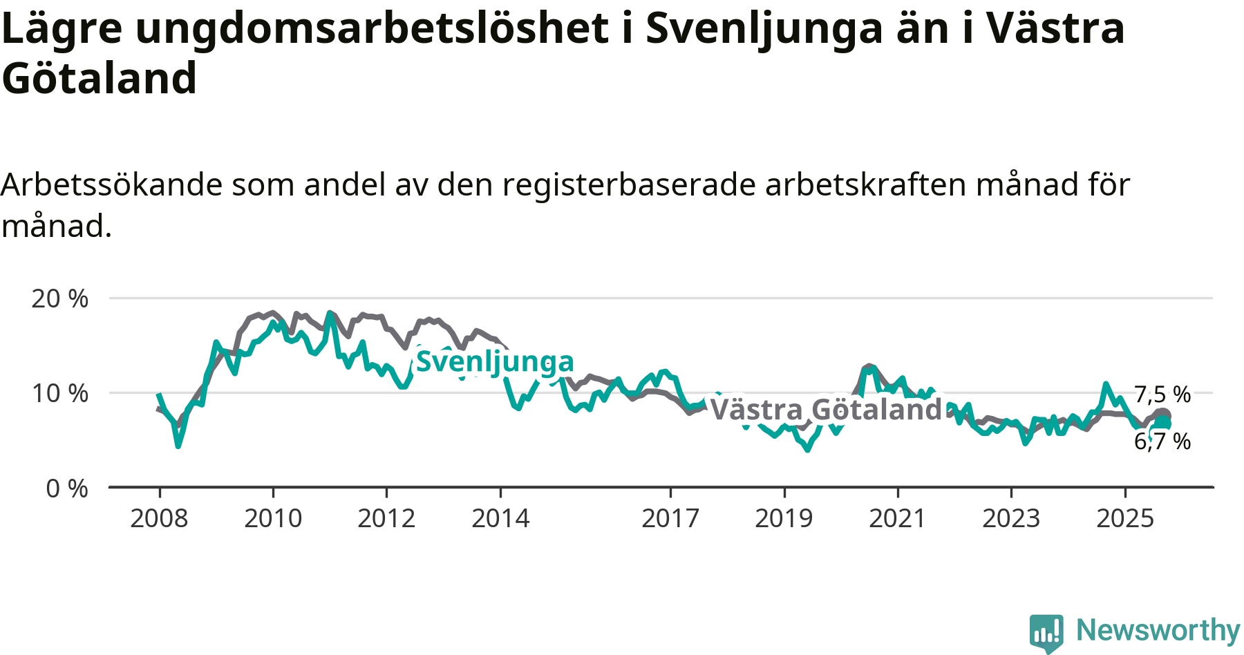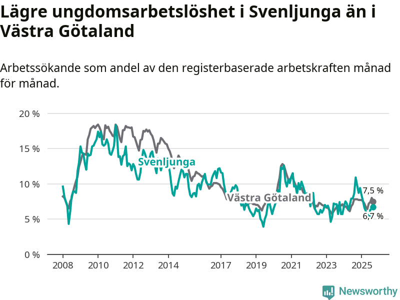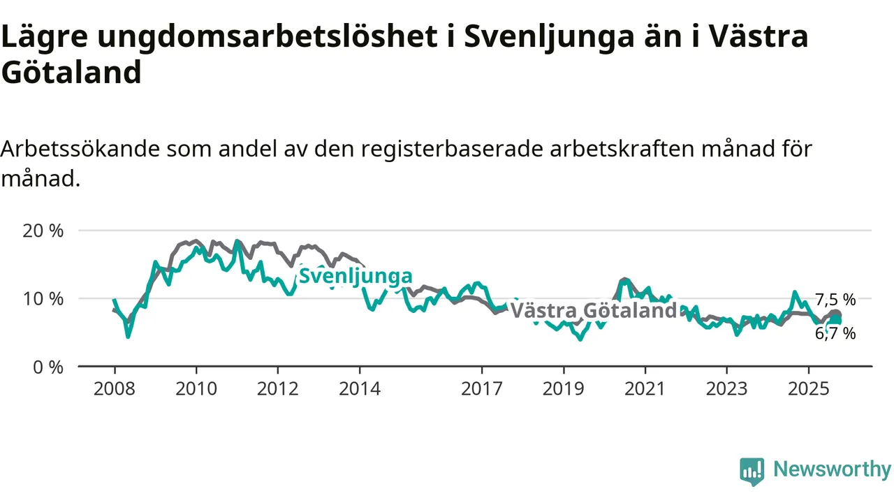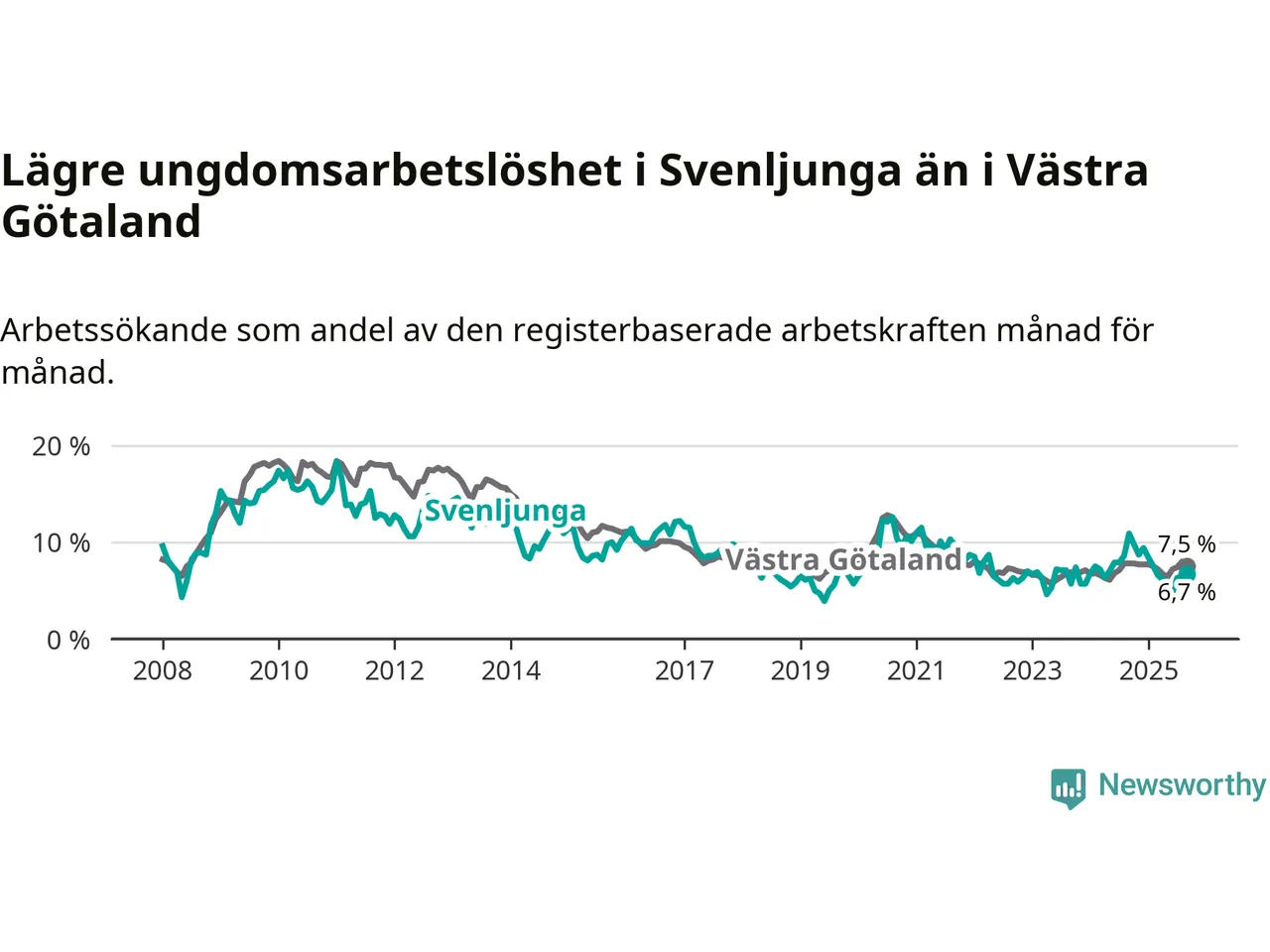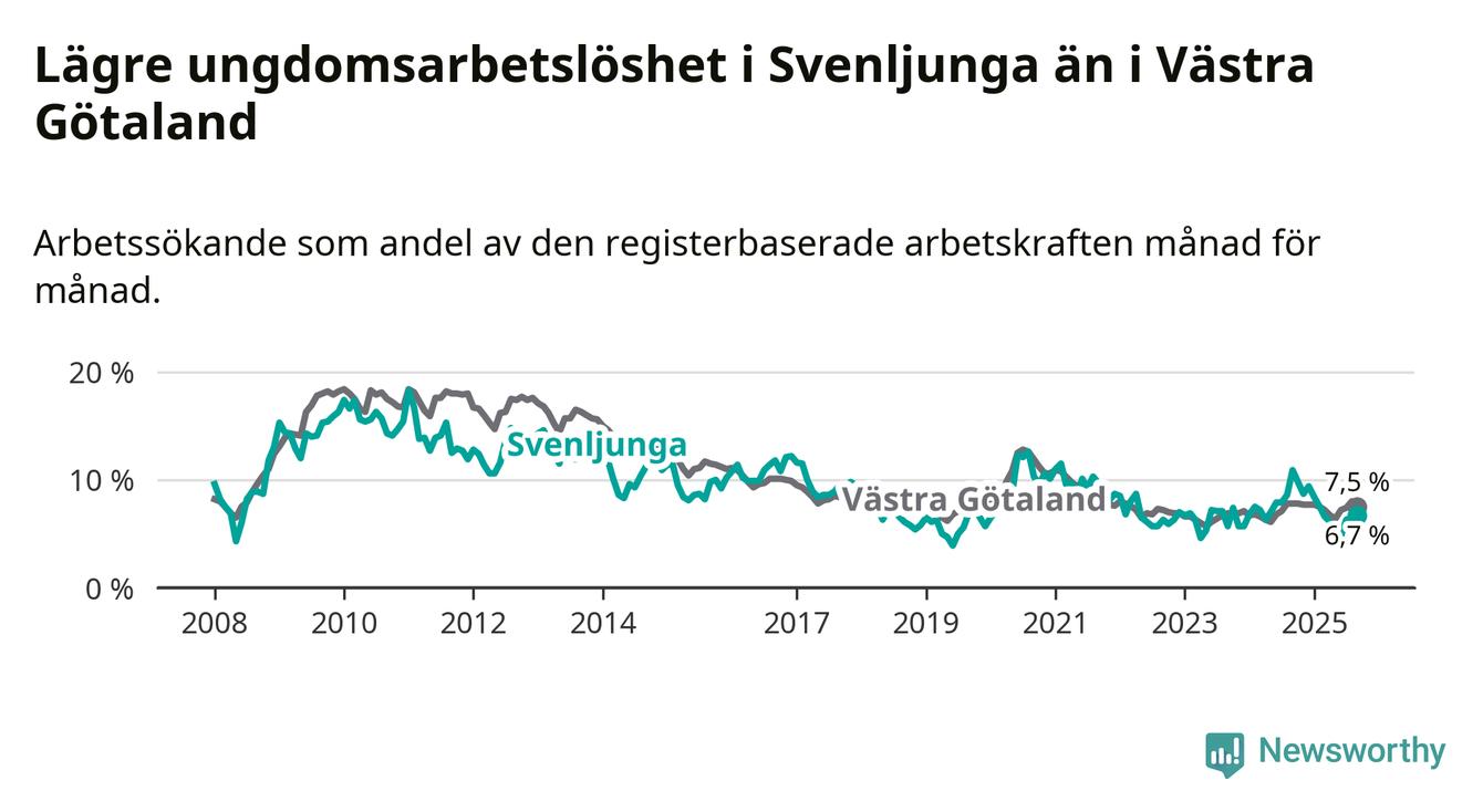 Precis som den totala arbetslösheten ligger ungdomsarbetslösheten i Svenljunga lägre än i Västra Götaland som helhet. Skillnaden mellan kommunen och länet är 0,8 procentenheter.