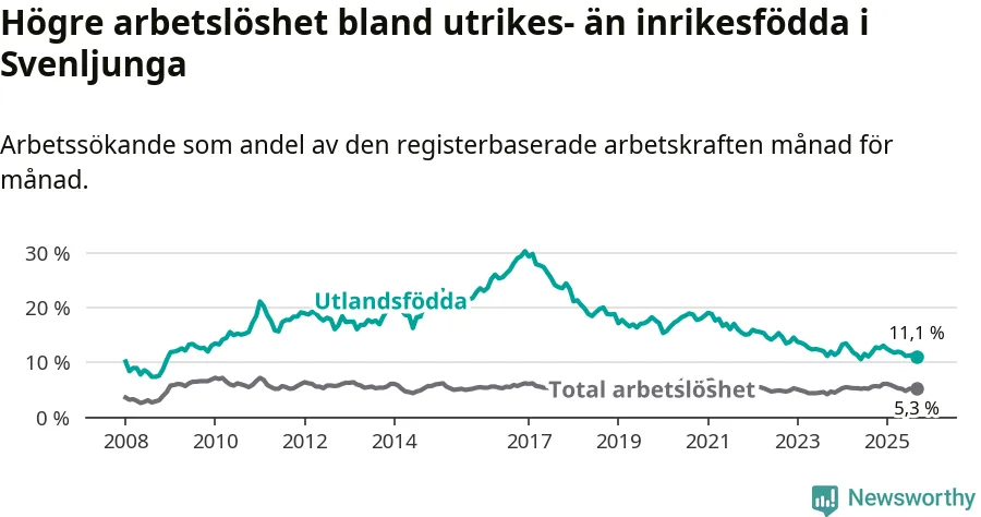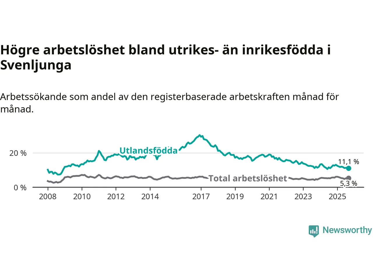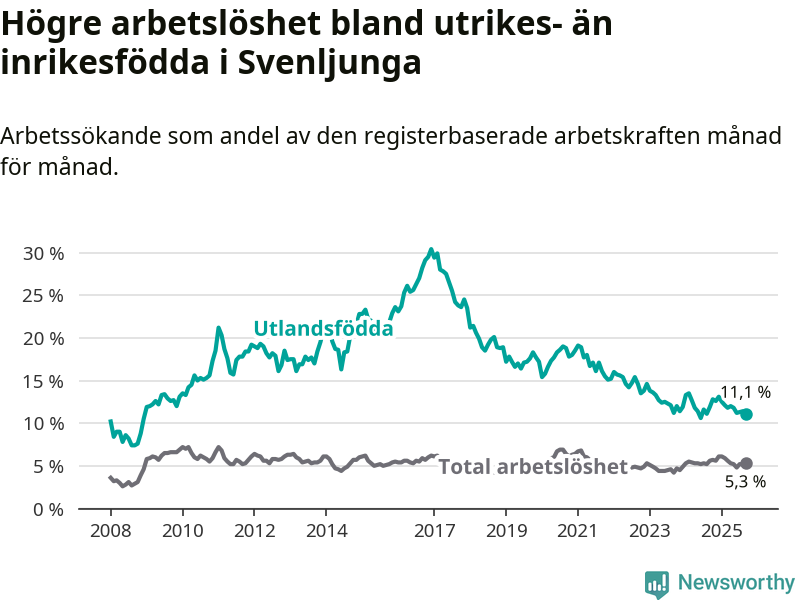 Arbetslösheten bland utlandsfödda var 11,1 procent i Svenljunga under september månad, motsvarande 95 av 856 personer. Det är 0,8 procentenheter färre än vid samma tidpunkt i fjol (−8 om man räknar personer). Den senaste månadens nedgång innebär ett trendbrott. Under de ett föregående månaderna hade arbetslösheten bland utlandsfödda varit högre än motsvarande tidpunkt året innan.