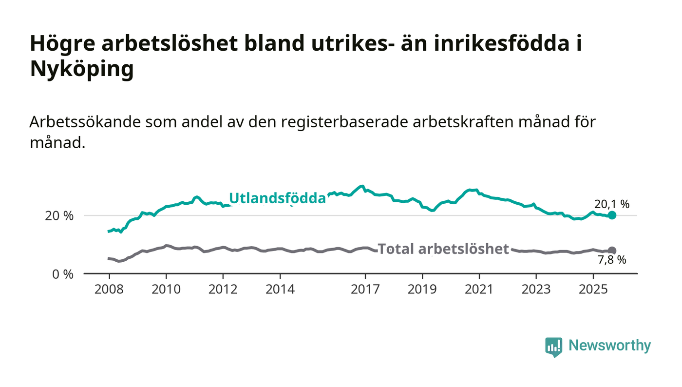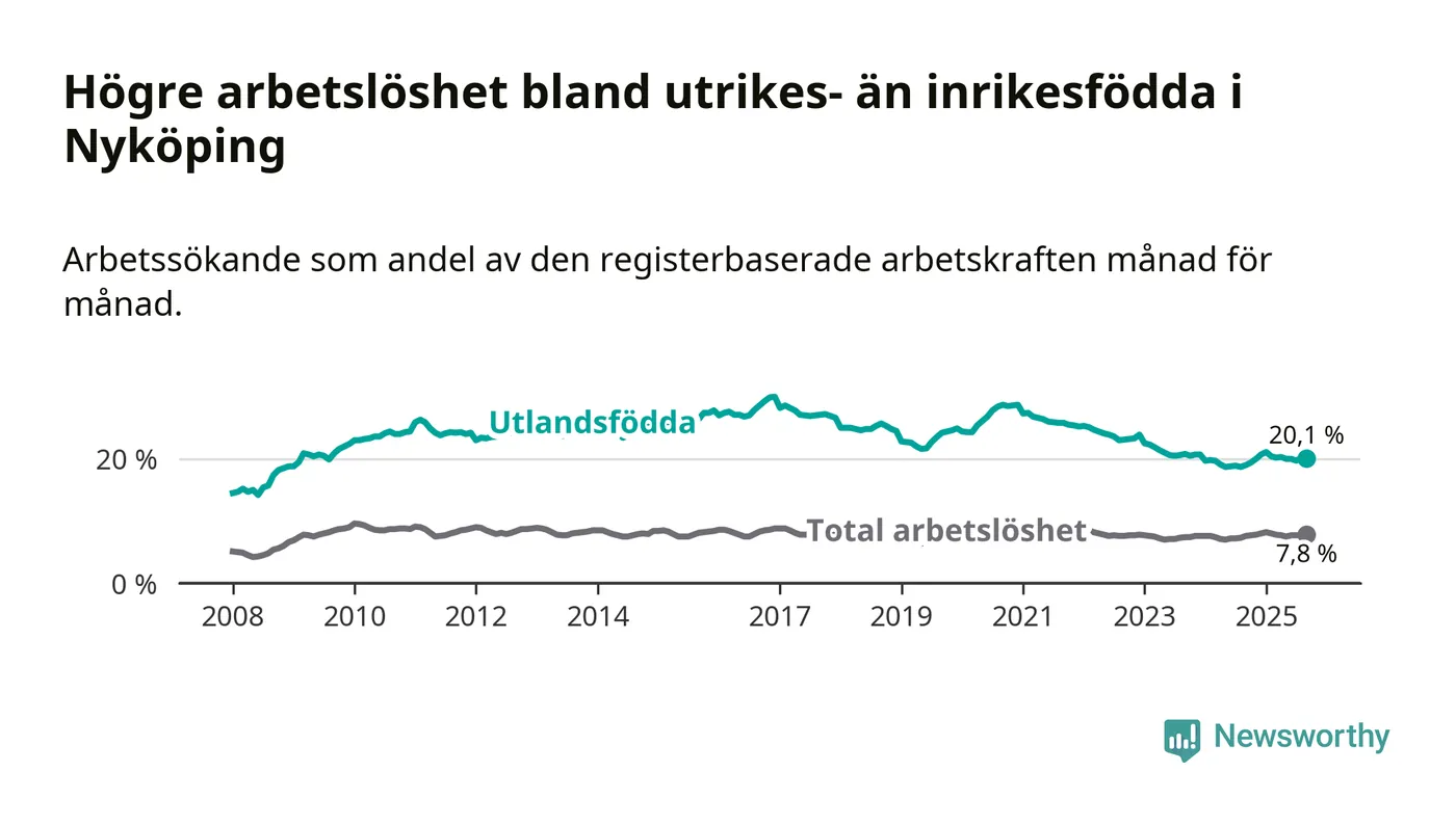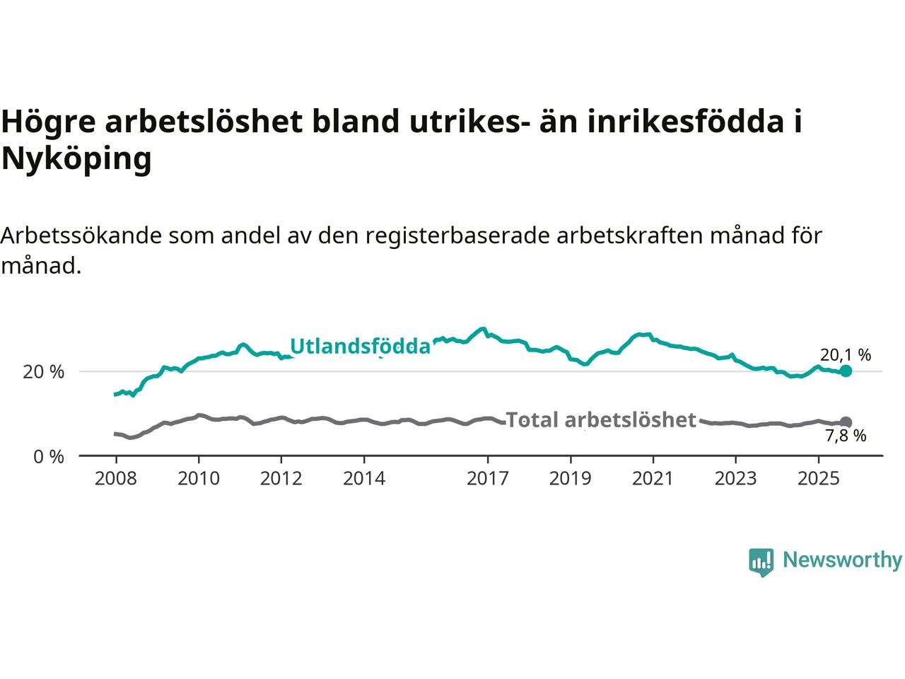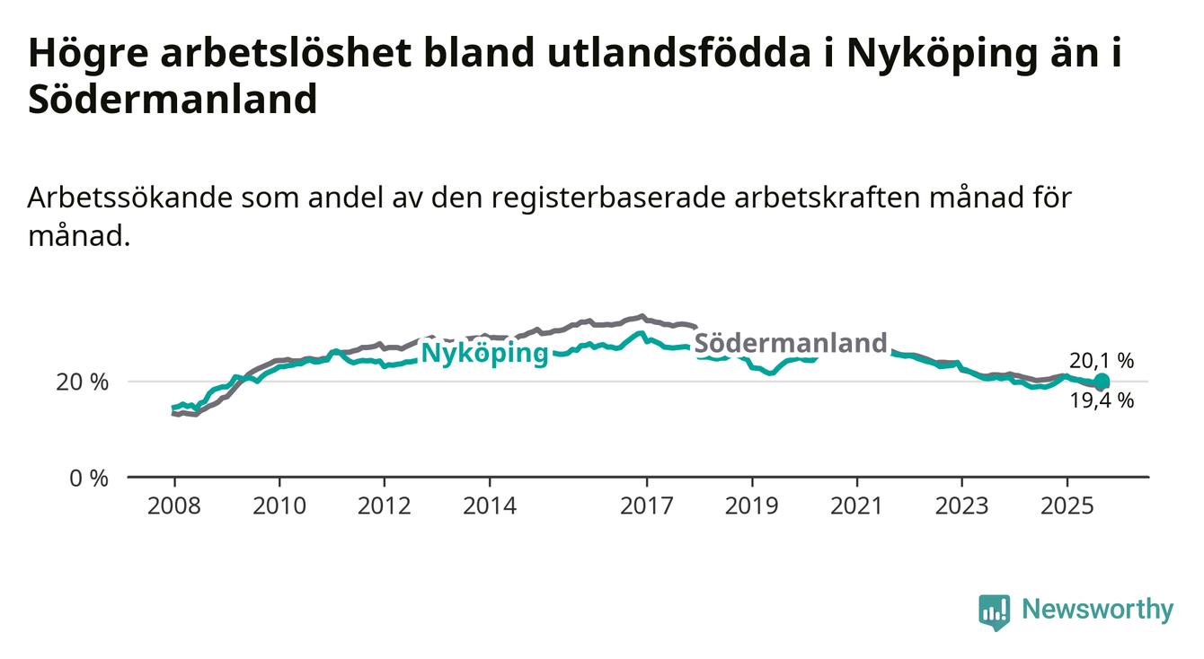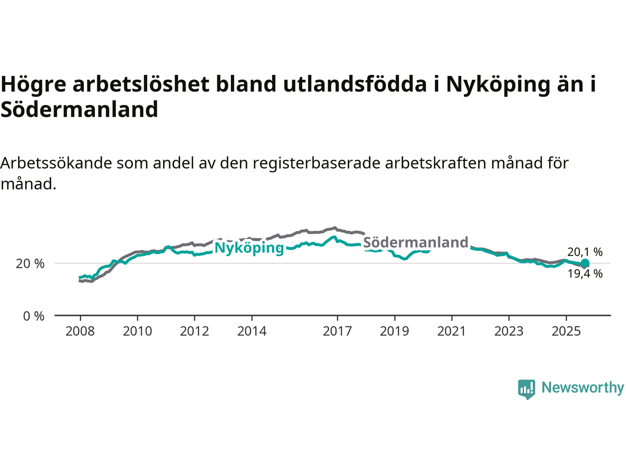Arbetslösheten bland utlandsfödda var 20,1 procent i Nyköping under september månad, motsvarande 1 135 av 5 647 personer. Det är 1,1 procentenheter fler än vid samma tidpunkt i fjol (+83 om man räknar personer). Därmed är de utlandsföddas arbetslöshet högre än vid samma tidpunkt i fjol för nionde månaden i följd.