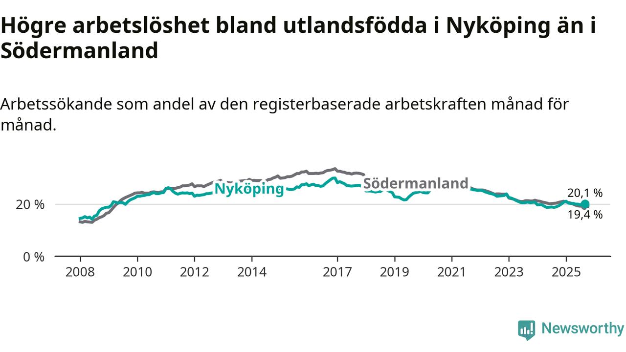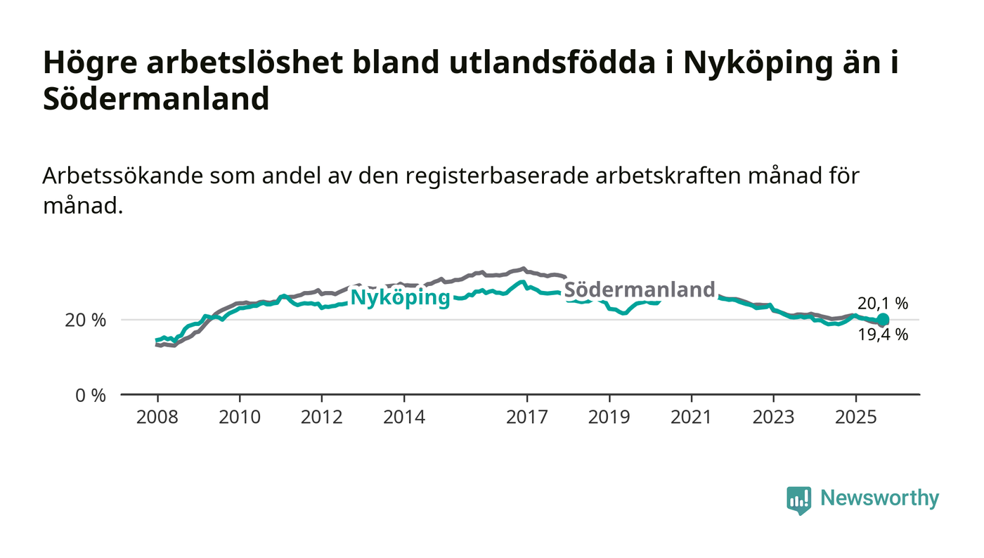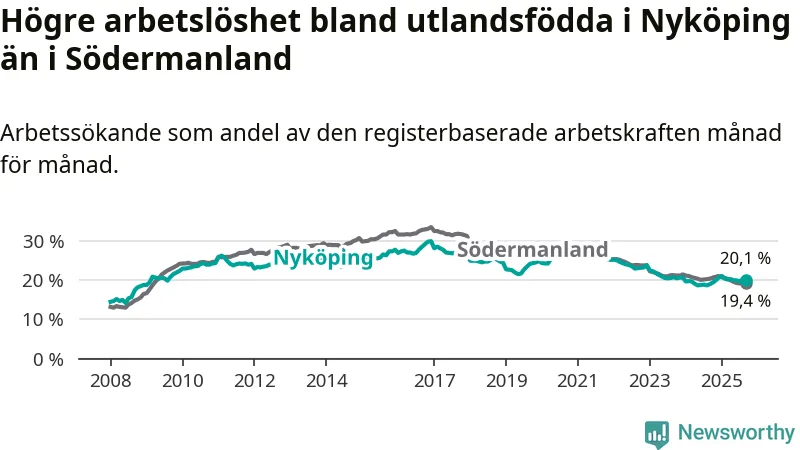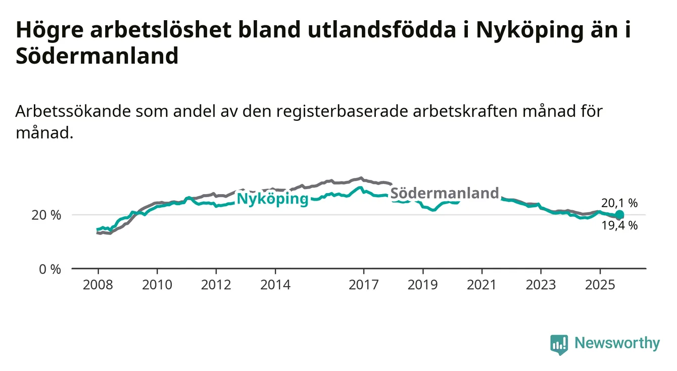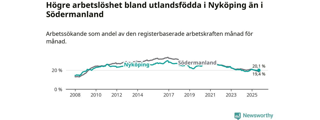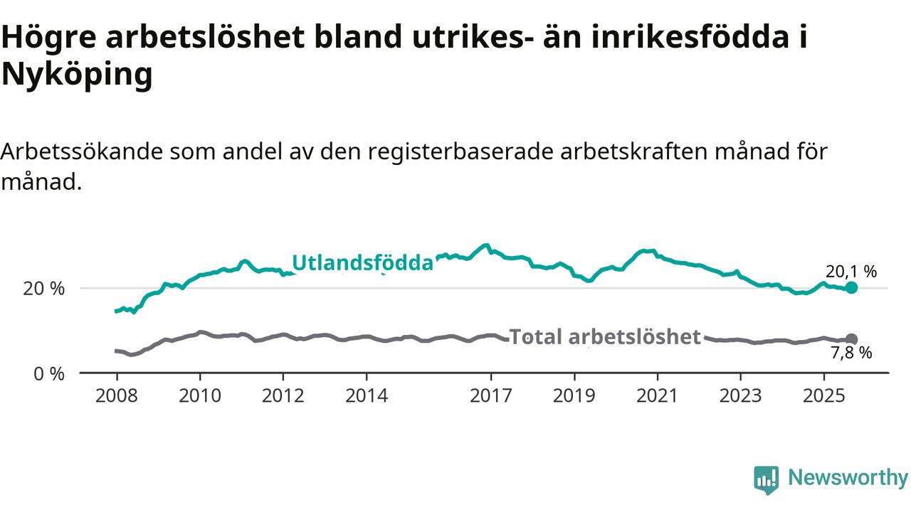 Arbetslösheten bland utlandsfödda var 20,1 procent i Nyköping under september månad, motsvarande 1 135 av 5 647 personer. Det är 1,1 procentenheter fler än vid samma tidpunkt i fjol (+83 om man räknar personer). Därmed är de utlandsföddas arbetslöshet högre än vid samma tidpunkt i fjol för nionde månaden i följd.