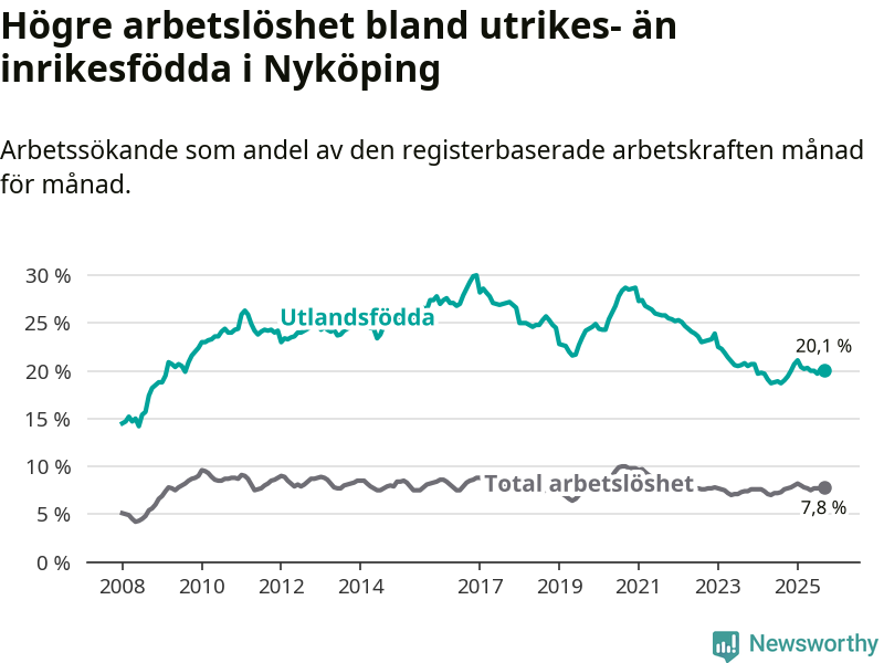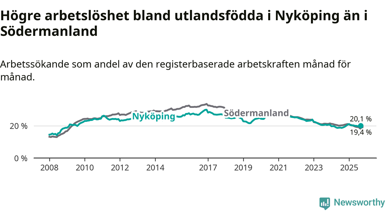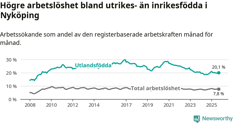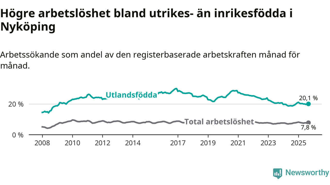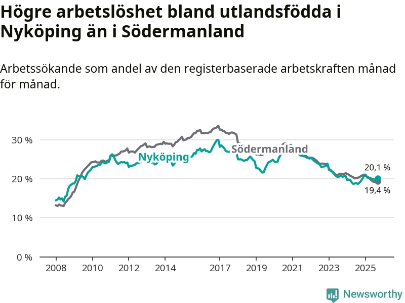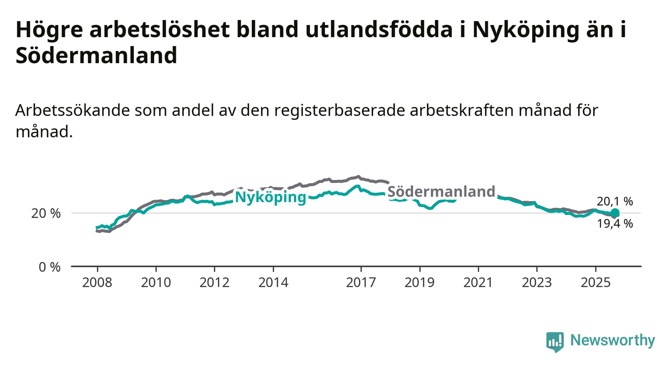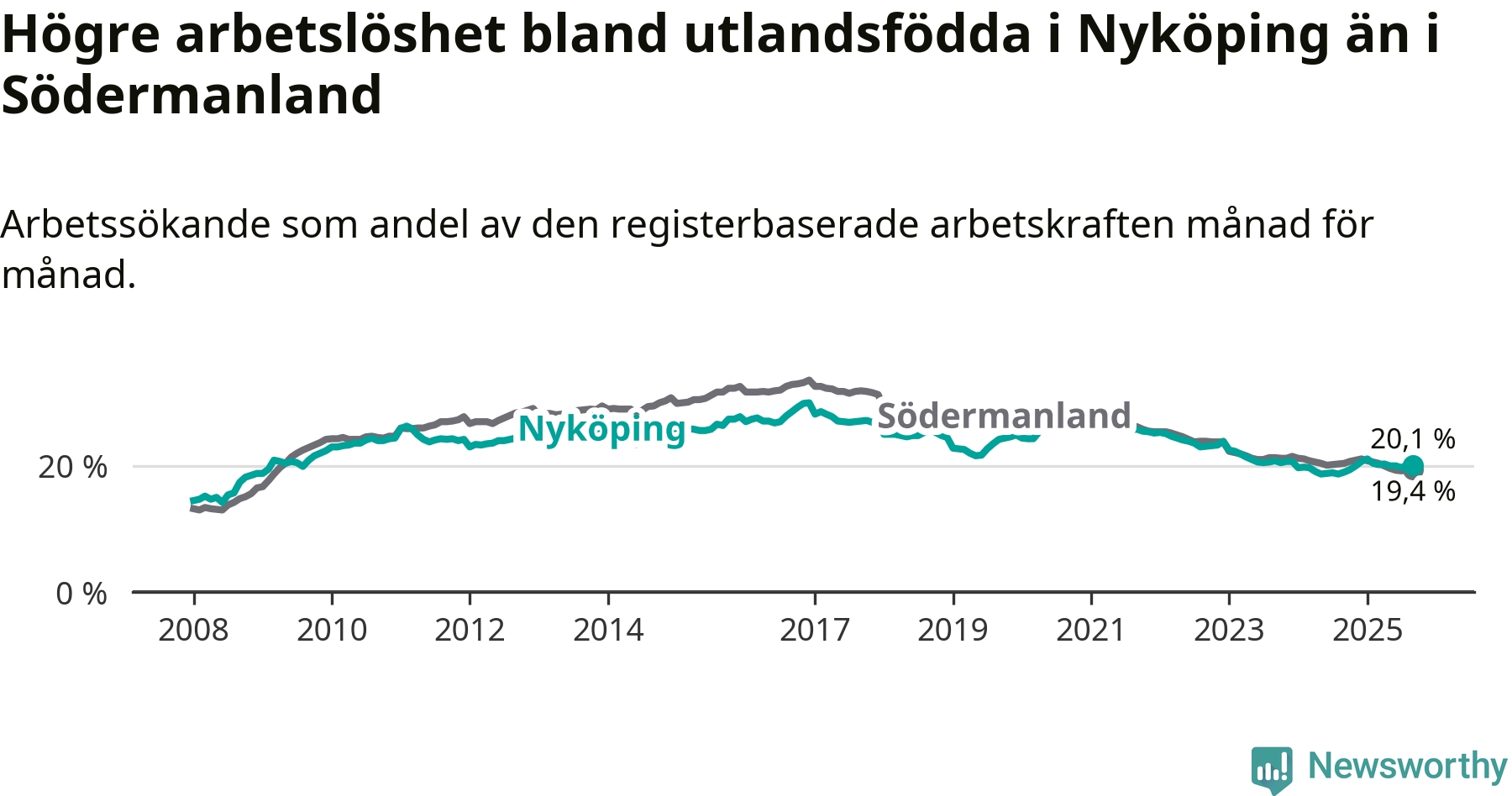 Arbetslösheten bland utlandsfödda var 20,1 procent i Nyköping under september månad, motsvarande 1 135 av 5 647 personer. Det är 1,1 procentenheter fler än vid samma tidpunkt i fjol (+83 om man räknar personer). Därmed är de utlandsföddas arbetslöshet högre än vid samma tidpunkt i fjol för nionde månaden i följd.