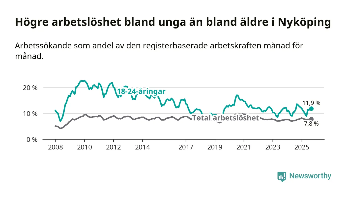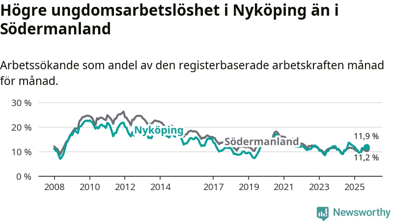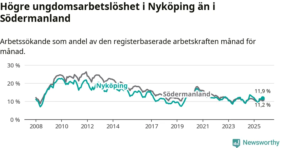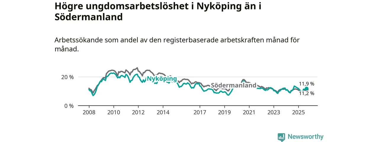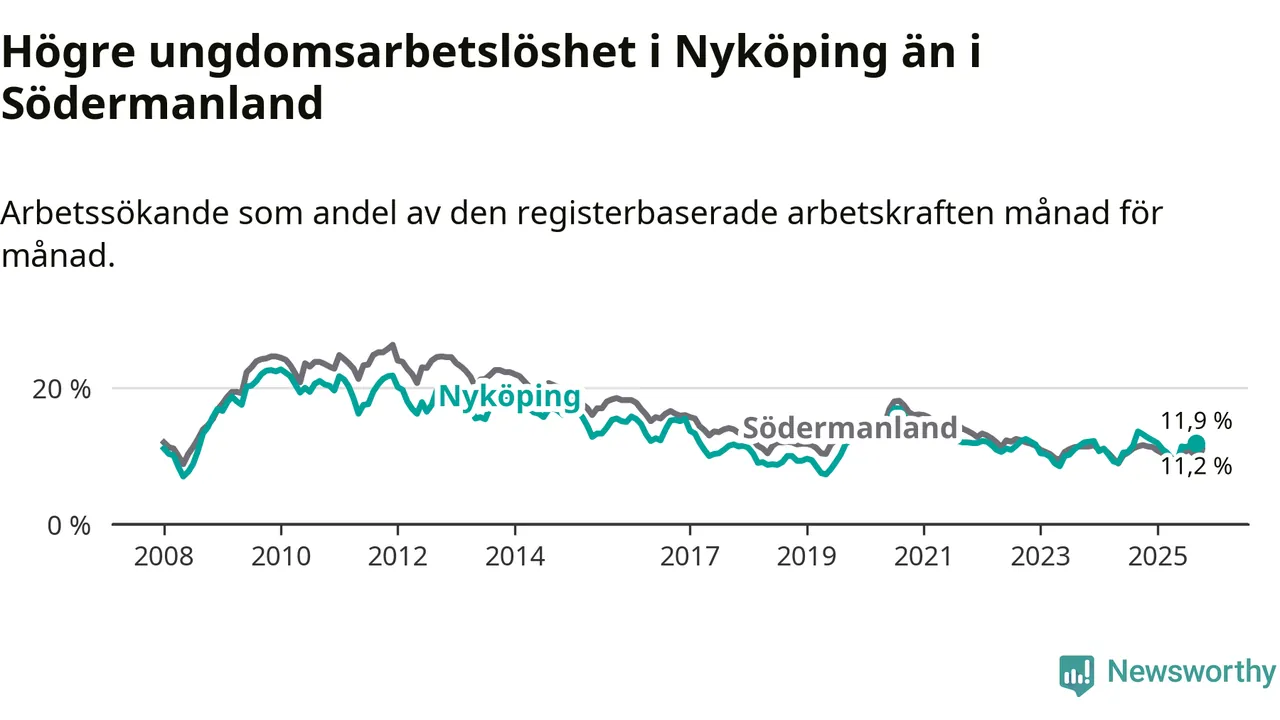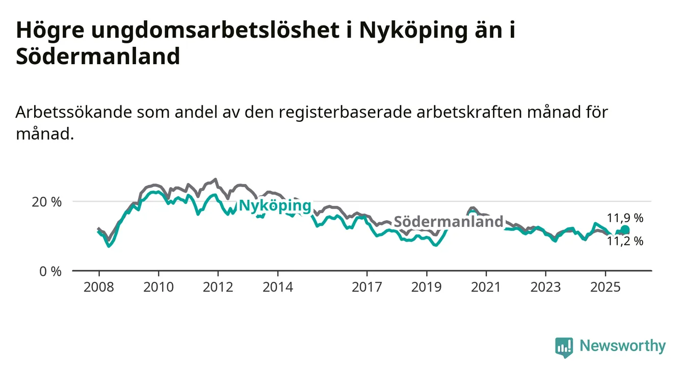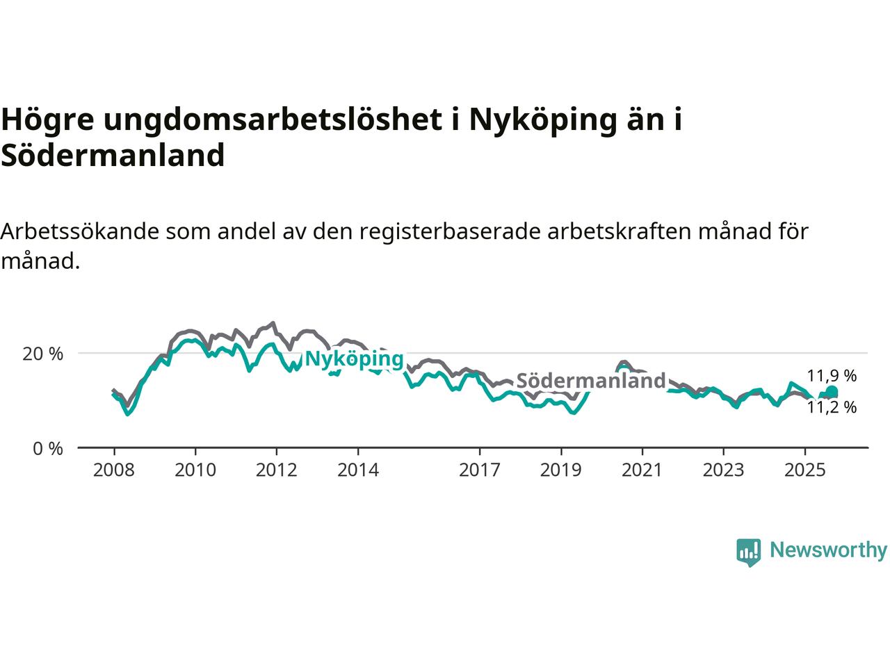 Medan Nyköping har lägre total arbetslöshet än Södermanland, ligger ungdomsarbetslösheten 0,7 procentenheter högre i Nyköping.