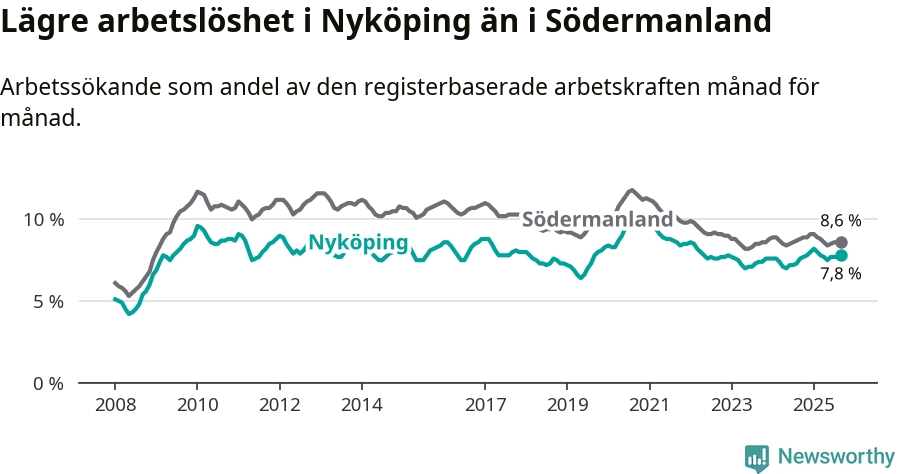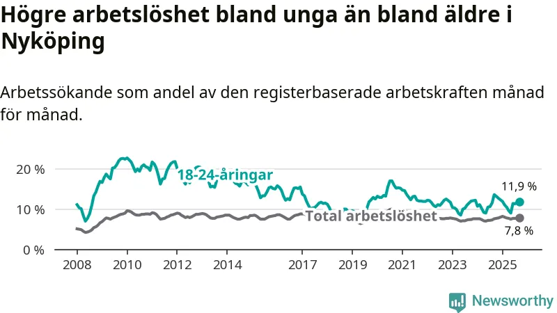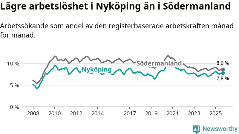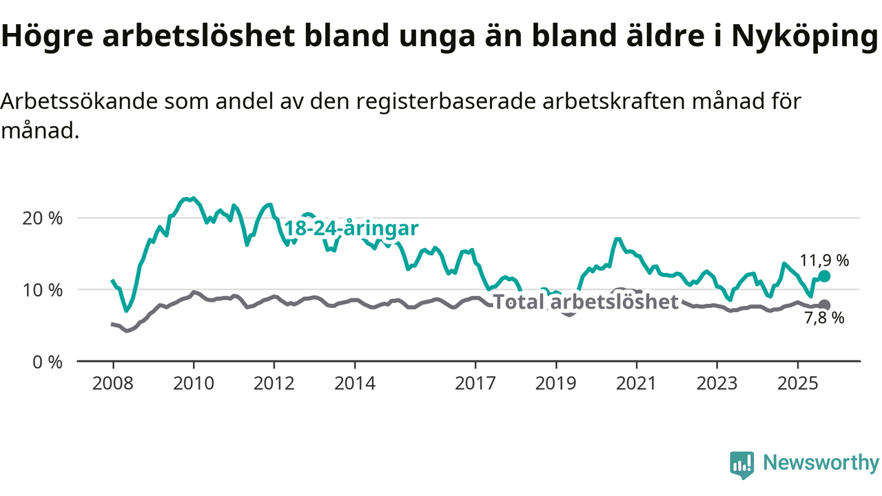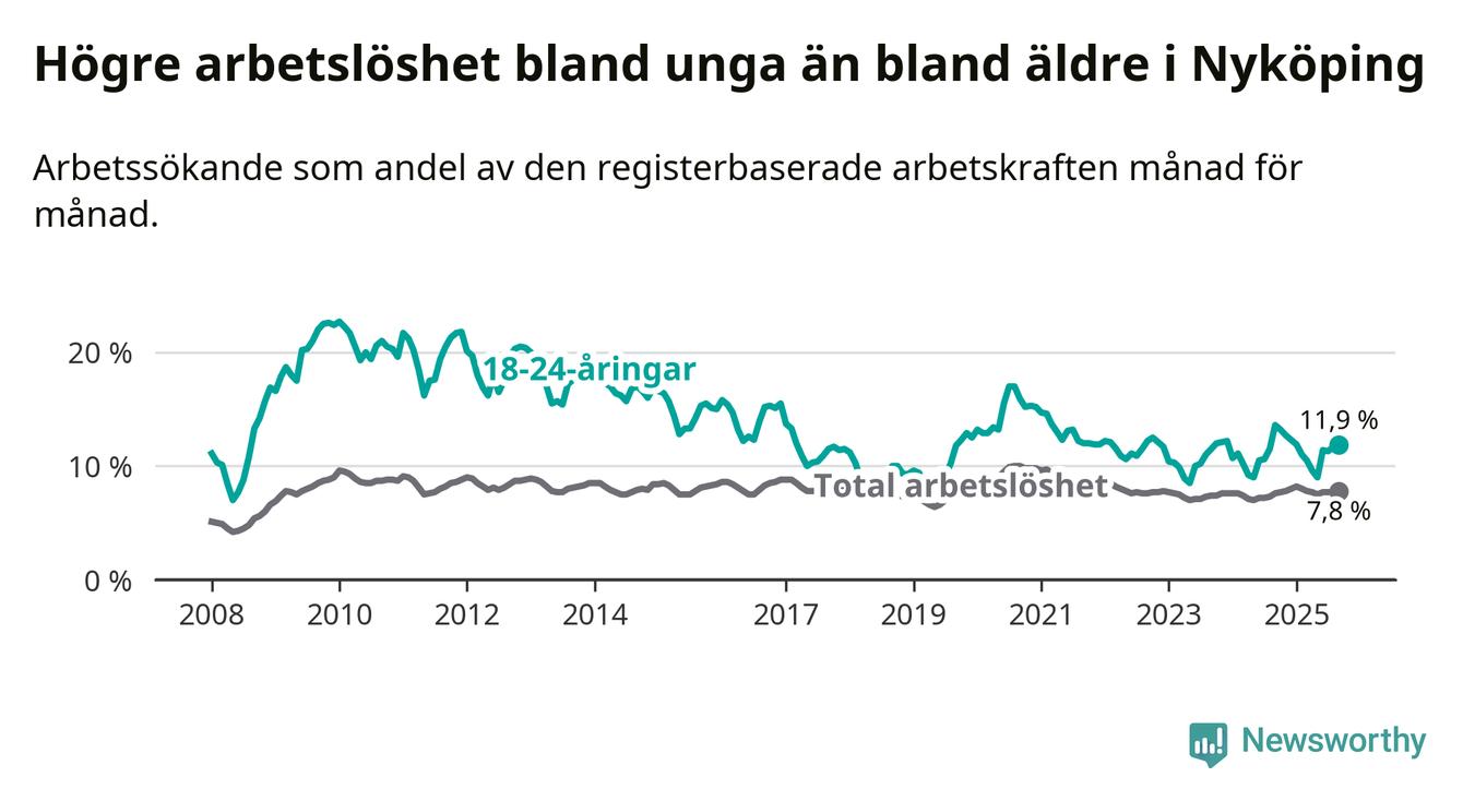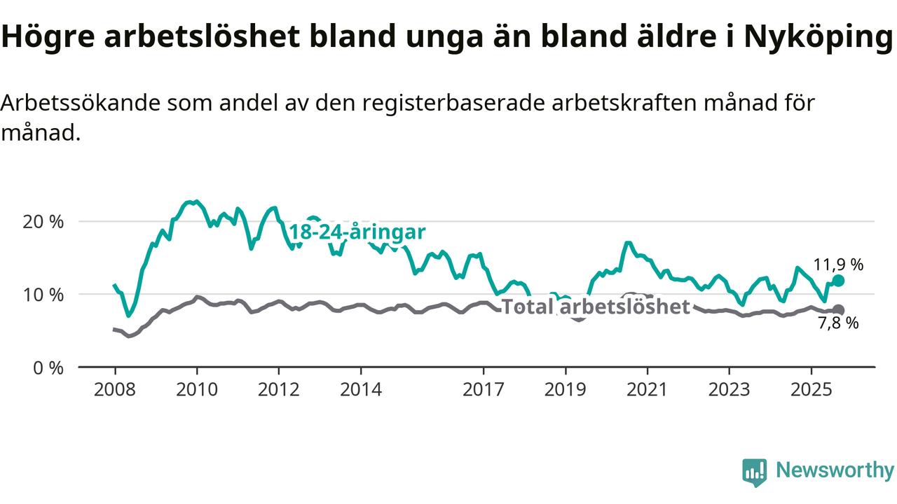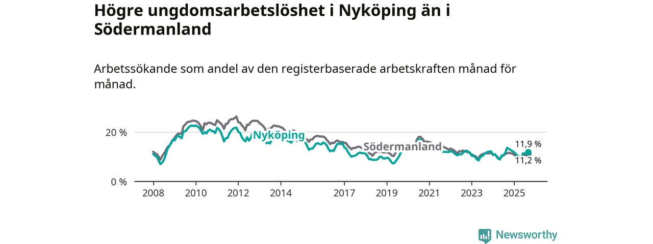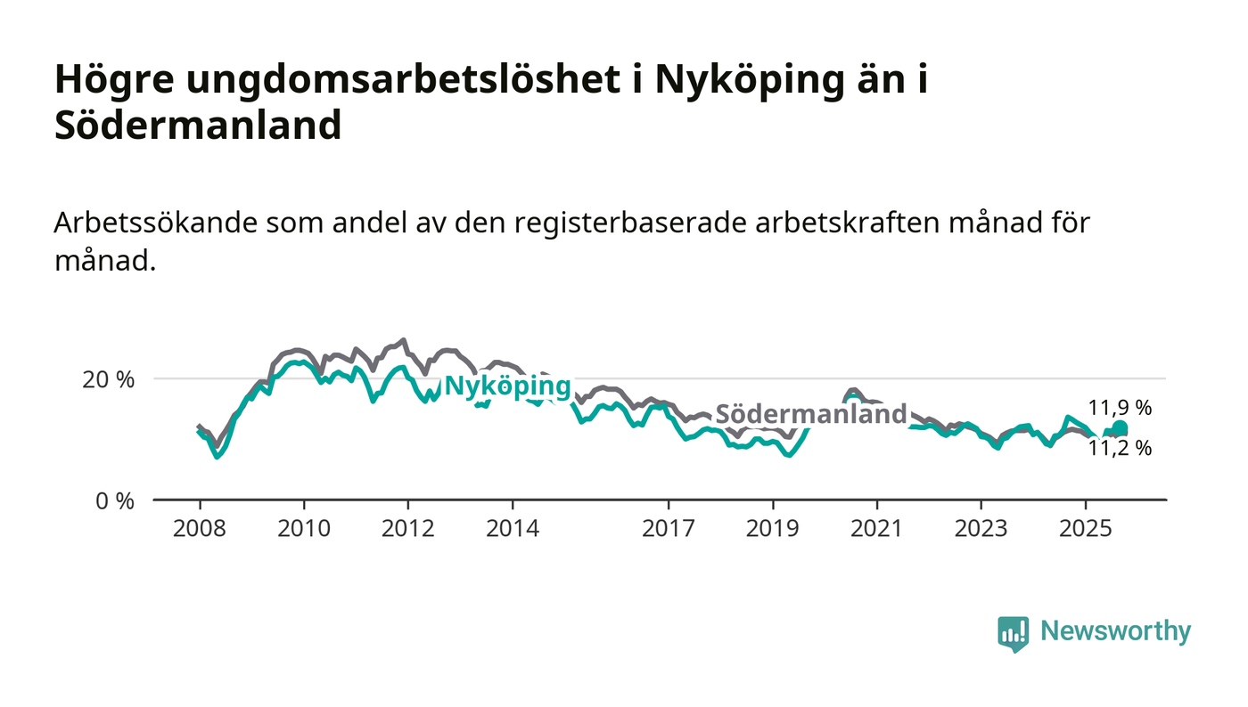 Medan Nyköping har lägre total arbetslöshet än Södermanland, ligger ungdomsarbetslösheten 0,7 procentenheter högre i Nyköping.