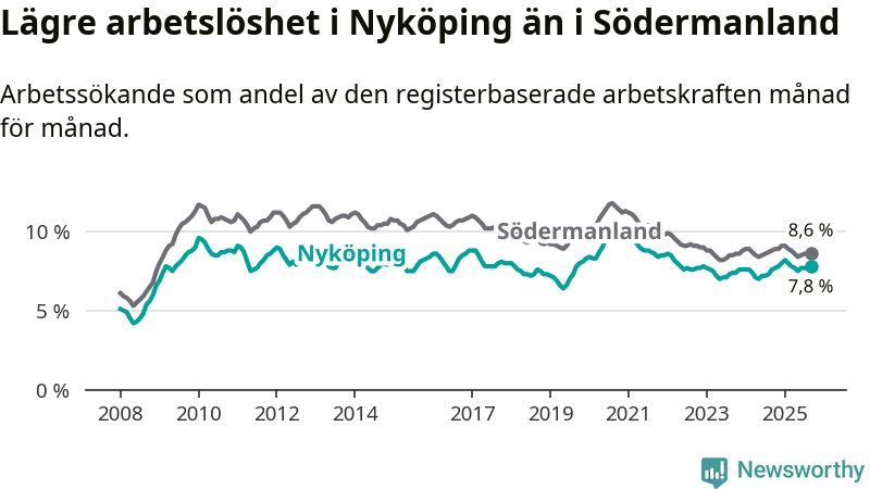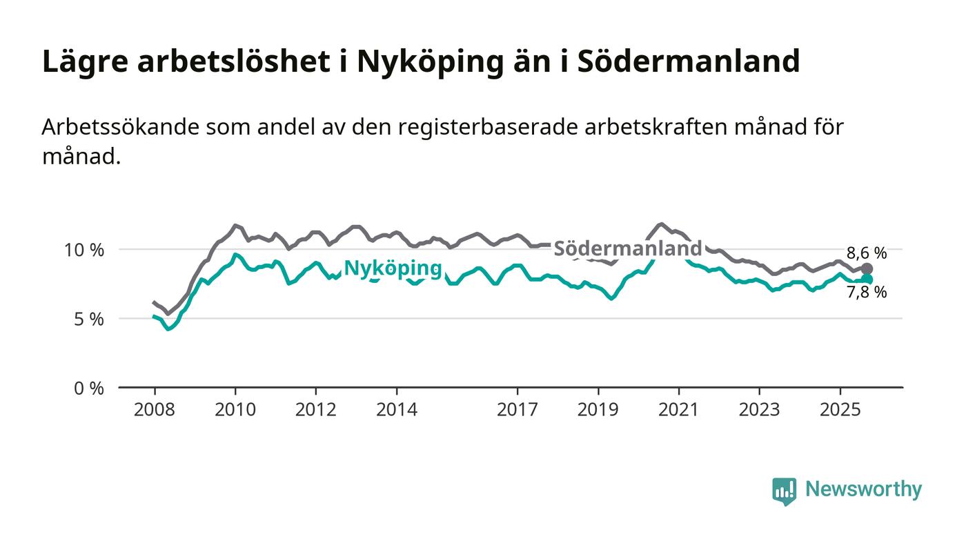 Även om arbetslösheten i Nyköping alltså ökar, så ligger den fortfarande under snittet i hela Södermanlands län (7,8 procent i kommunen, jämfört med 8,6 procent i hela länet). Trosa har den lägsta arbetslösheten i länet (3,8 procent), medan Eskilstuna har den högsta (10,9 procent). För att Nyköping skulle komma ner i samma arbetslöshetsnivå som Trosa skulle 1 100 personer behöva sysselsättas.