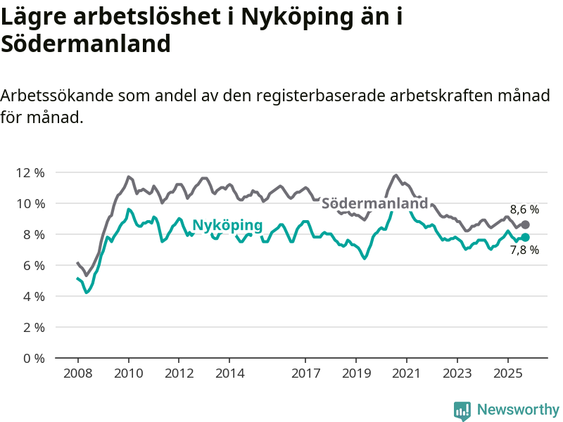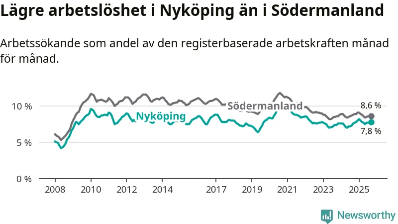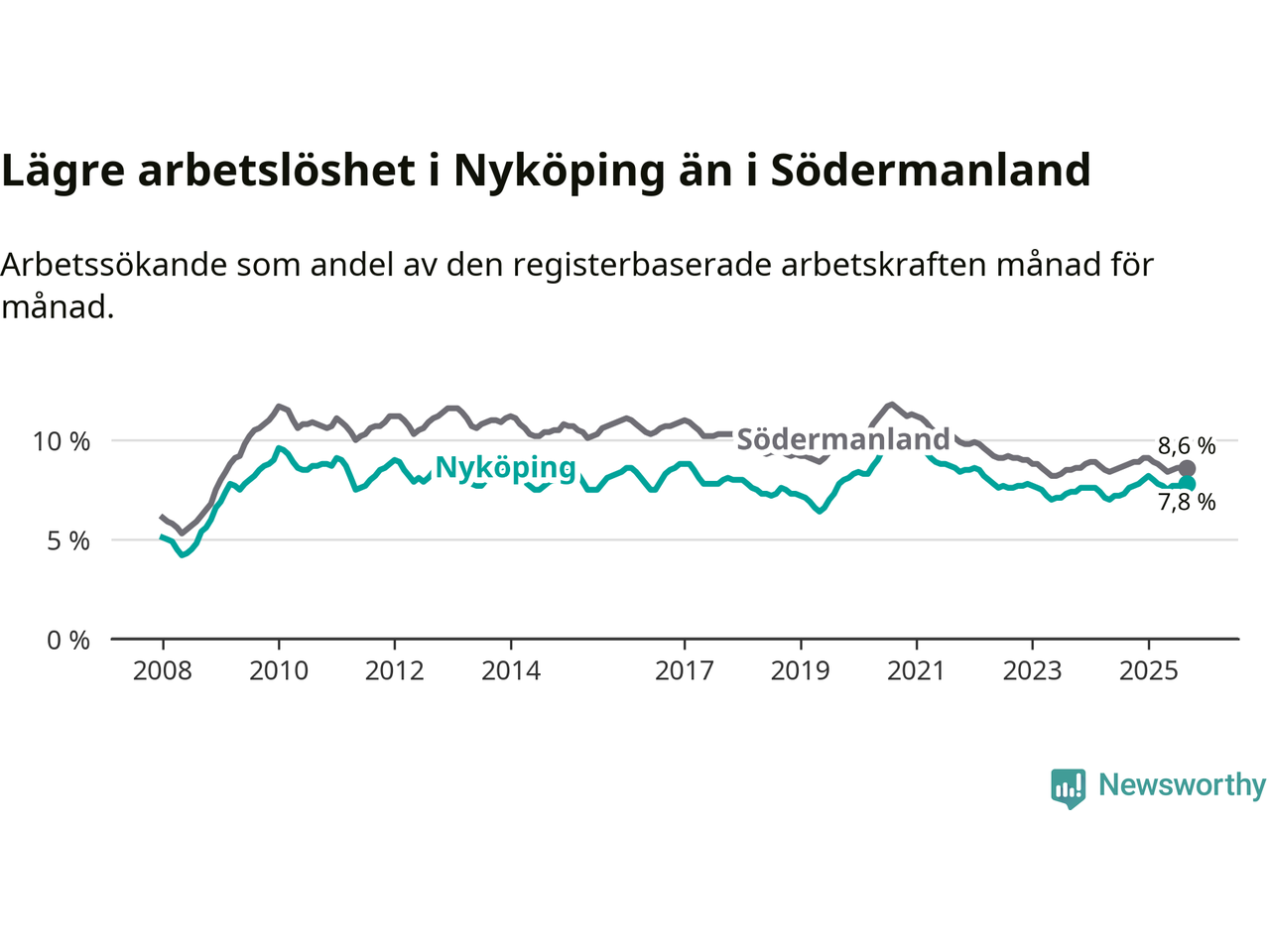 Under september månad rapporterade Nyköpings kommun en total arbetslöshet på 7,8 procent. Det är en ökning jämfört med samma tidpunkt i fjol (+0,2 procentenheter). I Södermanlands län däremot sjunker arbetslösheten .