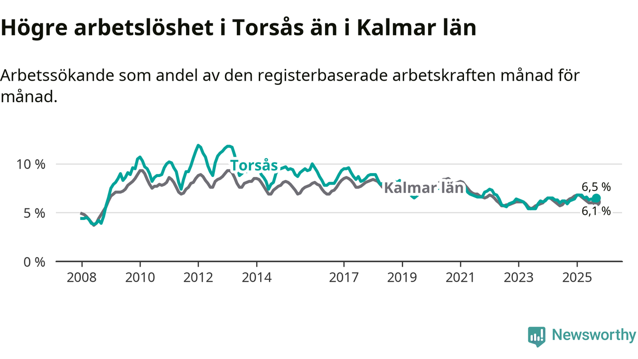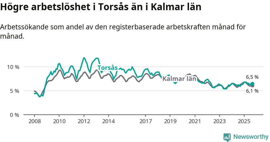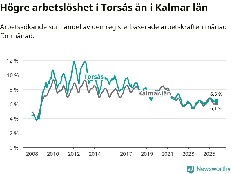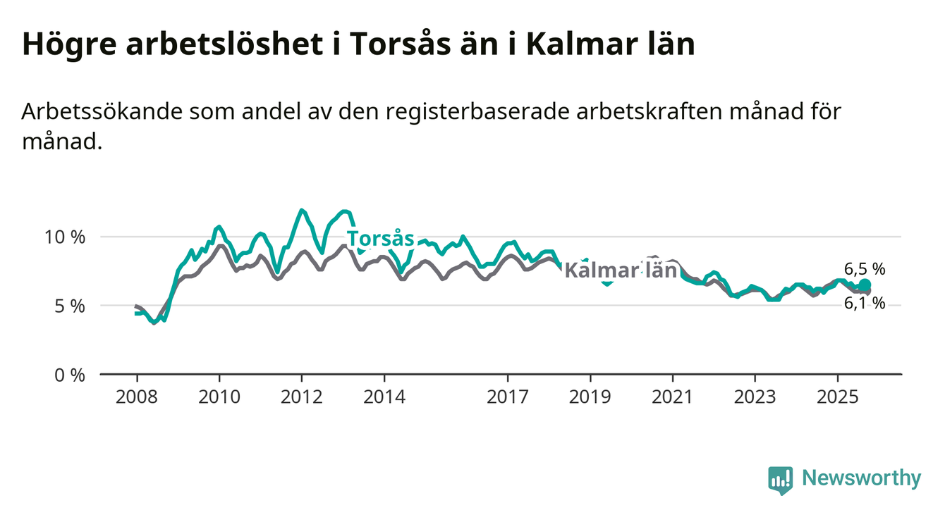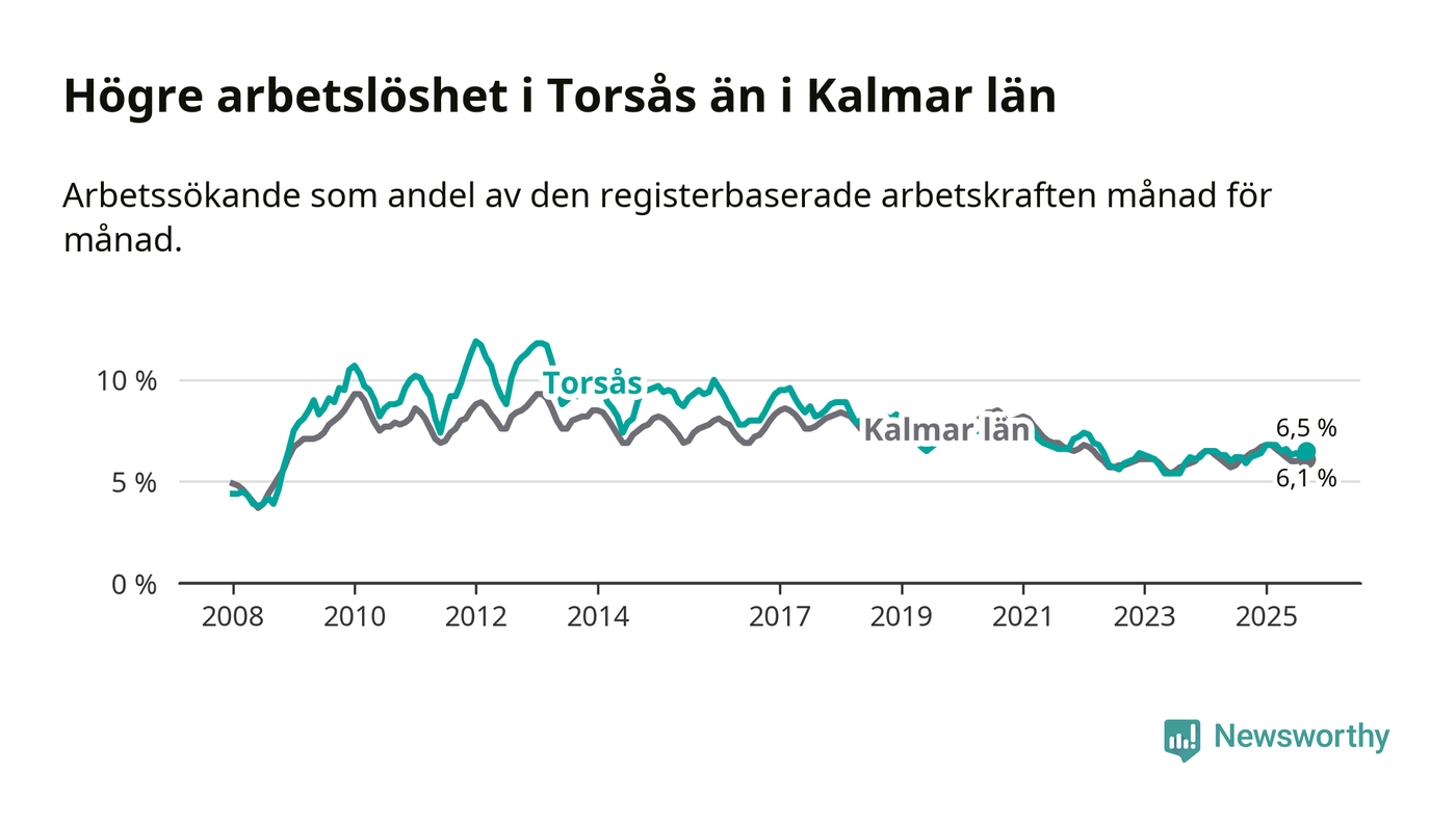 Under september månad rapporterade Torsås kommun en total arbetslöshet på 6,5 procent. Det är en ökning jämfört med samma tidpunkt i fjol (+0,6 procentenheter). I Kalmar län däremot sjunker arbetslösheten något.